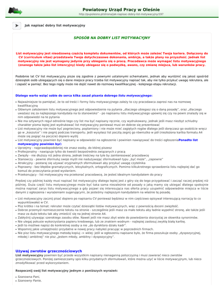 Powiatowy Urząd Pracy w Oleśnie http://pupolesno.pl/strona/jak-napisac-dobry-list-motywacyjny/197 Jak napisać dobry list motywacyjny SPOSÓB NA DOBRY LIST MOTYWACYJNY List motywacyjny jest nieodzowną częścią kompletu dokumentów, od których może zależeć Twoja kariera. Dołączony do CV (curriculum vitae) przedstawia Twoje dotychczasowe dokonania, ambicje, a także plany na przyszłość. Jednak list motywacyjny nie jest wymagany jedynie przy ubieganiu się o pracę. Pracodawca może wymagać listu motywacyjnego (znanego także jako list intencyjny) kiedy ubiegasz się o podwyżkę, awans, czy zmianę miejsca, lub warunków pracy. Podobnie lat CV list motywacyjny pisze się zgodnie z pewnymi ustalonymi schematami, jednak aby wyróżnić się jakoś spośród dziesiątek osób ubiegających się o dane miejsce pracy trzeba list motywacyjny napisać tak, aby nie tylko przykuć uwagę rekrutera, ale i zapaść w pamięć. Bez tego nigdy może nie dojść nawet do rozmowy kwalifikacyjnej - kolejnego etapu rekrutacji. Dlatego warto wziąć sobie do serca kilka zasad pisania dobrego listu motywacyjnego: ● ● ● ● ● ● ● ● ● ● ● ● Najważniejsze to pamiętać, że to od treści i formy listu motywacyjnego zależy to czy pracodawca zaprosi nas na rozmowę kwalifikacyjną Głównym założeniem listu motywacyjnego jest odpowiedzenie na pytania „dlaczego ubiegasz się o daną posadę”, oraz „dlaczego uważasz się za najlepszego kandydata na to stanowisko” - po napisaniu listu motywacyjnego upewnij się czy na pewni znalazły się w nim odpowiedzi na te pytania Nie ma sztywnych reguł odnośnie tego czy list ma być napisany ręcznie, czy wydrukowany, jednak jeśli masz niezbyt schludny charakter pisma lepiej jest wydrukować list motywacyjny ponieważ musi on dobrze się prezentować List motywacyjny nie może być pognieciony, poplamiony i nie może mieć zagiętych rogów dlatego jeśli doręczasz go osobiście wręcz go w „koszulce” i nie pognij podczas transportu. Jeśli wysyłasz list pocztą zegnij go równiutko w pół (niezłożona kartka formatu A4 może się pogiąć na poczcie) dopiero wyślij List motywacyjny powinien być napisany w odpowiedzi na ogłoszenie i powinien nawiązywać do treści ogłoszeniaPonadto list motywacyjny powinien być: Uprzejmy - najprawdopodobniej nie znasz osoby, do której piszesz Profesjonalny - nawiązuje tylko do kwestii bezpośrednio związanych z pracą Zwięzły - nie dłuższy niż jedna strona, jednak treściwy na tyle by zainteresować pracodawcę Stanowczy - pewnie sformułuj swoje myśli nie nadużywając sformułowań typu „być może”, „zapewne” Atrakcyjny - postaraj się używać oryginalnych sformułowań aby przykuć uwagę czytelnika Poprawny - bez błędów gramatycznych, leksykalnych, ortograficznych. Pomimo kilkukrotnego sprawdzenia listu najlepiej dać go komuś do przeczytania przed wysłaniem. Przekonujący - list motywacyjny ma przekonać pracodawcę, że jesteś idealnym kandydatem do pracy Prędzej czy później każdy musi napisać list motywacyjny dlatego lepiej jest z góry się do tego przygotować i zacząć raczej prędzej niż później. Duża część listu motywacyjnego może być taka sama niezależnie od posady o jaką mamy się ubiegać dlatego spokojnie można napisać zarys listu motywacyjnego a gdy pojawi się interesująca nas oferta pracy uzupełnić odpowiednie miejsca w liście danymi z ogłoszenia i wyrażeniami sugerującymi, że jesteśmy najlepszym kandydatem na właśnie tę posadę. ● ● ● ● ● ● ● ● List motywacyjny zacznij pisać dopiero po napisaniu CV ponieważ będziesz w nim częściowo opisywał interesującą narracją to co wypunktowałeś w CV. Pisz krótko i na temat: rekruter może czytać dziesiątki listów motywacyjnych, więc z pewnością doceni zwięzłość. Dobrze przemyśl rozmieszczenie tekstu na stronie - szczególnie jeśli masz za mało tekstu aby ładnie wypełnić stronę, ale także jeśli masz za dużo tekstu tak aby zmieścić się na jednej stronie A4. Zabłyśnij używając szerokiego zasobu słów. Nawet jeśli nie masz zbyt wiele do powiedzenia skorzystaj ze słownika synonimów. Nie ulegaj pokusie wykorzystania papieru kredowego, lub ze znakiem wodnym - najlepiej zastosuj zwykłą białą kartkę. Jeśli to możliwe napisz do konkretnej osoby a nie „do dyrektora działu kadr”. Wspomnij jakie umiejętności przydatne w nowej pracy nabyłeś pracując w poprzednich firmach. Nie pisz listu motywacyjnego metodą kopiuj -> wklej: jeśli w ogłoszeniu napisane było, że firma poszukuje osoby „dyspozycyjnej, młodej i ambitnej” nie pisz „jestem młody, ambitny i dyspozycyjny”. Używaj zwrotów grzecznościowych List motywacyjny powinien być przede wszystkim napisany nienaganną polszczyzną i musi zawierać nieco zwrotów grzecznościowych. Poniżej zamieszczamy spis kilku przydatnych sformułowań, które można użyć w liście motywacyjnym, lub nieco zmodyfikować przed wykorzystaniem. Rozpocznij swój list motywacyjny jednym z poniższych wyrażeń: ● ● Szanowna Pani, Szanowny Panie, ● Szanowni Państwo, Na pewno zrobisz lepsze wrażenie jeśli zaadresujesz list motywacyjny do konkretnej osoby. Postaraj się więc dowiedzieć do kogo skierować taki list. Informacje takie możesz uzyskać dzwoniąc anonimowo do firmy, lub poszukać odpowiednich danych w internecie. Wyrażenia przydatne do ‚rozwinięcia’ listu motywacyjnego: ● ● ● ● ● W związku z Państwa ogłoszeniem... W odpowiedzi na ogłoszenie zamieszczone w ... dnia... W nawiązaniu do rozmowy z dnia... W odpowiedzi na Państwa ogłoszenie, które ukazało się w .... W związku z ogłoszeniem zamieszczonym w ... chciałbym zgłosić swoją kandydaturę na stanowisko... ● chciałbym wyrazić swoje zainteresowanie ofertą pracy w Państwa firmie. ● ... chciałbym zgłosić swoją ofertę pracy na stanowisku. ● ... pra
