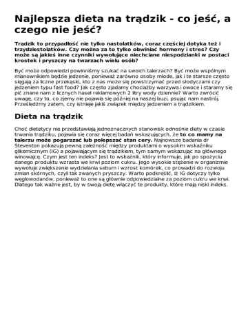 Najlepsza dieta na trądzik - co jeść, a czego nie jeść? Trądzik to przypadłość nie tylko nastolatków, coraz częściej dotyka też i trzydziestolatków. Czy można za to tylko obwiniać hormony i stres? Czy może są jakieś inne czynniki wywołujące niechciane niespodzianki w postaci krostek i pryszczy na twarzach wielu osób? Być może odpowiedzi powinniśmy szukać na swoich talerzach? Być może wspólnym mianownikiem będzie jedzenie, ponieważ zarówno osoby młode, jak i te starsze często sięgają za liczne przekąski, kto z nas może się powstrzymać przed słodyczami czy jedzeniem typu fast food? Jak często zjadamy chociażby warzywa i owoce i staramy się pić znane nam z licznych haseł reklamowych 2 litry wody dziennie? Warto zwrócić uwagę, czy to, co zjemy nie pojawia się później na naszej buzi, psując nam nastrój. Prześledźmy zatem, czy istnieje jakiś związek między jedzeniem a trądzikiem. Dieta na trądzik Choć dietetycy nie przedstawiają jednoznacznych stanowisk odnośnie diety w czasie trwania trądziku, pojawia się coraz więcej badań wskazujących, że to co mamy na talerzu może pogarszać lub polepszać stan cery. Najnowsze badania dr Steventon pokazują pewną zależność między produktami o wysokim wskaźniku glikemicznym (IG) a pojawiającym się trądzikiem, tym samym wskazując na głównego winowajcę. Czym jest ten indeks? Jest to wskaźnik, który informuje, jak po spożyciu danego produktu wzrasta we krwi poziom cukru. Jego wysokie stężenie w organizmie wywołuje zwiększenie wydzielania sebum i wzrost komórek, co prowadzi do rozwoju zmian skórnych, czyli tak zwanych pryszczy. Warto podkreślić, iż IG dotyczy tylko węglowodanów, ponieważ to one są głównie odpowiedzialne za poziom cukru we krwi. Dlatego tak ważne jest, by w swoją dietę włączyć te produkty, które mają niski indeks. Witamina zawarta w marchwi jest ważne dla utrzymania równowagi i pięknej cery. Okazuje się także, że ta choroba skóry jest związana ściśle z krajami zachodnimi. Badania przeprowadzone na populacjach zamieszkałych takie rejony jak Kenia, Papua Nowa Gwinea, Zambii wskazują na znacznie mniejsze występowanie tej przypadłości niż jest to widoczne w krajach zachodnich. Co ciekawe, gdy ludzie z badanych rejonów zaczynali wprowadzać do jadłospisu produkty wysoce przetworzone tak bardzo popularne w naszych rejonach, problem skórny się pojawiał i wraz z zwiększoną częstotliwością spożywanych posiłków nasilał się. Czynnikami, które uważa się, że wpływają na trądzik są m. in. stres, hormony, palenie tytoniu, picie alkoholu czy w końcu dieta. Dieta u osób z trądzikiem jest rygorystyczna i wymaga rezygnacji z wielu produktów, tak wielce przez większość lubianych. Przyjrzyjmy się na początku produktom, które sprzyjają nam w walce z tym problemem. Co jeść na trądzik? Przede wszystkim warzywa czy owoce bogate w miedź, cynk, które ułatwiają gojenie się ran czy witaminę A, tak ważne dla utrzymania równowagi i pięknej cery. Te ważne składniki znajdziemy w marchwi, pomidorach, brokułach czy kalafiorze; wiśniach, kiściach winogron czy śliwkach. Beta – karoten zawarty w witaminie A powoduje także wzmocnienie skóry. Niski indeks glikemiczny, o którym wspominaliśmy wcześniej, mają pełnoziarniste pieczywo oraz kasze. Spokojnie można sięgnąć i wypróbować chleb gryczany, makarony pełnoziarniste i razowe. Włączyć w swój jadłospis kasze gryczaną czy jęczmienną, które są bogate w składniki odżywcze. Ponadto zawierają ważną i cenną dla skóry witaminę B6, która sprzyja zmniejszaniu się zmian łojotokowych. Warto pamiętać o roślinach strączkowych, takich, jak: soczewica, soja, groch czy fasola, które zawierają sporo witaminy B. Produkty z tej grupy witamin, ale także witamina PP zawarta w orzechach, pestkach, wątróbce, drobiu, jajkach czy drożdżach łagodzą objawy trądziku. Nie można zapomnieć o nawadnianiu organizmu od wewnątrz. Dzienne średnie zapotrzebowanie człowieka na płyny wynosi 2 litry. Należy jednak pamiętać, że picie herbaty i kawy ma działanie silnie moczopędne co powoduje wypłukiwanie z organizmu najważniejszych składników. Istotne jest więc, by pić soki, herbatki ziołowe i wodę w ciągu dnia. Czego nie jeść? Nie należy jeść produktów o wysokim IG, pić niektórych napojów, trzeba zrezygnować z palenia tytoniu i picia alkoholu. Zawarte w nich barwniki, aromaty i syntetyczne związki tylko pogarszają stan cery. Jeśli borykamy się z problemami skórnymi, zrezygnować trzeba z takich produktów, jak: słodycze, białe pieczywo czy biały ryż. Należy uważać na suszone daktyle, niektóre warzywa, jak ziemniaki czy dynia. Warto ograniczyć tłuszcze zwierzęce, czyli tłuste mięsa i wędliny; smalec, słoninę, tłuste sosy, majonezy, zasmażki. Podsumowując, dieta na trądzik tak naprawdę nie różni się od innych diet nawołujących do zdrowego odżywania się. Kładzie nacisk na świeże i nieprzetworzone produkty o dobrej jakości. Jadłospis powinien być wzbogacony o warzywa i owoce, pełnoziarniste pieczywo i kasze. Słodycze, kolorowe napoje, alkohol i tytoń nie są sprzymierzeńcami w walce o gładką skórę i powinny zostać wyeliminowane z codziennych nawyków żywieniowych. Należy w przestrzeganiu diety być konsekwentnym i pamiętać, że efekty nie pojawią się następnego dnia. Warto jednak się z nią zaprzyjaźnić, bo da na pewno zadowalające efekty w walce ze szczupłą sylwetką. I na sam koniec, osoby, u których występuje trądzik powinny mieć świadomość, iż dieta może złagodzić objawy trądziku, lecz ich zupełnie nie wyeliminuje. Kup dietę już teraz ! Analiza dietetyczna GRATIS ! Opieka dietetyka, psychologa i trenera GRATIS ! 30 treningów video GRATIS ! Author: Magdalena Mirta Link do artykułu: http://bonavita.pl/najlepsza-dieta-na-tradzik-co-jesc-a-czego-ni
