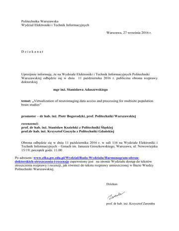 Politechnika Warszawska Wydział Elektroniki i Technik Informacyjnych Warszawa, 27 września 2016 r. Dziekanat Uprzejmie informuję, że na Wydziale Elektroniki i Technik Informacyjnych Politechniki Warszawskiej odbędzie się w dniu 11 października 2016 r. publiczna obrona rozprawy doktorskiej mgr inż. Stanisława Adaszewskiego temat: „Virtualization of neuroimaging data access and processing for multisite population brain studies” promotor – dr hab. inż. Piotr Bogorodzki, prof. Politechniki Warszawskiej recenzenci: prof. dr hab. inż. Stanisław Kozielski z Politechniki Śląskiej prof.dr hab. inż. Krzysztof Goczyła z Politechniki Gdańskiej Obrona odbędzie się w dniu 11 października 2016 r. w sali 116 na Wydziale Elektroniki i Technik Informacyjnych – Gmach im. Janusza Groszkowskiego, Warszawa, ul. Nowowiejska 15/19; początek godz. 11.00 . Po adresem: www.elka.pw.edu.pl/Wydzial/Rada-Wydzialu/Harmonogram-obrondoktorskich-streszczenia-i-recenzje zapewniony jest na stronie Wydziału dostęp do tekstów streszczenia rozprawy i recenzji, jak również do tekstu rozprawy umieszczonej w Bazie Wiedzy Politechniki Warszawskiej. Dziekan prof. dr hab. inż. Krzysztof Zaremba Rodzaj pracy: rozprawa doktorska Autor - mgr inż. Stanisław Adaszewski Promotor – dr hab. inż. Piotr Bogorodzki, prof. Politechniki Warszawskiej Tytuł rozprawy:”Virtualization of neuroimaging data access and processing for multisite population brain studies” Streszczenie Metody diagnostyki obrazowej stwarzają unikalną możliwość identyfikacji i badania wybranychprocesów neuronalnych w żywym mózgu człowieka. Zastosowanie wieloośrodkowych badań obrazowych w połączeniu z nowoczesnymi technologiami informatycznymi, pozwalającymi na gromadzenie i eksploracją rozproszonych zbiorów danych, otwierają drogę dla badań populacyjnych o charakterze podstawowym jak i poszukiwania biomarkerów ekspresji zmian chorobowych. Niniejsza praca dotyczy zagadnienia wirtualizacji danych w kontekście wieloośrodkowych badań obrazowych. Zawiera ona tezę o cechach niezbędnych do realizacji analiz tego typów zbiorów danych z użyciem systemów bazodanowych oraz przedstawia nową modelową implementację części takiej architektury nazwaną przez autora WEIRDB (od ang. słów Wide, External, Imaging, Research, DataBase). WEIRDB realizuje mechanizm dostępu do danych o dowolnym rozmiarze w ich oryginalnej postaci bez potrzeby wczytywania i synchronizacji z systemem bazodanowym, z pominięciem komunikacji strumieniowej klient/serwer oraz formułowanie zapytań w języku SQL. Porównanie wydajności WEIRDB z istniejących rozwiązaniami pod kątem obsługi danych zewnętrznych oraz prędkości wykonywania zapytań wykazało wzrost wydajności od 2 do 200 razy w stosunku do pozostałych baz danych. W dalszym toku pracy omówione zostały dotychczasowe zastosowania praktyczne proponowanego oprogramowania, a powyższe spostrzeżenia zostały poddane dyskusji pod kątem wcześniejszych przewidywań oraz celów przyszłych badań i rozwoju. Abstract Diagnostic imaging methods create a unique possibility for identification and in-vivo studies of selected neuronal processes in human brain. Multisite imaging studies in collaboration with modern information technologies allow to acquire and explore distributed datasets, creating the opportunity for population brain studies as well as research of expression biomarkers in disease-modulated changes. This work concerns uses of Data Virtualization techniques in multisite neuroimaging studies and presents a new model implementation of such architecture called WEIRDB (acronym for: Wide, External, Imaging, Research, DataBase). WEIRDB implements a mechanism of arbitrary-sized data access in their source form without the necessity for import procedure or synchronization with the database system. Furthermore, it demonstrates means of improving performance by eliminating streaming client/server communication and allows for formulating queries in SQL. A comparison of WEIRDB's efficiency against existing solutions is presented with respect to external data handling capabilities and query execution speed showing from 2 to 200 times improvement over prior art. Subsequently this work lists current practical applications of the proposed architecture followed by discussion of the above observations with emphasis on expectations, goals and future research. Prof. dr hab. inż. Stanisław Kozielski Instytut Informatyki Politechniki Śląskiej Gliwice, 17.08.2016 KWESTIONARIUSZ - RECENZJA ROZPRAWY DOKTORSKIE J DLA RADY WYDZIAŁU ELEKTRONIKI I TECHNIK INFORMACYJNYCH POLITECHNIKI WARSZAWSKIEJ Tytuł rozprawy: Virtualization of neuroimaging data access and processing for multisite population brain studies Autor rozprawy: Stanisław Adaszewski 1. Jakie zagadnienie naukowe jest rozpatrzone w pracy /teza rozprawy/ i czy zostało ono dostatecznie jasno sformułowane przez autora? Jaki charakter ma rozprawa (teoretyczny, doświadczalny, inny)? Praca dotyczy problemów przetwarzania dużych zbiorów danych powstających w projektach badań ludzkiego mózgu, w szczególności neuroobrazowania, realizowanych w kilku ośrodkach badawczych na świecie. Autor zwrócił uwagę na ten obszar badawczy ze względu na wyróżniające cechy powstających tam danych: zbiory o bardzo dużych objętościach, dane o bardzo zróżnicowanych cechach (typach), rozmieszczenie danych w wielu ośrodkach. Od lat 60-tych ubiegłego wieku dane przetwarzane w systemach komputerowych najczęściej gromadzone były (i są nadal) w bazach danych. Systemy zarządzania bazami danych (SZBD) są złożonymi systemami programowymi udostępniającymi bogate zestawy narzędzi operujących na danych i gwarantujące wysoki poziom bezpieczeństwa w trakcie przechowywania i przetwarzania danych. Jednakże dane powstające w badaniach neurologicznych istotnie różnią się (m.in. w zakresie typów oraz organizacji i rozmiarów zbior