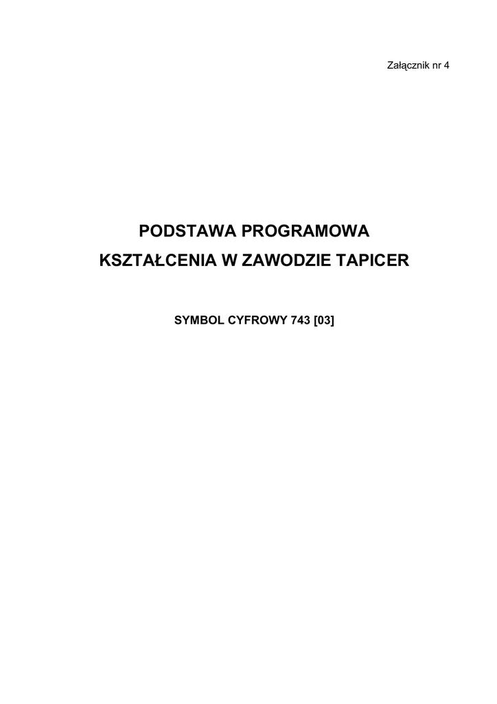 Załącznik nr 4 PODSTAWA PROGRAMOWA KSZTAŁCENIA W ZAWODZIE TAPICER SYMBOL CYFROWY 743 [03] I. OPIS ZAWODU 1. W wyniku kształcenia w zawodzie absolwent powinien umieć: 1) czytać oraz sporządzać rysunki techniczne i szkice z zakresu tapicerstwa; 2) posługiwać się dokumentacją konstrukcyjną i technologiczną; 3) korzystać z literatury technicznej, norm i innych źródeł informacji; 4) określać i stosować zasady konstrukcji, funkcjonalności i estetyki wyrobów; 5) rozróŜniać style i typy konstrukcji mebli tapicerowanych; 6) organizować stanowisko pracy zgodnie z wymaganiami ergonomii; 7) dobierać materiały i półfabrykaty do wykonania określonych typów mebli, sprzętów i wnętrz; 8) oceniać jakość materiałów i półfabrykatów, rozpoznawać i eliminować wady; zapotrzebowanie 9) obliczać materiałowe na podstawie konstrukcyjnej i technologicznej dokumentacji wyrobu; 10) określać zasady składowania oraz warunki magazynowania materiałów i półfabrykatów; 11) dobierać i stosować narzędzia do określonych operacji technologicznych; 12) obsługiwać i wykonywać konserwacje maszyn i urządzeń stosowanych w tapicerstwie; 13) przygotowywać materiały i półfabrykaty tapicerskie do montaŜu; 14) wykonywać operacje szycia ręcznego i maszynowego; 15) wykonywać i montować części tapicerowane róŜnych typów konstrukcji mebli; 16) wykonywać i montować części tapicerowane wyposaŜenia środków transportu; 17) wykonywać i montować części tapicerowane sprzętu sportowego, turystycznego i medycznego; 18) wykonywać pomocnicze prace stolarskie i ślusarskie w procesie technologicznym wyrobów tapicerowanych; 19) wykonywać prace dekoracyjno-tapicerskie związane z wyposaŜeniem wnętrz; 20) rozpoznawać i eliminować błędy produkcyjne; 21) stosować róŜne metody oceny jakości mebli i innych wyrobów tapicerowanych; 22) dokonywać napraw, renowacji i rekonstrukcji wyrobów; 23) sporządzać kosztorysy prac tapicerskich; 24) stosować zasady pakowania, magazynowania i transportu wyrobów; 1 25) wykorzystywać w sposób racjonalny materiały, narzędzia, maszyny, urządzenia i energię w procesie pracy; 26) sporządzać dokumentację produkcyjną; 27) stosować przepisy prawa w zakresie wykonywanych zadań zawodowych; 28) przestrzegać przepisów bezpieczeństwa i higieny pracy, przepisów ochrony przeciwpoŜarowej oraz ochrony środowiska; 29) organizować stanowisko pracy zgodnie z wymaganiami ergonomii; 30) komunikować się z uczestnikami procesu pracy; 31) stosować przepisy Kodeksu pracy dotyczące praw i obowiązków pracownika i pracodawcy; 32) udzielać pierwszej pomocy poszkodowanym w wypadkach przy pracy; 33) korzystać z róŜnych źródeł informacji oraz doradztwa specjalistycznego; 34) planować działalność gospodarczą. Kształtowanie postaw przedsiębiorczych oraz przygotowanie do wejścia na rynek pracy powinno przebiegać zarówno w trakcie kształcenia zawodowego, jak i podczas realizacji zajęć edukacyjnych „Podstawy przedsiębiorczości”. 2. Absolwent szkoły kształcącej w zawodzie tapicer powinien być przygotowany do wykonywania następujących zadań zawodowych: 1) tapicerowanie mebli o róŜnym stopniu złoŜoności konstrukcyjnej części tapicerowanych; 2) tapicerowanie wyrobów i elementów wyposaŜenia środków transportu; 3) wykonywanie części tapicerowanych sprzętu sportowego, turystycznego i medycznego; 4) wykonywanie prac dekoratorsko-tapicerskich związanych z wyposaŜeniem wnętrz; 5) naprawa, renowacja i rekonstrukcja części tapicerowanych mebli, środków transportu, sprzętu sportowego, turystycznego i medycznego. 2 II. BLOKI PROGRAMOWE Zakres umiejętności i treści kształcenia, wynikający z opisu zawodu, zawierają następujące bloki programowe: 1) materiałowo – techniczny; 2) technologiczny; 3) podstawy działalności zawodowej. BLOK: MATERIAŁOWO – TECHNICZNY 1. Cele kształcenia Uczeń (słuchacz) w wyniku kształcenia powinien umieć: 1) stosować ogólne zasady wykonywania rysunków technicznych; 2) stosować zasady rzutowania, wymiarowania oraz wykonywania widoków, przekrojów i kładów; 3) czytać i wykonywać rysunki techniczne wyrobów, podzespołów i elementów; 4) czytać i stosować uproszczenia rysunkowe; 5) sporządzać szkice wyrobów, podzespołów i elementów; 6) stosować zasady kolorystyki; 7) określać rolę i znaczenie normalizacji w rysunku zawodowym; 8) wykonywać rysunki przestrzenne; 9) stosować oznaczenia graficzne materiałów; 10) sporządzać opisy techniczne; 11) określać warunki wykonania tapicerowanych części wyrobów; 12) określać czynniki wpływające na konstrukcję wyrobu; 13) stosować zasady funkcjonalności i estetyki wyrobu; 14) rozróŜniać style mebli tapicerowanych; 15) charakteryzować oraz klasyfikować materiały i półfabrykaty; 16) określać wymagania techniczne dla materiałów i półfabrykatów; 17) określać i stosować zasady prawidłowej gospodarki materiałami; 18) wykonywać pomiary, obliczać zapotrzebowanie materiałów podstawowych i pomocniczych; 19) dokonywać składowania materiałów i półfabrykatów według określonych zasad; 20) charakteryzować oraz klasyfikować narzędzia, maszyny i urządzenia; 21) określać zasady działania oraz przygotowania maszyn i narzędzi do pracy; 3 22) dobierać narzędzia do ręcznych i maszynowych prac tapicerskich; 23) rozróŜniać zespoły maszyn, urządzeń i narzędzi zmechanizowanych, określać ich przeznaczenie i zadania; 24) określać zasady przygotowania i mocowania narzędzi w zespołach roboczych; 25) dobierać maszyny i urządzenia do określonych operacji technologicznych; 26) dobierać parametry obróbcze; 27) posługiwać się terminologią z zakresu maszynoznawstwa; 28) oceniać stan techniczny maszyn, urządzeń i narzędzi; 29) określać stopień zuŜycia narzędzi roboczych; 30) kontrolować parametry pracy urządzeń, maszyn i narzędzi zmec