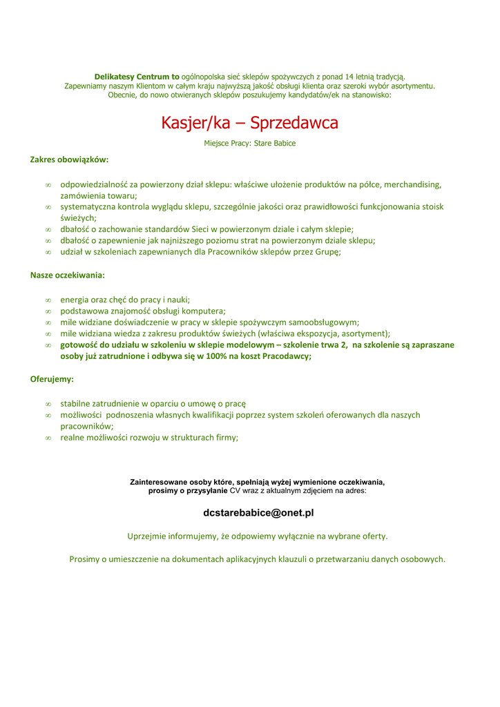 Delikatesy Centrum to ogólnopolska sieć sklepów spożywczych z ponad 14 letnią tradycją. Zapewniamy naszym Klientom w całym kraju najwyższą jakość obsługi klienta oraz szeroki wybór asortymentu. Obecnie, do nowo otwieranych sklepów poszukujemy kandydatów/ek na stanowisko: Kasjer/ka – Sprzedawca Miejsce Pracy: Stare Babice Zakres obowiązków: • • • • • odpowiedzialność za powierzony dział sklepu: właściwe ułożenie produktów na półce, merchandising, zamówienia towaru; systematyczna kontrola wyglądu sklepu, szczególnie jakości oraz prawidłowości funkcjonowania stoisk świeżych; dbałość o zachowanie standardów Sieci w powierzonym dziale i całym sklepie; dbałość o zapewnienie jak najniższego poziomu strat na powierzonym dziale sklepu; udział w szkoleniach zapewnianych dla Pracowników sklepów przez Grupę; Nasze oczekiwania: • • • • • energia oraz chęć do pracy i nauki; podstawowa znajomość obsługi komputera; mile widziane doświadczenie w pracy w sklepie spożywczym samoobsługowym; mile widziana wiedza z zakresu produktów świeżych (właściwa ekspozycja, asortyment); gotowość do udziału w szkoleniu w sklepie modelowym – szkolenie trwa 2, na szkolenie są zapraszane osoby już zatrudnione i odbywa się w 100% na koszt Pracodawcy; Oferujemy: • • • stabilne zatrudnienie w oparciu o umowę o pracę możliwości podnoszenia własnych kwalifikacji poprzez system szkoleń oferowanych dla naszych pracowników; realne możliwości rozwoju w strukturach firmy; Zainteresowane osoby które, spełniają wyżej wymienione oczekiwania, prosimy o przysyłanie CV wraz z aktualnym zdjęciem na adres: [email protected] Uprzejmie informujemy, że odpowiemy wyłącznie na wybrane oferty. Prosimy o umieszczenie na dokumentach aplikacyjnych klauzuli o przetwarzaniu danych osobowych. Delikatesy Centrum to ogólnopolska sieć sklepów spożywczych z ponad 14 letnią tradycją. Zapewniamy naszym Klientom w całym kraju najwyższą jakość obsługi klienta oraz szeroki wybór asortymentu. Obecnie, do nowo otwieranych sklepów poszukujemy kandydatów/ek na stanowisko: Kierownik Sklepu Miejsce pracy: Stare Babice Zakres obowiązków: • • • • • • • • zapewnienie sprawnego funkcjonowania sklepu zgodnie z standardami sieci Delikatesy Centrum zarządzanie zespołem podległych pracowników, szkolenie, wyznaczanie celów utrzymanie optymalnego stanu asortymentu oraz dbałość o ekspozycję towaru organizowanie inwentaryzacji i nadzór nad jej sprawnym przebiegiem dbanie i odpowiedzialność za realizację założonej dynamiki sprzedaży regularna analiza wyników finansowych sklepu i kluczowych wskaźników oraz podejmowanie działań w zakresie obszarów wymagających poprawy systematyczna kontrola wyglądu, jakości oraz funkcjonowania stoisk świeżych koordynacja akcji marketingowych na sklepie Nasze oczekiwania: • • • • • • • • doświadczenie w pracy w handlu w branży spożywczej min. 5 lat, w tym min. rok doświadczenia na stanowisku Kierownika Sklepu znajomość zagadnień związanych z zarządzaniem sklepem (zarządzanie kategoriami, zapasem, układanie grafików itp.) wiedza z zakresu zarządzania stoiskami świeżymi wysoko rozwinięte umiejętności interpersonalne, umożliwiające efektywne reprezentowanie firmy we współpracy z partnerami zewnętrznymi zdecydowanie i konsekwencja w działaniu umiejętność obsługi komputera wykształcenie minimum średnie gotowość do udziału w szkoleniu w sklepie modelowym – szkolenie trwa do 2 tygodni, na szkolenie są zapraszane osoby już zatrudnione i odbywa się w 100% na koszt Pracodawcy; • Oferujemy: • • • stabilne zatrudnienie w oparciu o umowę o pracę możliwości podnoszenia własnych kwalifikacji poprzez system szkoleń oferowanych dla naszych pracowników; realne możliwości rozwoju w strukturach firmy; Zainteresowane osoby które, spełniają wyżej wymienione oczekiwania, prosimy o przysyłanie CV wraz z aktualnym zdjęciem na adres: [email protected] Uprzejmie informujemy, że odpowiemy wyłącznie na wybrane oferty. Prosimy o umieszczenie na dokumentach aplikacyjnych klauzuli o przetwarzaniu danych osobowych. Delikatesy Centrum to ogólnopolska sieć sklepów spożywczych z ponad 14 letnią tradycją. Zapewniamy naszym Klientom w całym kraju najwyższą jakość obsługi klienta oraz szeroki wybór asortymentu. Obecnie, do nowo otwieranych sklepów poszukujemy kandydatów/ek na stanowisko: Kierownik/czka Stoiska Mięso - Wędliny Miejsce Pracy: Stare Babice Zakres obowiązków: • • • • • • zapewnienie sprawnego funkcjonowania stoiska, zgodnie ze standardami Sieci Delikatesy Centrum zarządzanie zespołem podległych pracowników, szkolenie, wyznaczanie celów utrzymanie optymalnego stanu asortymentu oraz dbałość o ekspozycję towaru uprzejma i zgodna ze standardami Sieci obsługa Klienta przy ladzie mięsno – wędliniarskiej odpowiedzialność za zapewnienie świeżości towaru oraz zachowanie wszelkich norm jakościowych wymaganych odpowiednimi przepisami prawa udział w szkoleniach zapewnianych dla Pracowników sklepów przez Grupę Nasze oczekiwania: • • • • • energia oraz chęć do pracy i nauki min. 2 letnie doświadczenie w pracy na stoisku mięso – wędliny doświadczenie w zarządzaniu zespołem pracowników wiedza z zakresu produktów świeżych (właściwa ekspozycja w ladzie, asortyment, zasady i normy przechowywania) gotowość do udziału w szkoleniu w sklepie modelowym – szkolenie trwa 2 tygodnie; na szkolenie są zapraszane osoby już zatrudnione i odbywa się w 100% na koszt Pracodawcy; Oferujemy: • • • stabilne zatrudnienie w oparciu o umowę o pracę możliwości podnoszenia własnych kwalifikacji poprzez system szkoleń oferowanych dla naszych pracowników realne możliwości rozwoju w strukturach firmy Zainteresowane osoby które, spełniają wyżej wymienione oczekiwan