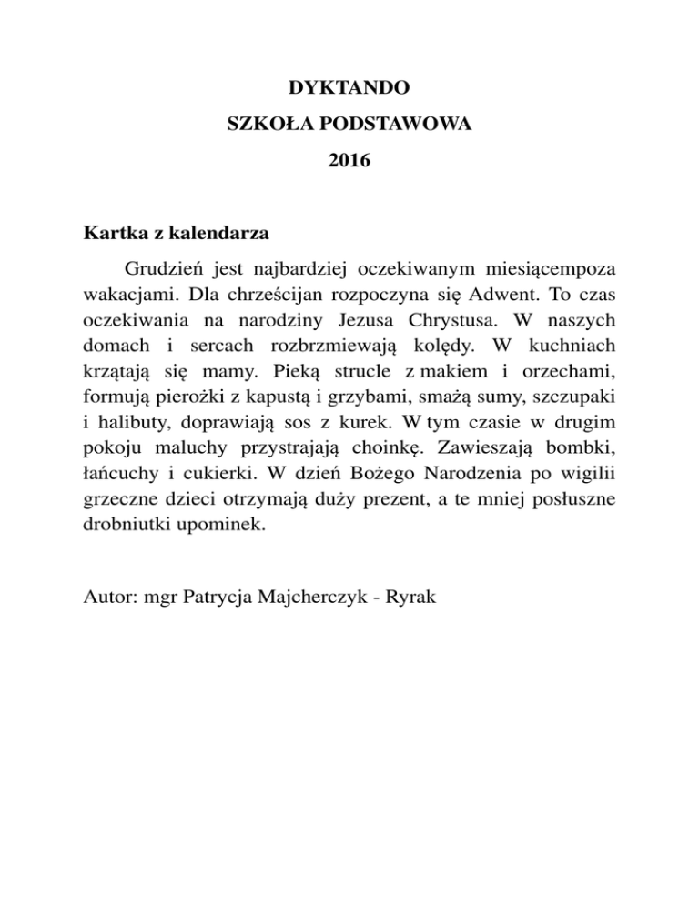 DYKTANDO SZKOŁA PODSTAWOWA 2016 Kartka z kalendarza Grudzień jest najbardziej oczekiwanym miesiącempoza wakacjami. Dla chrześcijan rozpoczyna się Adwent. To czas oczekiwania na narodziny Jezusa Chrystusa. W naszych domach i sercach rozbrzmiewają kolędy. W kuchniach krzątają się mamy. Pieką strucle z makiem i orzechami, formują pierożki z kapustą i grzybami, smażą sumy, szczupaki i halibuty, doprawiają sos z kurek. W tym czasie w drugim pokoju maluchy przystrajają choinkę. Zawieszają bombki, łańcuchy i cukierki. W dzień Bożego Narodzenia po wigilii grzeczne dzieci otrzymają duży prezent, a te mniej posłuszne drobniutki upominek. Autor: mgr Patrycja Majcherczyk - Ryrak DYKTANDO SZKOŁA GIMNAZJALNA 2016 Kartka z kalendarza Grudzień jest najbardziej oczekiwanym miesiącempoza wakacjami. Jak co rok zbliża się szał gorączkowych zakupów. Sklepy prześcigają się z obniżkami, wyprzedażami i megarabatami na książki, ubrania, sprzęt komputerowy, rtv, agd i hi-fi. Z nadejściem nowego milenium/millennium coraz częściej pod choinką znajdują się megaprezenty: superszybkie laptopy, iPody, iPady i iPhony, którymi wykonujemy selfie, z których wysyłamy wiadomości sms i e-maile. Cudownie, gdy za oknem prószy śnieżek, spada temperatura i mróz szczypie w uszy. W blasku księżyca śnieg iskrzy się i skrzypi pod butami. Wszyscy życzą sobie nawzajem dużo zdrowia, szczęścia, uśmiechu na twarzy, pokoju, spełnienia marzeń i samych miłych chwil w nowym roku. Autor: mgr Patrycja Majcherczyk - Ryrak DYKTANDO SZKOŁA ZAWODOWA 2016 Kartka z kalendarza Grudzień jest najbardziej oczekiwanym miesiącempoza wakacjami. Jak co rok zbliża się szał gorączkowych zakupów. Sklepy prześcigają się z obniżkami, wyprzedażami i mega rabatami na książki, ubrania, sprzęt komputerowy, rtv, agd i hi-fi. Superokazje tylko czekają, aby z nich skorzystać! W zamierzchłych czasach, gdy na pustych parkingach stały syreny, trabanty i warszawy, marzeniem dzieci był: radioodtwarzacz z CD, wieża stereo, magnetofon i walkman. Sprzęt przenośny był zasilany bateriami, tak zwanymi „paluszkami”. Przez ostatnie dziesięciolecie dwudziestego wieku młodzież śniła o odtwarzaczach MP3 i telefonach komórkowych z przyciskami. Te pozycje najczęściej występowały w listach do świętego Mikołaja. Autor: mgr Patrycja Majcherczyk - Ryrak