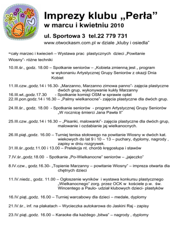 Imprezy klubu „Perła” w marcu i kwietniu 2010 ul. Sportowa 3 tel.22 779 731 www.otwockasm.com.pl w dziale „kluby i osiedla” -cały marzec i kwiecień – Wystawa prac plastycznych dzieci „Powitanie Wiosny”- różne techniki 10.III.śr., godz. 18.00 – Spotkanie seniorów – „Kobieta zmienną jest „ program w wykonaniu Artystycznej Grupy Seniorów z okazji Dnia Kobiet 11.III.czw.,godz.14 i 16.30- „Marzanno, Marzanno zimowa panno”- zajęcia plastyczne dwóch grup, wykonywanie kukły Marzanny 16.III.wt.,godz.17.30 - Spotkanie komisji OSM w sprawie opłat 22.III.pon.godz.14 i 16.30 – „Palmy wielkanocne”- zajęcia plastyczne dla dwóch grup. 24.III.śr., godz. 18.00 - Spotkanie seniorów - program Artystycznej Grupy Seniorów „W rocznicę śmierci Jana Pawła II” 25.III.czw.,godz.14 i 16.30 – „Pisanki, malowanki”- zajęcia plastyczne dla dwóch grup, malowanie i ozdabianie jaj wielkanocnych. 26.III.piąt.,godz. 16.00 – Turniej tenisa stołowego na powitanie Wiosny w dwóch kat. wiekowych do lat 9 i 10 – 13 – puchary, dyplomy, nagrody , zapisy w dniu rozgrywek. 31.III.śr.,godz.11.00 i 13.00 – Prelekcja nt. chorób kręgosłupa i stawów 7.IV.śr.,godz.18.00 - Spotkanie „Po-Wielkanocne” seniorów – „jajeczko” 8.IV.czw., godz.16.30- „Topienie Marzanny – powitanie Wiosny” – impreza otwarta dla chętnych dzieci 11.IV.niedz., godz. 11.00 – Ogłoszenie wyników i wystawa konkursu plastycznego „Wielkanocnego” zorg. przez OCK w kościele p.w. św. Wincentego a Paulo- udział klubowych dzieci- plastyków 16.IV.piąt.,godz. 16.00 – Turniej warcabowy dla dzieci – medale, dyplomy 21.IV.śr., inf. na plakatach – Wycieczka autokarowa do Jaskini Raj - zapisy 23.IV.piąt.,godz. 16.00 – Karaoke dla każdego „bitwa” – nagrody , dyplomy Zapraszamy do udziału w stałych formach pracy klubu: • zajęcia plastyczne z elementami umuzykalniającymi dla dzieci od 4 do 5 i od 6 do 8 • -„decupage”- sztuka zdobienia – zajęcia dla każdego – wtorki godz. 17 - 19 • roku życia- poniedziałki i czwartki godz. 14 – 15.30 i 16.30 – 18.30, • Akcja Lato w Mieście prowadzona w formie rozszerzonych zajęć artystycznych i sportowo-rekreacyjnych, zawsze według odrębnego programu na określony temat (realizowane m.in. metodami pracy zuchowej, harcerskiej, dramy, pedagogiki zabawy i in. ) w godz. 8.00 – 16.00 –w dniach 28 czerwca 2010- 16 lipca 2010r. • spotkania Seniorów (praca na rzecz seniorów osiedli OSM i pozostałych mieszkańców Otwocka,) z Artystyczną Grupą Seniorów , bogatym programem i ciekawą realizacją co 2 tygodnie w środy. • zajęcia sportowo - rekreacyjne : -tenis stołowy dla każdego – codziennie od 13.00, -nordic walking dla każdego –poniedziałki od 9.00, czwartki od 14.00 -gimnastyka dla pań –wtorki i czwartki 17.30-18.30 • gry play station 2 i karaoke, codziennie wg. potrzeb • TV kablowa, fimy DVD i wideo wg potrzeb • zajęcia świetlicowe i gry stolikowe wg potrzeb • odrabianie lekcji wg potrzeb