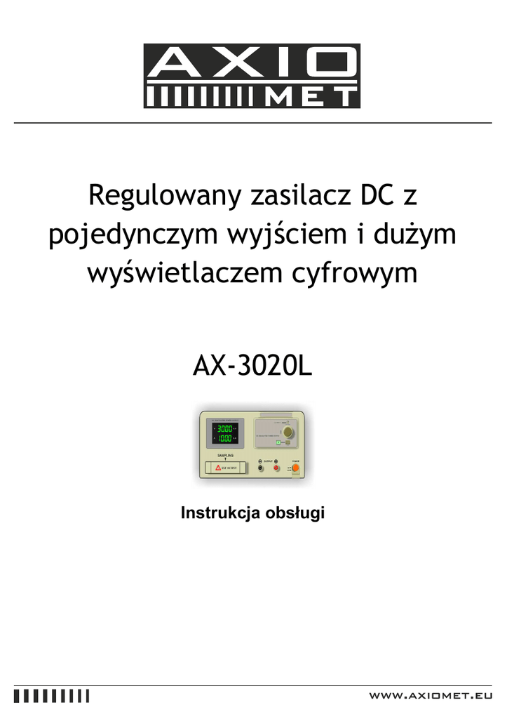 Regulowany zasilacz DC z pojedynczym wyjściem i dużym wyświetlaczem cyfrowym AX-3020L Instrukcja obsługi Rozdział 1. Specyfikacja Model AX-3020L PARAMETRY WEJŚCIOWE AC 220V 50Hz NAPIĘCIE WYJŚCIOWE 0 ~ 30V PRĄD WYJŚCIOWY 0~20A WYŚWIETLACZ 10mV 10mA TĘTNIENIA 1mV rms WYMIARY 265 x 140 x 360mm CIĘŻAR 12kg ~ 20kg Rozdział 2. Opis płyty czołowej Rysunek 1 1. Wyświetlacz napięcia 2. Wyświetlacz prądu 3. Port wyjściowy +S 4. Port wyjściowy –S 5. Port wyjściowy – 6. Port wyjściowy + 7. Gniazdo wyjściowe – 8. Gniazdo wyjściowe + 9. Włącznik zasilania 10. Symbol włączonego zasilania 11. Włącznik wyjścia 12. Regulator napięcia 13. Regulator prądu 14. Uziemienie obudowy Rozdział 3. Obsługa 1. Naciśnij przycisk ON/OFF, żeby włączyć zasilanie urządzenia. 2. Za pomocą regulatora napięcia ustaw żądaną wartość napięcia. (wartość napięcia pokazana będzie na wyświetlaczu LCD) 3. Ustaw żądaną wartość prądu za pomocą małego śrubokręta. (wartość prądu wyjściowego fabrycznie ustawiona jest na maksimum) 4. Podłącz obciążenie do gniazd wyjściowych i naciśnij włącznik wyjścia. Zaświeci się symbol włączonego zasilania i na wyświetlaczu pojawi się bieżąca wartość prądu wyjściowego. 5. Gniazda testowe nie są używane często. Powinno się z nich korzystać, jeśli obciążenie znajduje się w dużej odległości od zasilacza – umożliwiają one wtedy kompensowanie spadku napięcia w długich przewodach. Schemat połączeń z gniazdami testowymi: Rysunek 2 Uwaga: Podczas używania połączeń testowych odłącz przewody zwierające S- i S+.