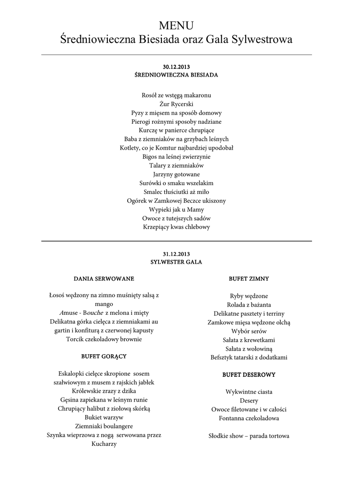 MENU Średniowieczna Biesiada oraz Gala Sylwestrowa