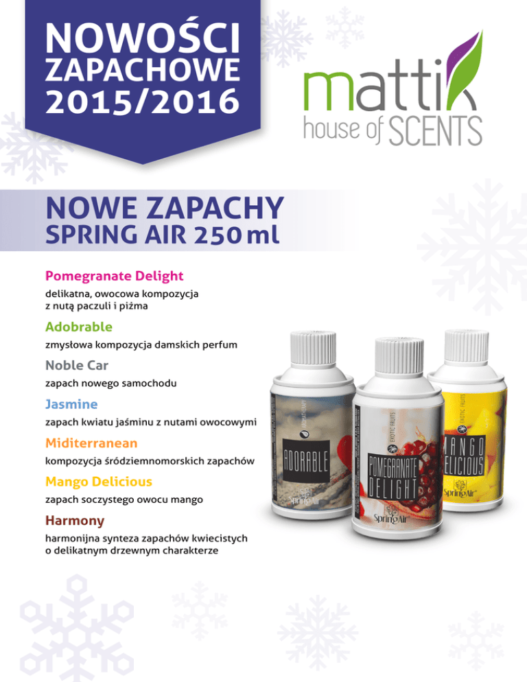 NOWOŚCI ZAPACHOWE 2015/2016 NOWE ZAPACHY SPRING AIR 250 ml Pomegranate Delight delikatna, owocowa kompozycja z nutą paczuli i piżma Adobrable zmysłowa kompozycja damskich perfum Noble Car zapach nowego samochodu Jasmine zapach kwiatu jaśminu z nutami owocowymi Miditerranean kompozycja śródziemnomorskich zapachów Mango Delicious zapach soczystego owocu mango Harmony harmonijna synteza zapachów kwiecistych o delikatnym drzewnym charakterze NOWE ZAPACHY SPRING AIR 500 ml White Tea Noble Car delikatna kompozycja białej herbaty z bergamotką, sandałowcem i skórką pomarańczy zapach nowego samochodu PATYSIE • karafka 100 ml • żywotność do 200 dni • obecnie 20 zapachów w stałej ofercie, możliwość zamówienia każdej z ok. 80 kompozycji Adventure Berberries Breeze Cool Water Escape Experience Feelings Fresh Blue Frozen Mohito Grapes Impressive MATTIK Andrzej Olszewski ul. Leśna 54 62-004 Czerwonak Magnolia Melon Oriental Nights Secret Silk Sunrise Tea Pearls Unforgettable White Orchid White Tea NIP 7771720931 REGON 632103541 +48 504 211 507 +48 531 703 603 +48 531 757 750 [email protected] www.mattik.pl