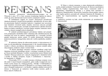 . Tendencje renesansowe (odrodzenia)rozpoczynające się we Włoszech w pocz. XV w. były wyrazem świadomego dążenia do odnowy sztuki, gł. przez odwoływanie się do wzorów czerpanych z antyku. W architekturze sięgano do wzorów starożytnych poszukiwano idealnych proporcji i przejrzystych podziałów, ukształtowały się nowe układy przestrzenne budowli (centralne budowle z kopułami) oraz nowożytne typy budynków świeckich (pałac miejski); stosowano antyczne porządki arch. i motywy dekoracyjne, rozwijało się budownictwo sakralne (kościoły, kaplice na planie centralnym) i świeckie (pałace miejskie, kamienice mieszczańskie, ratusze); nastąpił rozkwit urbanistyki. W sztukach przedstawiających prowadzono badania nad perspektywą, proporcjami, mechaniką ruchu i anatomią ciała; charakterystyczny dla renesansu był zwrot ku naturze; usamodzielniły się i rozwinęły świeckie gatunki tematyczne: portret, pejzaż. W rzeźbie dominowały realistyczne popiersia portretowe i posąg konny, także akt i rzeźba sepulkralna, medalierstwo. W malarstwie dążono do odtworzenia postaci w trójwymiarowej z2rzeni, do ich prawidłowego wkomponowania w tło, konsekwentnego ujęcia światła w obrazie; prowadzono doświadczenia w zakresie techniki malarskiej (tempera, malarstwo olejne i ścienne freski. W okresie dojrzałego renesansu ważnymi ośrodkami sztuki były: Mediolan (twórczość genialnego artysty i uczonego Leonarda da Vinci), a gł. Rzym (architekt Bramante i wybitni, wszechstronni artyści Michał Anioł i Rafael) i Wenecja (szkoła mal. o dużych osiągnięciach w dziedzinie koloru i światła: G. Bellini, Giorgione, Tycjan; w architekturze: J. Sansovino, M. Sanmicheli, A. Palladio. Od początku XVI w. ze sztuki renesansu włoskiego czerpano wzory dla sztuki w innych krajach europejskich., gdzie rzadko występowała ona w formie czystej, łącząc się z tradycją gotycką.,. Ośrodki: w Niderlandach (w malarstwie oryginalna twórczość P. Bruegela st.), we Francji (zamki nad Loarą) w Hiszpanii (malarstwie L. de Morales i zupełnie odrębna twórczość El Greca); w Niemczech: gł. malarstwo wielki malarz teoretyk, grafik A. Durer, także H. Holbein mł.. W Polsce w okresie renesansu w sztuce dominowała architektura i rzeźba, działali architekci: Franciszek Florentczyk, B. Berrecci (przebudowa Wawelu, Kaplica Zygmuntowska), Santi Gucci; wzniesiono zamki w Ogrodzieńcu, Niepołomicach, Brzegu, a w późnej fazie renesansu w Baranowie Sandomierskim i Krasiczynie, kamienice mieszczańskie, ratusze, centr. kaplice grobowe, powstało urb. założenie Zamościa (B. Morando).; w rzeźbie był rozpowszechniony typ nagrobka przyściennego (G.M. Padovano); w malarstwie wyróżnia się krak. szkoła miniatorska, gł. przedstawiciel S. Samostrzelnik Baranów Sandomierski 1 Michał Anioł-fragment Kaplicy Sykstyńskiej i Dawid Leonardo da VinciMona Liza Rafael-Madonna w krześle