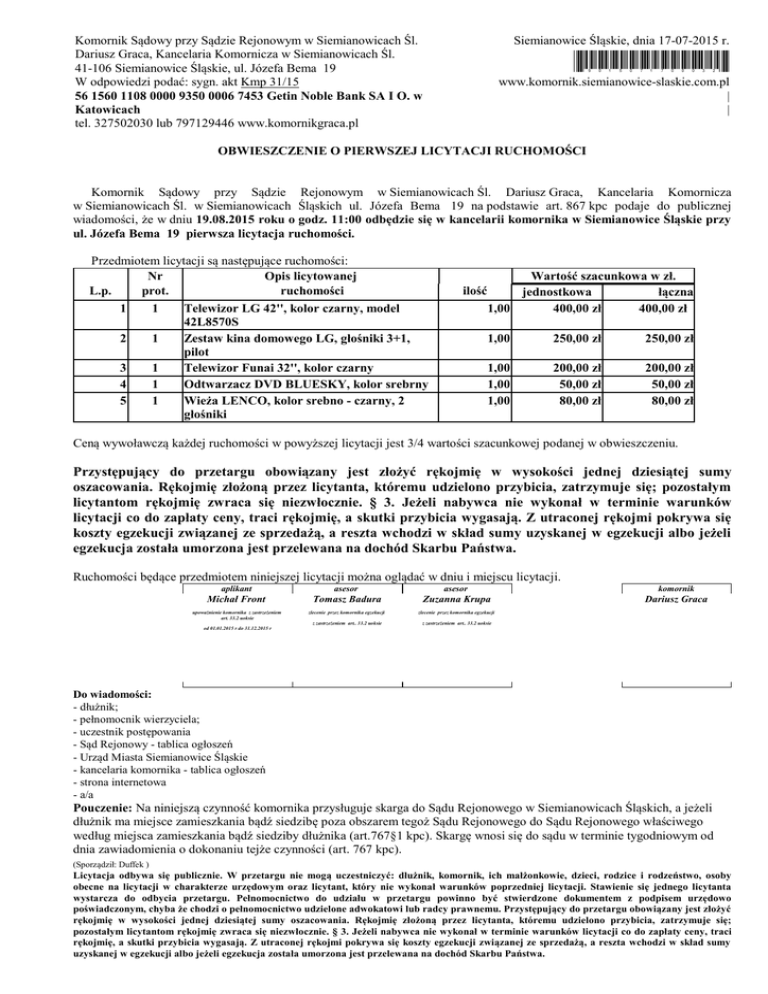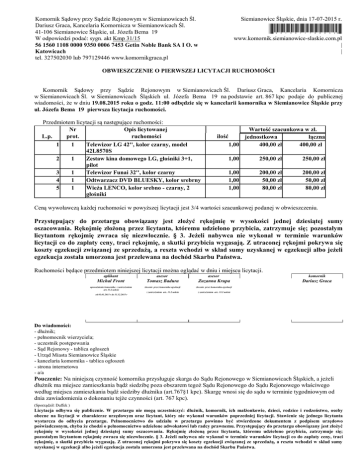 Komornik Sądowy przy Sądzie Rejonowym w Siemianowicach Śl. Dariusz Graca, Kancelaria Komornicza w Siemianowicach Śl. 41-106 Siemianowice Śląskie, ul. Józefa Bema 19 W odpowiedzi podać: sygn. akt Kmp 31/15 56 1560 1108 0000 9350 0006 7453 Getin Noble Bank SA I O. w Katowicach tel. 327502030 lub 797129446 www.komornikgraca.pl Siemianowice Śląskie, dnia 17-07-2015 r. *9015071700032* www.komornik.siemianowice-slaskie.com.pl | | OBWIESZCZENIE O PIERWSZEJ LICYTACJI RUCHOMOŚCI Komornik Sądowy przy Sądzie Rejonowym w Siemianowicach Śl. Dariusz Graca, Kancelaria Komornicza w Siemianowicach Śl. w Siemianowicach Śląskich ul. Józefa Bema 19 na podstawie art. 867 kpc podaje do publicznej wiadomości, że w dniu 19.08.2015 roku o godz. 11:00 odbędzie się w kancelarii komornika w Siemianowice Śląskie przy ul. Józefa Bema 19 pierwsza licytacja ruchomości. Przedmiotem licytacji są następujące ruchomości: Nr Opis licytowanej L.p. prot. ruchomości 1 1 Telewizor LG 42'', kolor czarny, model 42L8570S 2 1 Zestaw kina domowego LG, głośniki 3+1, pilot 3 1 Telewizor Funai 32'', kolor czarny 4 1 Odtwarzacz DVD BLUESKY, kolor srebrny 5 1 Wieża LENCO, kolor srebno - czarny, 2 głośniki ilość Wartość szacunkowa w zł. jednostkowa łączna 1,00 400,00 zł 400,00 zł 1,00 250,00 zł 250,00 zł 1,00 1,00 1,00 200,00 zł 50,00 zł 80,00 zł 200,00 zł 50,00 zł 80,00 zł Ceną wywoławczą każdej ruchomości w powyższej licytacji jest 3/4 wartości szacunkowej podanej w obwieszczeniu. Przystępujący do przetargu obowiązany jest złożyć rękojmię w wysokości jednej dziesiątej sumy oszacowania. Rękojmię złożoną przez licytanta, któremu udzielono przybicia, zatrzymuje się; pozostałym licytantom rękojmię zwraca się niezwłocznie. § 3. Jeżeli nabywca nie wykonał w terminie warunków licytacji co do zapłaty ceny, traci rękojmię, a skutki przybicia wygasają. Z utraconej rękojmi pokrywa się koszty egzekucji związanej ze sprzedażą, a reszta wchodzi w skład sumy uzyskanej w egzekucji albo jeżeli egzekucja została umorzona jest przelewana na dochód Skarbu Państwa. Ruchomości będące przedmiotem niniejszej licytacji można oglądać w dniu i miejscu licytacji. aplikant asesor asesor komornik Michał Front Tomasz Badura Zuzanna Krupa Dariusz Graca upoważnienie komornika z zastrzeżeniem art. 33.2 uoksie zlecenie przez komornika egzekucji zlecenie przez komornika egzekucji z zastrzeżeniem art.. 33.2 uoksie z zastrzeżeniem art.. 33.2 uoksie od 01.01.2015 r do 31.12.2015 r Do wiadomości: - dłużnik; - pełnomocnik wierzyciela; - uczestnik postępowania - Sąd Rejonowy - tablica ogłoszeń - Urząd Miasta Siemianowice Śląskie - kancelaria komornika - tablica ogłoszeń - strona internetowa - a/a Pouczenie: Na niniejszą czynność komornika przysługuje skarga do Sądu Rejonowego w Siemianowicach Śląskich, a jeżeli dłużnik ma miejsce zamieszkania bądź siedzibę poza obszarem tegoż Sądu Rejonowego do Sądu Rejonowego właściwego według miejsca zamieszkania bądź siedziby dłużnika (art.767§1 kpc). Skargę wnosi się do sądu w terminie tygodniowym od dnia zawiadomienia o dokonaniu tejże czynności (art. 767 kpc). (Sporządził: Duffek ) Licytacja odbywa się publicznie. W przetargu nie mogą uczestniczyć: dłużnik, komornik, ich małżonkowie, dzieci, rodzice i rodzeństwo, osoby obecne na licytacji w charakterze urzędowym oraz licytant, który nie wykonał warunków poprzedniej licytacji. Stawienie się jednego licytanta wystarcza do odbycia przetargu. Pełnomocnictwo do udziału w przetargu powinno być stwierdzone dokumentem z podpisem urzędowo poświadczonym, chyba że chodzi o pełnomocnictwo udzielone adwokatowi lub radcy prawnemu. Przystępujący do przetargu obowiązany jest złożyć rękojmię w wysokości jednej dziesiątej sumy oszacowania. Rękojmię złożoną przez licytanta, któremu udzielono przybicia, zatrzymuje się; pozostałym licytantom rękojmię zwraca się niezwłocznie. § 3. Jeżeli nabywca nie wykonał w terminie warunków licytacji co do zapłaty ceny, traci rękojmię, a skutki przybicia wygasają. Z utraconej rękojmi pokrywa się koszty egzekucji związanej ze sprzedażą, a reszta wchodzi w skład sumy uzyskanej w egzekucji albo jeżeli egzekucja została umorzona jest przelewana na dochód Skarbu Państwa.