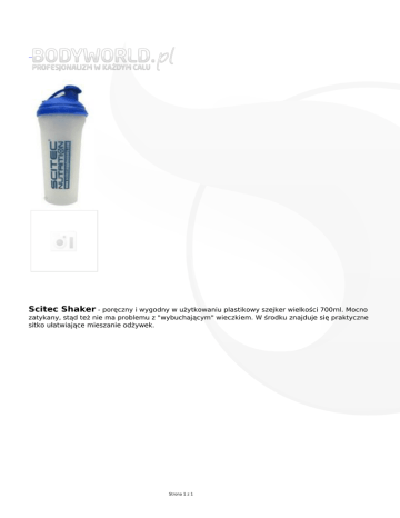 Scitec Shaker - poręczny i wygodny w użytkowaniu plastikowy szejker wielkości 700ml. Mocno zatykany, stąd też nie ma problemu z "wybuchającym" wieczkiem. W środku znajduje się praktyczne sitko ułatwiające mieszanie odżywek. Strona 1 z 1