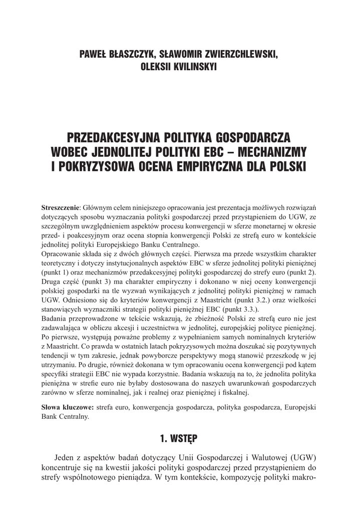 PAWEŁ BŁASZCZYK, SŁAWOMIR ZWIERZCHLEWSKI, OLEKSII KVILINSKYI PRZEDAKCESYJNA POLITYKA GOSPODARCZA WOBEC JEDNOLITEJ POLITYKI EBC – MECHANIZMY I POKRYZYSOWA OCENA EMPIRYCZNA DLA POLSKI Streszczenie: Głównym celem niniejszego opracowania jest prezentacja możliwych rozwiązań dotyczących sposobu wyznaczania polityki gospodarczej przed przystąpieniem do UGW, ze szczególnym uwzględnieniem aspektów procesu konwergencji w sferze monetarnej w okresie przed- i poakcesyjnym oraz ocena stopnia konwergencji Polski ze strefą euro w kontekście jednolitej polityki Europejskiego Banku Centralnego. Opracowanie składa się z dwóch głównych części. Pierwsza ma przede wszystkim charakter teoretyczny i dotyczy instytucjonalnych aspektów EBC w sferze jednolitej polityki pieniężnej (punkt 1) oraz mechanizmów przedakcesyjnej polityki gospodarczej do strefy euro (punkt 2). Druga część (punkt 3) ma charakter empiryczny i dokonano w niej oceny konwergencji polskiej gospodarki na tle wyzwań wynikających z jednolitej polityki pieniężnej w ramach UGW. Odniesiono się do kryteriów konwergencji z Maastricht (punkt 3.2.) oraz wielkości stanowiących wyznaczniki strategii polityki pieniężnej EBC (punkt 3.3.). Badania przeprowadzone w tekście wskazują, że zbieżność Polski ze strefą euro nie jest zadawalająca w obliczu akcesji i uczestnictwa w jednolitej, europejskiej polityce pieniężnej. Po pierwsze, występują poważne problemy z wypełnianiem samych nominalnych kryteriów z Maastricht. Co prawda w ostatnich latach pokryzysowych można doszukać się pozytywnych tendencji w tym zakresie, jednak powyborcze perspektywy mogą stanowić przeszkodę w jej utrzymaniu. Po drugie, również dokonana w tym opracowaniu ocena konwergencji pod kątem specyfiki strategii EBC nie wypada korzystnie. Badania wskazują na to, że jednolita polityka pieniężna w strefie euro nie byłaby dostosowana do naszych uwarunkowań gospodarczych zarówno w sferze nominalnej, jak i realnej oraz pieniężnej i fiskalnej. Słowa kluczowe: strefa euro, konwergencja gospodarcza, polityka gospodarcza, Europejski Bank Centralny. 1. WSTĘP Jeden z aspektów badań dotyczący Unii Gospodarczej i Walutowej (UGW) koncentruje się na kwestii jakości polityki gospodarczej przed przystąpieniem do strefy wspólnotowego pieniądza. W tym kontekście, kompozycję polityki makro- 12 Paweł Błaszczyk, Sławomir Zwierzchlewski, Oleksii Kvilinskyi ekonomicznej można analizować poprzez formułowanie jej wariantów. Istotnym obszarem analizy jest wyodrębnienie dwóch skrajnych opcji zakładających wypełnienie (pierwszy wariant) lub niespełnienie (drugi wariant) obligatoryjnych kryteriów zbieżności przed przystąpieniem do ERM II, z jednoczesnym uwidacznianiem ich wpływu dla sfery realnej gospodarki oraz stabilności kursu w ERM II1. Utrzymanie zbieżności głównych parametrów ekonomicznych (stopy procentowej, inflacji, deficytu budżetowego/publicznego) na obszarze UGW jest kolejnym czynnikiem oddziałującym na skuteczność procesu integracji walutowej. W tym zakresie, ważnym zagadnieniem jest ocena szybkości transmisji impulsów pieniężnych generowanych przez Europejski Bank Centralny (EBC). Odmienne cechy polityk pieniężnych poszczególnych państw unii, szczególnie stanów płynności komercyjnego sektora bankowego oraz mechanizmu alokacji finansowej, mogą zniekształcać charakter mechanizmu transmisji pieniężnej i tym samym różnicować poziom stóp procentowych czy inflacji2. Na tym tle skonstruowano główny cel niniejszego opracowania, którym jest prezentacja możliwych rozwiązań dotyczących sposobu wyznaczania polityki gospodarczej przed przystąpieniem do UGW, ze szczególnym uwzględnieniem aspektów procesu konwergencji w sferze monetarnej w okresie przed- i poakcesyjnym oraz ocena stopnia konwergencji Polski ze strefą euro w kontekście jednolitej polityki Europejskiego Banku Centralnego3. Opracowanie składa się z dwóch głównych części. Pierwsza (punkty 1–2) ma głównie charakter teoretyczny i dotyczy instytucjonalnych aspektów EBC w sferze jednolitej polityki pieniężnej (punkt 1) oraz mechanizmów przedakcesyjnej polityki gospodarczej do strefy euro (punkt 2). Druga część (punkt 3) ma charakter empiryczny i dokonano w niej oceny konwergencji polskiej gospodarki na tle wyzwań wynikających z jednolitej polityki pieniężnej w ramach UGW. Odniesiono się do kryteriów konwergencji z Maastricht (punkt 3.2.) oraz wielkości stanowiących wyznaczniki strategii polityki pieniężnej EBC (punkt 3.3.). 2. INSTYTUCJONALNA FORMUŁA EBC Zbieżność parametrów ekonomicznych na obszarze UGW jest jednym z kluczowych czynników wzmacniającym stabilność UGW. W tym kontekście, szczególnego znaczenia nabrała kwestia reputacji EBC, a tym samym jakości transmisji unijnej polityki pieniężnej. Zasadniczy problem polega na tym, że wiarygodności banku centralnego nie buduje się z dnia na dzień. Wystąpiła zatem konieczność wydatnego skrócenia tego procesu poprzez odpowiednie rozwiązania instytucjonalne. 1 Zob. D. Gros, N. Thygesen, European monetary integration, Pearson Education, Harlow, England 2003. 2 Zob. A. Nowak-Far, Unia gospodarcza i walutowa w Europie, Instytut Wydawniczy EuroPrawo, Warszawa 2011. 3 E. J. Pentecost, A. Van Poeck (red.), European Monetary Integration. Past, Present and Future, Edward Elgar, Nortampton 2001, s. 87–154. Przedakcesyjna polityka gospodarcza wobec jednolitej polityki EBC... 13 Zastosowano, słusznie z punktu widzenia stabilności sfery pieniężnej w UGW, następujące rozwiązania: ■■ zbudowano EBC zgodnie z pewnym zapożyczonym wzorcem, ■■ określono explicite cel (cele) wspólnej polityki pieniężnej, ■■ przyznano EBC niezależność w wymiarze politycznym i funkcjonalnym wraz z minimalizowaniem formalnej odpowiedzialności za realizację ogłoszonych przez siebie celów, ■■ określono explicite sposób wyz