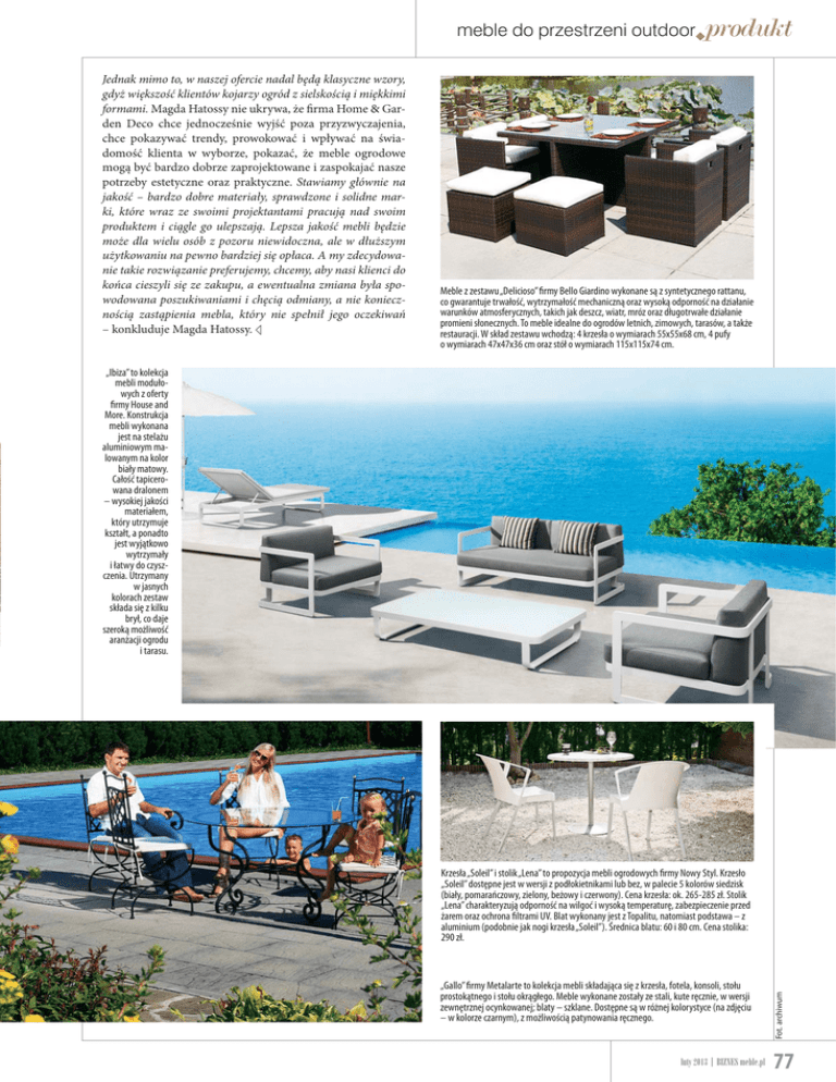 meble do przestrzeni outdoorX produkt Jednak mimo to, w naszej ofercie nadal będą klasyczne wzory, gdyż większość klientów kojarzy ogród z sielskością i miękkimi formami. Magda Hatossy nie ukrywa, że firma Home & Garden Deco chce jednocześnie wyjść poza przyzwyczajenia, chce pokazywać trendy, prowokować i wpływać na świadomość klienta w wyborze, pokazać, że meble ogrodowe mogą być bardzo dobrze zaprojektowane i zaspokajać nasze potrzeby estetyczne oraz praktyczne. Stawiamy głównie na jakość – bardzo dobre materiały, sprawdzone i solidne marki, które wraz ze swoimi projektantami pracują nad swoim produktem i ciągle go ulepszają. Lepsza jakość mebli będzie może dla wielu osób z pozoru niewidoczna, ale w dłuższym użytkowaniu na pewno bardziej się opłaca. A my zdecydowanie takie rozwiązanie preferujemy, chcemy, aby nasi klienci do końca cieszyli się ze zakupu, a ewentualna zmiana była spowodowana poszukiwaniami i chęcią odmiany, a nie koniecznością zastąpienia mebla, który nie spełnił jego oczekiwań – konkluduje Magda Hatossy. d Meble z zestawu „Delicioso” firmy Bello Giardino wykonane są z syntetycznego rattanu, co gwarantuje trwałość, wytrzymałość mechaniczną oraz wysoką odporność na działanie warunków atmosferycznych, takich jak deszcz, wiatr, mróz oraz długotrwałe działanie promieni słonecznych. To meble idealne do ogrodów letnich, zimowych, tarasów, a także restauracji. W skład zestawu wchodzą: 4 krzesła o wymiarach 55x55x68 cm, 4 pufy o wymiarach 47x47x36 cm oraz stół o wymiarach 115x115x74 cm. „Ibiza” to kolekcja mebli modułowych z oferty firmy House and More. Konstrukcja mebli wykonana jest na stelażu aluminiowym malowanym na kolor biały matowy. Całość tapicerowana dralonem – wysokiej jakości materiałem, który utrzymuje kształt, a ponadto jest wyjątkowo wytrzymały i łatwy do czyszczenia. Utrzymany w jasnych kolorach zestaw składa się z kilku brył, co daje szeroką możliwość aranżacji ogrodu i tarasu. „Gallo” firmy Metalarte to kolekcja mebli składająca się z krzesła, fotela, konsoli, stołu prostokątnego i stołu okrągłego. Meble wykonane zostały ze stali, kute ręcznie, w wersji zewnętrznej ocynkowanej; blaty – szklane. Dostępne są w różnej kolorystyce (na zdjęciu – w kolorze czarnym), z możliwością patynowania ręcznego. luty 2013 [ BIZNES meble.pl Fot. archiwum Krzesła „Soleil” i stolik „Lena” to propozycja mebli ogrodowych firmy Nowy Styl. Krzesło „Soleil” dostępne jest w wersji z podłokietnikami lub bez, w palecie 5 kolorów siedzisk (biały, pomarańczowy, zielony, beżowy i czerwony). Cena krzesła: ok. 265-285 zł. Stolik „Lena” charakteryzują odporność na wilgoć i wysoką temperaturę, zabezpieczenie przed żarem oraz ochrona filtrami UV. Blat wykonany jest z Topalitu, natomiast podstawa – z aluminium (podobnie jak nogi krzesła „Soleil”). Średnica blatu: 60 i 80 cm. Cena stolika: 290 zł. 77