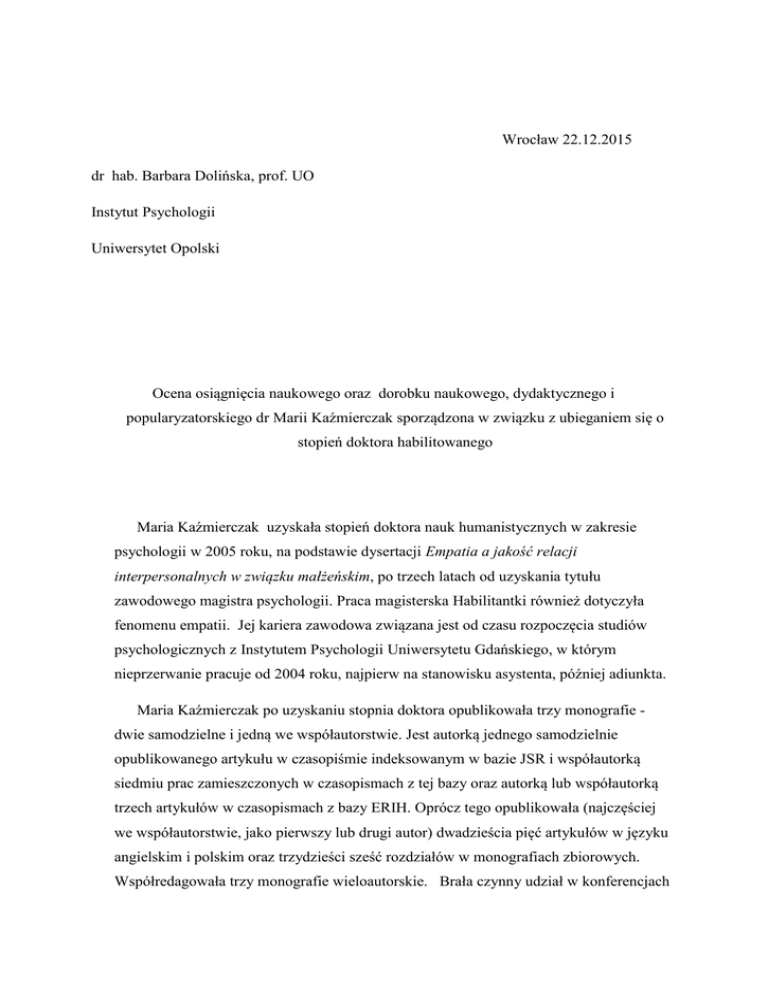 Wrocław 22.12.2015 dr hab. Barbara Dolińska, prof. UO Instytut Psychologii Uniwersytet Opolski Ocena osiągnięcia naukowego oraz dorobku naukowego, dydaktycznego i popularyzatorskiego dr Marii Kaźmierczak sporządzona w związku z ubieganiem się o stopień doktora habilitowanego Maria Kaźmierczak uzyskała stopień doktora nauk humanistycznych w zakresie psychologii w 2005 roku, na podstawie dysertacji Empatia a jakość relacji interpersonalnych w związku małżeńskim, po trzech latach od uzyskania tytułu zawodowego magistra psychologii. Praca magisterska Habilitantki również dotyczyła fenomenu empatii. Jej kariera zawodowa związana jest od czasu rozpoczęcia studiów psychologicznych z Instytutem Psychologii Uniwersytetu Gdańskiego, w którym nieprzerwanie pracuje od 2004 roku, najpierw na stanowisku asystenta, później adiunkta. Maria Kaźmierczak po uzyskaniu stopnia doktora opublikowała trzy monografie dwie samodzielne i jedną we współautorstwie. Jest autorką jednego samodzielnie opublikowanego artykułu w czasopiśmie indeksowanym w bazie JSR i współautorką siedmiu prac zamieszczonych w czasopismach z tej bazy oraz autorką lub współautorką trzech artykułów w czasopismach z bazy ERIH. Oprócz tego opublikowała (najczęściej we współautorstwie, jako pierwszy lub drugi autor) dwadzieścia pięć artykułów w języku angielskim i polskim oraz trzydzieści sześć rozdziałów w monografiach zbiorowych. Współredagowała trzy monografie wieloautorskie. Brała czynny udział w konferencjach o zasięgu międzynarodowym wygłaszając sama, lub we współautorstwie 62 referaty i 25 razy uczestnicząc w sesjach plakatowych. Ponadto Maria Kaźmierczak była dwukrotnie stypendystką Fundacji na Rzecz Nauki Polskiej, otrzymała nagrody za działalność naukową. Została również odznaczona Medalem Komisji Edukacji Narodowej. Liczbowo dorobek Habilitantki wydaje się wystarczający, by przedstawić go do postępowania awansowego. Ustawa obliguje jednak recenzenta także do jakościowej oceny całości dorobku, ze szczególnym uwzględnieniem publikacji wykazanych jako osiągnięcie naukowe. Zatem, zgodnie z duchem Ustawy, kolejno omówię dorobek Habilitantki i oraz monografię wskazaną jako osiągnięcie naukowe. I Wykaz osiągnięć Habilitantki, usystematyzowany zgodnie z kryteriami zawartymi w rozporządzeniu Ministra Nauki i Szkolnictwa Wyższego z dnia 1 września 2011 r., w obszarze nauk społecznych § 3.2 Autorstwo lub współautorstwo publikacji naukowych w czasopismach znajdujących się w bazie Journal Citation Reports (JCR) lub na liście European Reference Index for the Humanities (ERIH) Publikacje znajdujące się w bazie JCR – 8; ERIH – 3 § 4.1 Autorstwo lub współautorstwo monografii, publikacji naukowych w czasopismach międzynarodowych lub krajowych innych niż znajdujących się w bazach lub na liście, o których mowa w §3 dla danego obszaru wiedzy. Publikacje znajdujące się w bazie JCR – 8; ERIH – 3 Monografia 2 Monografie pod redakcją 1 (j. polski), 2 (j. angielski) Artykuły w czasopismach punktowanych przez MNiSW – 24 Artykuły w czasopismach recenzowanych spoza listy MNiSW – 3 Rozdziały w monografiach zbiorowych – 6 (j. angielski), 30 (j. polski) Artykuły złożone do druku/w druku – 1 § 4.3Sumaryczny impact factor publikacji naukowych według listy JCR, zgodnie z rokiem opublikowania 7.784 (5-letni 9.545) § 4.4 Liczbę cytowań publikacji według bazy Wos - 5 § 4.5 Indeks Hirscha opublikowanych publikacji według bazy Wos - 2 Indeks Hirscha według bazy Publish or Perish – 5 § 4.6 Kierowanie międzynarodowymi lub krajowymi projektami badawczymi lub udział w takich projektach Habilitantka wykazuje główne wykonawstwo projektu finansowanego przez NCN, kierowanie 4 projektami badawczymi oraz wykonawstwo i status głównego wykonawcy sześciu projektów w ramach grantu przyznanego przez macierzystą uczelnie ( w dwóch przypadkach współfinansowanego przez uczelnie zagraniczne) § 4.7 Międzynarodowe lub krajowe nagrody za działalność odpowiednio naukową lub artystyczną Nagroda Prezesa Rady Ministrów za wyróżnioną rozprawę doktorską (2006), nagroda Gdańskiego Towarzystwa Naukowego za wybitne osiągnięcia dla młodych badaczy (2005), IACCP, Grecja Witkin- Okonji Memorial Fund Award, for promissing young researchers ,stypendium START Fundacji na Rzecz Nauki Polskiej (2007 i jego kontynuacja w 2008), § 4.8Wygłoszenie referatów na międzynarodowych lub krajowych konferencjach tematycznych Habilitantka wykazała czynny udział w 61 konferencjach (18 międzynarodowych, w tym 10 zagranicznych; 40 ogólnopolskich i 3 krajowych) . Sama lub we współautorstwie wygłosiła na nich referaty. § 5.1 Uczestnictwo w programach europejskich i innych programach międzynarodowych lub krajowych Członek Komitetu Zarządzającego (mianowanie przez Prorektora ds. Nauki UG i MNiSW) European Cooperation in Science and Technology ISCH COST Action IS 1405 2014-2018. § 5.2 Udział w międzynarodowych lub krajowych konferencjach naukowych lub udział w komitetach organizacyjnych tych konferencji; Aktywny udział w 26 konferencjach (20 międzynarodowych, w tym 16 zagranicznych (Francja, Izrael, Niemcy, Norwegia, Portugalia, Słowacja, USA, Włochy) w ramach których Habilitantka wygłosiła 1 referat i 25 razy, sama lub we współautorstwie, brała udział w sesji plakatowej; pięć ogólnopolskich, jedna krajowa konferencji). Była również współorganizatorem 7 konferencji pełniąc funkcje naukowe i organizacyjne; sześciokrotnie organizowała albo prowadziła sympozja lub sesje tematyczne w ramach międzynarodowych konferencji naukowych i tyleż razy organizowała lub prowadziła sympozja naukowe na ogólnopolskich konferencjach naukowych § 5.3 Otrzymane nagrody lub wyróżnienia Wyróżnienie rozprawy doktorskiej (Rada Naukowa Instytutu Psychologii UG), stypendium Fundacji Rozwoju Uniwersytetu Gdańskieg
