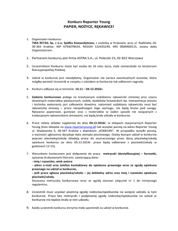 Konkurs Reporter Young PAPIER, NOŻYCE, RĘKAWICE! 1. Organizator konkursu: TWA RETAIL Sp. z o.o. Spółka Komandytowa, z siedzibą w Krakowie, przy ul. Rydlówka 20, 30-363 Kraków, NIP 6793078424, REGON 122435249, KRS 0000400115, zwany dalej Organizatorem. 1. Partnerem konkursu jest firma ASTRA S.A., ul. Poleczki 23, 02-822 Warszawa 2. Uczestnikiem Konkursu może być osoba do 16 roku życia, stale zamieszkała na terytorium Rzeczypospolitej Polskiej. 3. Udział w konkursie jest nieodpłatny, Organizator nie zwraca ewentualnych kosztów, które mógłby ponieść Uczestnik w związku z udziałem w Konkursie lub odbiorem nagrody. 4. Konkurs odbywa się w terminie: 14.11 – 04.12.2016r. 5. Zadanie konkursowe polega na kreatywnym ozdobieniu rękawiczki zimowej przy użyciu dowolnych materiałów plastycznych, ozdób, dodatków krawieckich itp. Interpretacja tematu i technika wykonania jest całkowicie dowolna, natomiast ozdabiana rękawiczka musi być rękawiczką zimową – prace niespełniające tego wymogu, nie będą brane pod uwagę. Rękawice papierowe, gumowe oraz z materiałów w żaden sposób nie związanych z tradycyjnymi rękawiczkami zimowymi, nie będą brały udziały w konkursie. 6. Prace należy składać najpóźniej do dnia 04.12.2016r. w sklepach stacjonarnych Reporter Young (lista sklepów na www.reporteryoung.pl) lub wysyłać pocztą na adres Reporter Young ul. Wadowicka 5, 30-347 Kraków z dopiskiem „KONKURS”. W przypadku wysyłki pocztą, o ważności zgłoszenia decyduje data stempla pocztowego. Osoby biorące udział w konkursie poprzez placówkę/szkołę składają prace do wyznaczonego przez daną placówkę/szkołę opiekuna konkursu (w dniu 05.12.2014r. prace będą odbierane z placówki/szkoły w godzinach 12-15). 7. Warunkiem koniecznym jest dołączenie do pracy metryczki identyfikacyjnej – formatki, opisanej drukowanymi literami, zawierającą dane: - imię i nazwisko, wiek autora - adres e-mail oraz telefon kontaktowy do opiekuna prawnego wraz ze zgodą opiekuna prawnego na udział w konkursie, - jeśli prace zgłasza placówka/szkoła – jej dokładny adres oraz imię i nazwisko opiekuna placówki/szkoły. Stosowna metryczka konkursowa wraz ze zgodą stanowi załącznik nr 1 do niniejszego regulaminu. 8. Uczestnik musi uzyskać pisemną zgodę rodziców/opiekunów na wzięcie udziału w tym konkursie. Praca bez metryczki i podpisanej zgody rodziców/opiekunów na udział w konkursie nie będzie brała w nim udziału. 9. Każdy uczestnik konkursu otrzyma mały upominek za udział w konkursie. 10. Jury powołane przez Organizatora przyzna nagrody w konkursie. Przy wyborze laureatów będzie kierować się własnym uznaniem. Nagrodami w konkursie są: 6 bonów o wartości 500zł każdy, do wykorzystania w sklepach Reporter Young 20 bonów o wartości 200zł każdy, do wykorzystania w sklepach Reporter Young 60 bonów o wartości 50zł każdy, do wykorzystania w sklepach Reporter Young Organizator zastrzega sobie prawo do zwiększenia ilości nagród. 11. Szkoły/placówki, które zgłoszą do konkursu min. 20 prac swoich uczniów/podopiecznych otrzymają od Organizatora w ramach podziękowania za wykazane zaangażowanie paczkę z gratisami. Otrzymane rzeczy szkoły/placówki mogą wykorzystać w dowolny sposób. Paczki z gratisami szkoły/placówki otrzymają od Organizatora w terminie do 06.01.2017r. W każdej paczce do szkoły będzie się znajdował następujący zestaw gadżetów: - 10 szt. czapek z daszkiem typu full cup - 10 szt. T-shirtów – mix rozmiarów - 100 szt. odblasków - zestaw przyborów plastycznych Astra 12. Prace złożone po terminie nie będą oceniane. Nie zwracamy nadesłanych prac. Organizator zastrzega sobie prawo do publikowania i reprodukowania nagrodzonych prac bez wypłacania honorariów autorskich. 13. Ogłoszenie wyników nastąpi do dnia 15.12.2016r. do godz. 16:00. Lista osób nagrodzonych oraz lista osób wyróżnionych będzie dostępna na stronie www.reporteryoung.pl. Każdy nagrodzony będzie poinformowany telefonicznie lub mailowo o nagrodzie oraz miejscu i terminie jej odbioru. 14. W razie rezygnacji z odbioru nagrody, Organizator nie wypłaca ekwiwalentu pieniężnego nagrody. 15. Przystępując do Konkursu klienci, będący osobami fizycznymi, wyrażają zgodę na przetwarzanie swoich danych osobowych, w rozumieniu ustawy z dnia 29 sierpnia 1997r. o ochronie danych osobowych (Dz. U. Nr 133, poz. 883 z 1997r.) w bazie danych osobowych klientów Organizatora dla celów Konkursu oraz dla celów marketingowych, zaś w przypadku wyłonienia ich jako Zwycięzców w Konkursie na opublikowanie swego imienia, nazwiska, miejscowości lub wizerunku na liście zwycięzców. 16. Administratorem danych osobowych klientów sklepu Reporter Young jest Organizator. 17. Klientowi przysługuje prawo wglądu do jego danych osobowych oraz prawo żądania ich poprawiania i usunięcia. 18. Udział klienta w Konkursie oznacza akceptację zasad Konkursu, zawartych w niniejszym regulaminie. 19. Regulamin jest jedynym dokumentem określającym zasady Konkursu. Jest dostępny w sklepach stacjonarnych Reporter Young oraz w siedzibie głównej Organizatora w Krakowie. 20. Wszelkie spory mogące wyniknąć w związku z realizacją Konkursu będą rozstrzygane przez sąd właściwy miejscowo dla Organizatora według przepisów kodeksu postępowania cywilnego. 21. W sprawach nieuregulowanych regulaminem stosuje się odpowiednio przepisy Kodeksu Cywilnego. 22. Organizator zastrzega sobie prawo do zmiany postanowień regulaminu, o ile nie wpłynie to na pogorszenie warunków uczestnictwa w Konkursie. Zmiana obowiązywać będzie klientów, biorących udział w Konkursie. 23. Ostateczna interpretacja zapisów treści regulaminu Konkursu należy do Organizatora Konkursu. 24. Organizator zastrzega sobie prawo zawieszenia lub zaprzestania organizacji Konkursu, bez konieczności poinformowania klientów. W przypadku zawieszenia lub zaprzestan