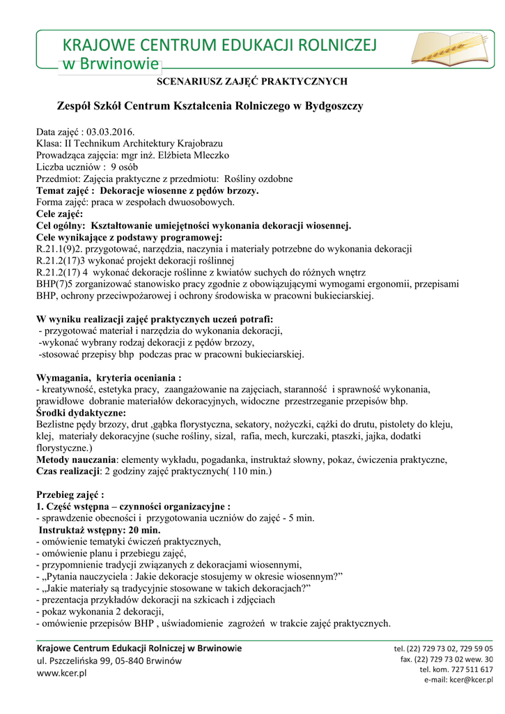 SCENARIUSZ ZAJĘĆ PRAKTYCZNYCH Zespół Szkół Centrum Kształcenia Rolniczego w Bydgoszczy Data zajęć : 03.03.2016. Klasa: II Technikum Architektury Krajobrazu Prowadząca zajęcia: mgr inż. Elżbieta Mleczko Liczba uczniów : 9 osób Przedmiot: Zajęcia praktyczne z przedmiotu: Rośliny ozdobne Temat zajęć : Dekoracje wiosenne z pędów brzozy. Forma zajęć: praca w zespołach dwuosobowych. Cele zajęć: Cel ogólny: Kształtowanie umiejętności wykonania dekoracji wiosennej. Cele wynikające z podstawy programowej: R.21.1(9)2. przygotować, narzędzia, naczynia i materiały potrzebne do wykonania dekoracji R.21.2(17)3 wykonać projekt dekoracji roślinnej R.21.2(17) 4 wykonać dekoracje roślinne z kwiatów suchych do różnych wnętrz BHP(7)5 zorganizować stanowisko pracy zgodnie z obowiązującymi wymogami ergonomii, przepisami BHP, ochrony przeciwpożarowej i ochrony środowiska w pracowni bukieciarskiej. W wyniku realizacji zajęć praktycznych uczeń potrafi: - przygotować materiał i narzędzia do wykonania dekoracji, -wykonać wybrany rodzaj dekoracji z pędów brzozy, -stosować przepisy bhp podczas prac w pracowni bukieciarskiej. Wymagania, kryteria oceniania : - kreatywność, estetyka pracy, zaangażowanie na zajęciach, staranność i sprawność wykonania, prawidłowe dobranie materiałów dekoracyjnych, widoczne przestrzeganie przepisów bhp. Środki dydaktyczne: Bezlistne pędy brzozy, drut ,gąbka florystyczna, sekatory, nożyczki, cążki do drutu, pistolety do kleju, klej, materiały dekoracyjne (suche rośliny, sizal, rafia, mech, kurczaki, ptaszki, jajka, dodatki florystyczne.) Metody nauczania: elementy wykładu, pogadanka, instruktaż słowny, pokaz, ćwiczenia praktyczne, Czas realizacji: 2 godziny zajęć praktycznych( 110 min.) Przebieg zajęć : 1. Część wstępna – czynności organizacyjne : - sprawdzenie obecności i przygotowania uczniów do zajęć - 5 min. Instruktaż wstępny: 20 min. - omówienie tematyki ćwiczeń praktycznych, - omówienie planu i przebiegu zajęć, - przypomnienie tradycji związanych z dekoracjami wiosennymi, - „Pytania nauczyciela : Jakie dekoracje stosujemy w okresie wiosennym?” - „Jakie materiały są tradycyjnie stosowane w takich dekoracjach?” - prezentacja przykładów dekoracji na szkicach i zdjęciach - pokaz wykonania 2 dekoracji, - omówienie przepisów BHP , uświadomienie zagrożeń w trakcie zajęć praktycznych. 2. Część właściwa( 75 min) Uczniowie w zespołach dwuosobowych - wybierają wzornik pracy do wykonania, - przygotowują materiały i sprzęt , - wykonują 2 dekoracje : jedną wiszącą, drugą do postawienia na stole. - porządkują stanowisko pracy, zabezpieczają narzędzia i materiały.. Nauczyciel wspiera w trakcie pracy, inspiruje, daje wybór, przypomina o przestrzeganiu przepisów bhp. 3. Część końcowa (15 min): --uczniowie prezentują swoje prace w zespołach dwuosobowych, - uczniowie dokonują oceny koleżeńskiej według kryteriów zaproponowanych na karcie pracy ucznia - ocena nauczyciela, przypomnienie celów lekcji i odniesienie do kryteriów, Zadanie domowe : Zaprojektuj dekorację wiosenną według własnego pomysłu. Projekt wykonaj na kartce formatu A4 techniką barwną. Rysunek wykonaj w rzucie perspektywicznym w skali 1:5. Uwzględnij zastosowanie dekoracji ( do dekoracji okna czy stołu) Kryteria oceniania prac : Karta oceny . Za każde kryterium można przydzielić 1 lub 2 punkty Kryteria oceny Para I Para Para Para Para V II III IV 1. Przestrzeganie przepisów BHP 2.Współpraca w parach 3. Dekoracje według własnego pomysłu 4. Sprawność wykonania –tempo pracy 5. Dobór materiału – kreatywność 6. Staranność wykonania Suma punktów Ocena Ocenianie : 5 -dopuszczający 6-7 -dostateczny, 8-9 -dobry 10-11 -bardzo dobry 12 p. -celujący. Zakończenie zajęć- wybór najładniejszej ozdoby ( głosowanie tajne- kolorowe kartki ) Bibliografia: A. Nizińska, A. Maśka, E. Gadomska : Rośliny ozdobne w arch. kraj. cz. V.- Hortpress . A. Nizińska „ ABC florystyki” WYD. Hortpress Sp.z o.o Katalog florysty Wielkanoc 2016. 2/2016. J. Gwóźdź – Inspiracje na Wielkanoc” Buchman 2013.