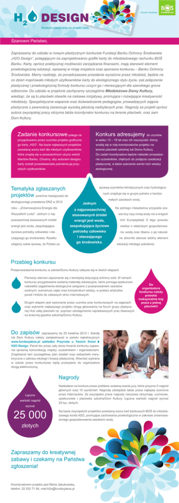 Szanowni Państwo, Zapraszamy do udziału w nowym plastycznym konkursie Fundacji Banku Ochrony Środowiska „H2O Design”, polegającym na zaprojektowaniu grafiki karty do młodzieżowego rachunku BOŚ Banku. Karty, oprócz praktycznej możliwości zarządzania finansami, mają stanowić element proekologicznej edukacji, wpisanej w misję inicjatora oraz sponsora konkursu – Banku Ochrony Środowiska. Mamy nadzieję, że ponadczasowe przesłanie wyrażone przez młodzież, będzie na co dzień inspirowało młodych użytkowników karty do ekologicznego stylu życia, zaś połączenie plastycznej i proekologicznej formuły konkursu uczyni go i nteresującym dla szerokiego grona odbiorców. Do udziału w projekcie zachęcamy szczególnie Młodzieżowe Domy Kultury, wiedząc, że są to placówki otwarte na ciekawe inicjatywy, promujące i rozwijające kreatywność młodzieży. Specjalistyczne wsparcie oraz doświadczenie pedagogów, prowadzących zajęcia plastyczne z pewnością zaowocuje wysoką jakością nadsyłanych prac. Nagrody za projekt oprócz autora zwycięskiej pracy otrzyma także koordynator konkursu na terenie placówki, oraz sam Dom Kultury. Zadanie konkursowe polega na Konkurs adresujemy przygotowaniu przez uczniów projektu graficzne- w wieku 13 – 18 lat oraz ich nauczycieli, którzy go karty „H2O”. Na bazie najlepszych projektów wcielą się w rolę koordynatorów projektu na powstaną wzory kart dla młodych użytkowników, terenie placówki szkolnej lub Domu Kultury. które znajdą się w powszechnym użyciu wśród Do zadań koordynatora będzie należało prowadze- klientów Banku. Chcemy, aby autorami designu nie uczestników, chętnych do podjęcia rywalizacji karty zostali przedstawiciele pokolenia jej przy- plastycznej, a także szerzenie wśród nich wiedzy szłych użytkowników. ekologicznej. Tematyka zgłaszanych projektów powinna nawiązywać do sprawą czynników klimatycznych oraz hydrologicznych znajduje się w grupie państw o bardzo ekologicznego przesłania ONZ w 2012 roku - „Zrównoważona Energia dla Wszystkich Ludzi”. Jednym z najpowszechniej stosowanych źródeł energii jest woda, zaspokajająca życiowe potrzeby człowieka i otaczającego go środowiska. Rzadko zdajemy sobie sprawę, że Polska za do uczniów Jednym małych zasobach wody. z najpowszechniej stosowanych źródeł energii jest woda, zaspokajająca życiowe potrzeby człowieka i otaczającego go środowiska. Na jednego mieszkańca przypada prawie trzy razy mniej wody niż w krajach Unii Europejskiej! Z tego powodu wiedza o właściwym gospodarowaniu wodą oraz dbaniu o jej naturalne zbiorniki stanowi istotny element edukacji młodego pokolenia. Przebieg konkursu Przeprowadzenie konkursu w szkole/Domu Kultury odbywa się w dwóch etapach: Pierwszy stanowi zapoznanie się z tematyką dotyczącą ochrony wód. W ramach konkursu przygotowane zostaną materiały edukacyjne, które pomogą opiekunowi naświetlić zagadnienia ekologiczne związane z poszanowaniem zasobów wodnych: scenariusz zajęć oraz kompendium wiedzy, w postaci artykułów, porad i linków do ciekawych stron internetowych. Drugim etapem jest wykonanie przez uczniów prac konkursowych na zajęciach oraz wybranie najlepszego projektu drogą głosowania na forum grupy plastycznej i/lub całej placówki np. poprzez udostępnienie najciekawszych prac klasowych na ściennej gazetce szkolnej/Domu Kultury. Do organizatora konkursu należy przesłać maksymalnie trzy prace z jednej placówki! Do zapisów zapraszamy do 25 kwietnia 2012 r. Szkołę lub Dom Kultury należy zarejestrować w panelu rejestracyjnym www.fundacjabos.pl zakładka Przyroda u Twoich Drzwi H2O Design. Panel ten przez cały okres trwania konkursu zapewnia sprawną komunikację między uczestnikami i organizatorami. Znajdziecie tam szczegółowy plan działań oraz wskazówki merytoryczne z zakresu ekologii i kreacji plastycznej. Również wybrane w szkole prace konkursowe będą przesyłane do organizatora drogą elektroniczną. Nagrody Łączna wartość nagród wynosi 25 000 Nadesłane na konkurs prace poddane zostaną ocenie jury, które przyzna 5 nagród głównych oraz 10 wyróżnień. Nagrodę zdobędzie także praca najlepiej oceniona przez Internautów. Za zwycięskie prace nagrody rzeczowe otrzymają: uczniowie, opiekunowie i placówka szkolna/Dom Kultury. Łączna wartość nagród wynosi 25 tys. złotych. Na bazie zwycięskich projektów powstaną wzory kart bankowych BOŚ do młodzieżowego konta H2O, promujące zachowania proekologiczne w zakresie zrównoważonego gospodarowania zasobami wody. złotych Zapraszamy do kreatywnej zabawy i czekamy na Państwa zgłoszenia! Koordynatorem projektu jest Maria Jakubowska, telefon: 22 532 71 94, mail:[email protected]