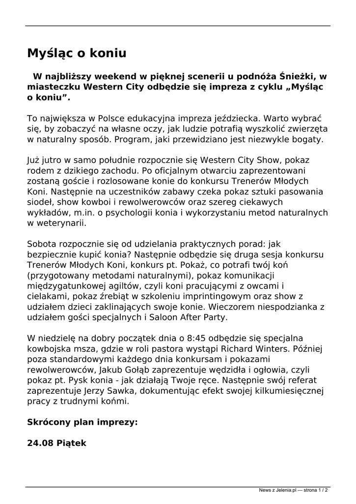 Myśląc o koniu W najbliższy weekend w pięknej scenerii u podnóża Śnieżki, w miasteczku Western City odbędzie się impreza z cyklu „Myśląc o koniu”. To największa w Polsce edukacyjna impreza jeździecka. Warto wybrać się, by zobaczyć na własne oczy, jak ludzie potrafią wyszkolić zwierzęta w naturalny sposób. Program, jaki przewidziano jest niezwykle bogaty. Już jutro w samo południe rozpocznie się Western City Show, pokaz rodem z dzikiego zachodu. Po oficjalnym otwarciu zaprezentowani zostaną goście i rozlosowane konie do konkursu Trenerów Młodych Koni. Następnie na uczestników zabawy czeka pokaz sztuki pasowania siodeł, show kowboi i rewolwerowców oraz szereg ciekawych wykładów, m.in. o psychologii konia i wykorzystaniu metod naturalnych w weterynarii. Sobota rozpocznie się od udzielania praktycznych porad: jak bezpiecznie kupić konia? Następnie odbędzie się druga sesja konkursu Trenerów Młodych Koni, konkurs pt. Pokaż, co potrafi twój koń (przygotowany metodami naturalnymi), pokaz komunikacji międzygatunkowej agiltów, czyli koni pracującymi z owcami i cielakami, pokaz źrebiąt w szkoleniu imprintingowym oraz show z udziałem dzieci zaklinających swoje konie. Wieczorem niespodzianka z udziałem gości specjalnych i Saloon After Party. W niedzielę na dobry początek dnia o 8:45 odbędzie się specjalna kowbojska msza, gdzie w roli pastora wystąpi Richard Winters. Później poza standardowymi każdego dnia konkursam i pokazami rewolwerowców, Jakub Gołąb zaprezentuje wędzidła i ogłowia, czyli pokaz pt. Pysk konia - jak działają Twoje ręce. Następnie swój referat zaprezentuje Jerzy Sawka, dokumentując efekt swojej kilkumiesięcznej pracy z trudnymi końmi. Skrócony plan imprezy: 24.08 Piątek News z Jelenia.pl — strona 1 / 2 18.00- zawody "zaklinacz koni" 25.08 Sobota 09.30- zawody "zaklinacz koni" 11.30- pokaz źrebiąt 13.00- agility psich chempionów 14.15- konkurs "pokaż co potrafi Twój koń" 15.30- naturalne dzieciaki 16.00- pokazy studentów JNBT 17.00 - zawody "zaklinaczy koni" 20.00 – Wieczorne show 26.08 Niedziela 10.0011.0015.3016.00- pokazy studentów JNBT zawody "zaklinacz koni" agility psich championów finał zawodów "zaklinaczy koni" Bardzo dokładny program zawodów na stronie organizatorów. Link do oryginalnej publikacji: http://jelenia.pl/Myslac_o_koniu_n912.html Wygenerowano: 02/03/2017 15:42:57 © Jelenia.pl News z Jelenia.pl — strona 2 / 2 Powered by TCPDF (www.tcpdf.org)