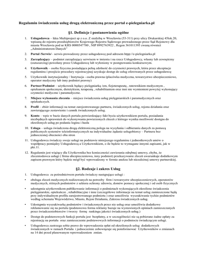 Regulamin świadczenia usług drogą elektroniczną przez portal e-pielegniarka.pl §1. Definicje i postanowienia ogólne 1. Usługodawca – Idea Multiproject sp z o.o. Z siedzibą w Wrocławiu (53-311) przy ulicy Drukarskiej 45lok.20, wpisaną do rejestru przedsiębiorców Krajowego Rejestru Sądowego prowadzonego przez Sąd Rejonowy dla miasta Wrocławia pod nr KRS 0000547780 , NIP 8992763922 , Regon 361011395 zwaną również „Administratorem Danych” 2. Portal /Serwis/– serwis prowadzony przez usługodawcę pod adresem htpp://e-pielegniarka.pl 3. Zarządzający – podmiot zarządzający serwisem w imieniu i na rzecz Usługodawcy, własny lub zewnętrzny (outsourcing) powołany przez Usługodawcę lub wyłoniony w postępowaniu konkursowym. 4. Użytkownik – osoba fizyczna posiadająca pełną zdolność do czynności prawnych, która przez akceptacje regulaminu i przejście procedury rejestracyjnej uzyskuje dostęp do usług oferowanych przez usługodawcę 5. Użytkownik instytucjonalny / Instytucja - osoba prawna (placówka medyczna, towarzystwo ubezpieczeniowe, operator medyczny lub inny podmiot prawny) 6. Partner/Podmiot – użytkownik będący pielęgniarką /em, fizjoterapeutą , ratownikiem medycznym , opiekunem społecznym, dietetykiem, terapeutą , rehabilitantem oraz inni nie wymienieni powyżej wykonujący czynności medyczne i paramedyczne. 7. Miejsce wykonania zlecenia – miejsce świadczenia usług pielęgniarskich i paramedycznych oraz opiekuńczych. 8. Profil – zbiór informacji na temat zarejestrowanego partnera, świadczonych usług, rejonu działania oraz zawierającego zestawienie i cennik świadczonych usług. 9. Konto – wpis w bazie danych portalu potwierdzający fakt bycia użytkownikiem portalu, posiadania niezbędnych uprawnień do wykonywania powierzonych zleceń z którego wynika możliwość dostępu do określonych usług po podaniu loginu i hasła 10. Usługa – usługa świadczona drogą elektroniczną polega na wysyłaniu i odbieraniu danych za pomocą publicznych systemów teleinformatycznych na indywidualne żądanie usługobiorcy – Partnera bez jednoczesnej obecności obu stron 11. Usługodawca świadczy swoje usługi na podstawie niniejszego regulaminu i jednostkowych umów o współpracy pomiędzy Usługodawcą a Użytkownikiem, o ile będzie to wymagane innymi zapisami, jak w pkt.11. 12. Regulamin jest wiążący dla Użytkownika bez konieczności zawierania odrębnej umowy, chyba, że zleceniodawca usługi ( firma ubezpieczeniowa, inny podmiot) przekazywanie zleceń uwarunkuje dodatkowym zapisem prawnym który będzie mógł być wprowadzony w formie aneksu lub niezależnej umowy partnerskiej. §2. Rodzaje i zakres Usług 1. Usługodawca za pośrednictwem portalu świadczy następujące usługi : • obsługa zleceń medycznych realizowanych na potrzeby firm i towarzystw ubezpieczeniowych, operatorów medycznych, różnych podmiotów z sektora ochrony zdrowia, domów pomocy społecznej i od osób fizycznych • udostępnia użytkownikom publikowanie informacji o podmiotach wykonujących określone świadczenia pielęgniarskie, opiekuńcze , rehabilitacyjne i inne (szczegółowe informacje na temat usług zamieszczone będą przy indywidualnym profilu zarejestrowanego podmiotu ) oraz umożliwia wyszukiwanie tychże podmiotów według schematu Województwo, Miasto, Rejon Działania, Zakresu świadczonych usług. • Udostępnia wyszukiwarkę podmiotów i świadczonych przez nie usług oraz umożliwia dodatkowe reklamowanie się na portalu (podstawowa forma reklamy bazuje na wystawionych opiniach zamieszczanych przez świadczeniobiorców i tworzy formę rankingu jakości świadczonych usług.) • Dostęp do podstawowych funkcji portalu jest bezpłatny, a w szczególności nie są pobierane żadne opłaty za rejestrację na portalu oraz zamieszczenie podstawowych informacji o podmiocie świadczącym usługi. • Usługodawca zastrzega sobie prawo do wprowadzenia opłat od określonych usług dodatkowych świadczonych w ramach Portalu i jednocześnie zobowiązuje się poinformować Użytkowników o zmianach na 14 dni przed planowanym wprowadzeniem zmian. §3. Warunki świadczenia usług 1. Warunkami technicznymi niezbędnymi do korzystania z Usług są:: • dostęp do sieci Internet • przeglądarka internetowa: Firefox, Chrome, Safari, IE lub Opera, zaktualizowana do najnowszej wersji • posiadanie aktywnego konta e-mail • posiadanie aktywnego i zweryfikowanego przez Portal numeru telefonu komórkowego ( zlecenia przekazywane w formie sms) 2. Każdy użytkownik Portalu może zapoznać się z informacjami i opiniami o innych użytkownikach i oferowanych przez nich usługach oraz korzystać z wyszukiwarki w celu odnalezienia podmiotu oferującego poszukiwaną usługę. 3. Użytkownik zalogowany na portalu i zweryfikowany na podstawie adresu e-mail i/ lub weryfikacji numeru telefonu może ponadto zamieszczać opinie na temat podmiotów z usług których korzystał. 4. Użytkownik może dodawać informacje na temat jakości i formy przeprowadzonych świadczeń na jego zlecenie 5. Użytkownik może uruchomić usługę obserwowania wytypowanych profili oraz uruchomić usługę powiadamiania o nowych opiniach na temat tych podmiotów 6. Użytkownik może zgłaszać wszelkie swoje wątpliwości i informować o ewentualnych nieprawidłowościach 7. Logowanie jest dostępne po zarejestrowaniu się Użytkownika. Następuje poprzez podanie loginu (adresu poczty elektronicznej) oraz hasła, ustalanego samodzielnie podczas rejestracji konta przez Użytkownika. 8. Usługę powiadamiania o nowych informacjach i opiniach uruchamia się poprzez oznaczenie wybranych usługodawców jako obserwowanych. 9. Usługodawca zastrzega sobie prawo do czasowego zawieszenia świadczenia Usług w związku z modernizacją lub przebudową Serwisu albo z pracami konserwatorskimi systemu teleinformatycznego. 10. Usługodawca nie odpowiada za przerwy w świadczeni