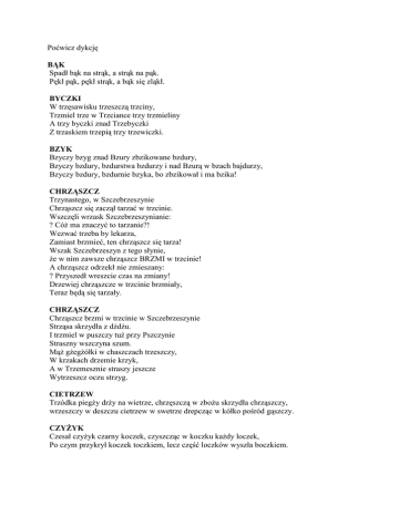 Poćwicz dykcję BĄK Spadł bąk na strąk, a strąk na pąk. Pękł pąk, pękł strąk, a bąk się zląkł. BYCZKI W trzęsawisku trzeszczą trzciny, Trzmiel trze w Trzciance trzy trzmieliny A trzy byczki znad Trzebyczki Z trzaskiem trzepią trzy trzewiczki. BZYK Bzyczy bzyg znad Bzury zbzikowane bzdury, Bzyczy bzdury, bzdurstwa bzdurzy i nad Bzurą w bzach bajdurzy, Bzyczy bzdury, bzdurnie bzyka, bo zbzikował i ma bzika! CHRZĄSZCZ Trzynastego, w Szczebrzeszynie Chrząszcz się zaczął tarzać w trzcinie. Wszczęli wrzask Szczebrzeszynianie: ? Cóż ma znaczyć to tarzanie?! Wezwać trzeba by lekarza, Zamiast brzmieć, ten chrząszcz się tarza! Wszak Szczebrzeszyn z tego słynie, że w nim zawsze chrząszcz BRZMI w trzcinie! A chrząszcz odrzekł nie zmieszany: ? Przyszedł wreszcie czas na zmiany! Drzewiej chrząszcze w trzcinie brzmiały, Teraz będą się tarzały. CHRZĄSZCZ Chrząszcz brzmi w trzcinie w Szczebrzeszynie Strząsa skrzydła z dżdżu. I trzmiel w puszczy tuż przy Pszczynie Straszny wszczyna szum. Mąż gżegżółki w chaszczach trzeszczy, W krzakach drzemie krzyk, A w Trzemesznie straszy jeszcze Wytrzeszcz oczu strzyg. CIETRZEW Trzódka piegży drży na wietrze, chrzęszczą w zbożu skrzydła chrząszczy, wrzeszczy w deszczu cietrzew w swetrze drepcząc w kółko pośród gąszczy. CZYŻYK Czesał czyżyk czarny koczek, czyszcząc w koczku każdy loczek, Po czym przykrył koczek toczkiem, lecz część loczków wyszła boczkiem. DZIĘCIOŁ Czarny dzięcioł z chęcią pień ciął. GORYL Turlał goryl po Urlach kolorowe korale, Rudy góral kartofle tarł na tarce wytrwale, Gdy spotkali się w Urlach góral tarł, goryl turlał chociaż sensu nie było w tym wcale. HUCZEK Hasał huczek z tłuczkiem wnuczka i niechcący huknął żuczka. ? Ale heca... - wnuczek mruknął i z hurkotem w hełm się stuknął. Leży żuczek, leży wnuczek, a pomiędzy nimi tłuczek. Stąd dla huczka jest nauczka by nie hasać z tłuczkiem wnuczka. JAMNIK W grząskich trzcinach i szuwarach kroczy jamnik w szarawarach, Szarpie kłącza oczeretu i przytracza do beretu, Ważkom pęki skrzypu wręcza, traszkom suchych trzcin naręcza, A gdy zmierzchać się zaczyna z jaszczurkami sprzeczkę wszczyna, Po czym znika w oczerecie w szarawarach i berecie.... KRÓLIK Kurkiem kranu kręci kruk, kroplą tranu brudząc bruk, A przy kranie, robiąc pranie, królik gra na fortepianie. KRUK Za parkanem wśród kur na podwórku kroczył kruk w purpurowym kapturku, Raptem strasznie zakrakał i zrobiła się draka, bo mu kura ukradła robaka. MUSZKA Mała muszka spod Łopuszki chciała mieć różowe nóżki ? Różdżką nóżki czarowała, lecz wciąż nóżki czarne miała. ? Po cóż czary, moja muszko? Ruszże móżdżkiem, a nie różdżką! Wyrzuć wreszcie różdżkę wróżki i unurzaj w różu nóżki! PCHŁA Na peronie w Poroninie pchła pląsała po pianinie. Przytupnęła, podskoczyła i pianino przewróciła. SZCZENIAK W gąszczu szczawiu we Wrzeszczu klaszczą kleszcze na deszczu, Szepcze szczygieł w szczelinie, szczeka szczeniak w Szczuczynie, Piszczy pszczoła pod Pszczyną, świszcze świerszcz pod leszczyną, A trzy pliszki i liszka taszczą płaszcze w Szypliszkach. TRZNADLE W krzakach rzekł do trznadla trznadel: ? Możesz mi pożyczyć szpadel? Muszę nim przetrzebić chaszcze, bo w nich straszą straszne paszcze. Odrzekł na to drugi trznadel: ? Niepotrzebny, trznadlu, szpadel! Gdy wytrzeszczysz oczy w chaszczach, z krzykiem pierzchnie każda, paszcza! ŻABA Warzy żaba smar, pełen smaru gar, Z wnętrza gara bucha para, z pieca bucha żar, Smar jest w garze, gar na żarze, wrze na żarze smar. DESZCZ (Spróbuj powiedzieć ten tekst na jednym oddechu) Deszcz pluszcze w bluszczach puszczy w bluszczach puszczy pluszcze deszcz chłoszcze śmiele w trzcinach trzmiele dźga dżdżownice w prężny grzbiet Dżdża wypluszcze się pojutrze a nazajutrz tęczy sztuk trzy sztukmistrz z Tczewa strząśnie z nieb sztukmistrz z Tczewa strząśnie z nieb OŚLISKO Raz oślisko, najgłupsze ze wszystkich oślisk, Wpadło w poślizg. Ooo! Ślisko! - wrzasnęło oślisko, Lecz to nie wszystko. Oślisko, bowiem, to wam powiem, Strzyknęło śliną i strasznie szałowo Głośno śpiewając, trzęsło głową. I stąd nieszczęsny poślizg ośliska. I na ośliska przychodzi "kryska". TRZMIEL W wysuszonych sczerniałych trzcinowych szuwarach sześcionogi szczwany trzmiel bezczelnie szeleścił w szczawiu trzymając w szczękach strzęp szczypiorku i często trzepocąc skrzydłami. POCZMISTRZ Poczmistrz z Tczewa, rotmistrz z Czchowa. HERBST Przyszedł Herbst z pstrągami i słuchał oszczerstw z wstrętem.