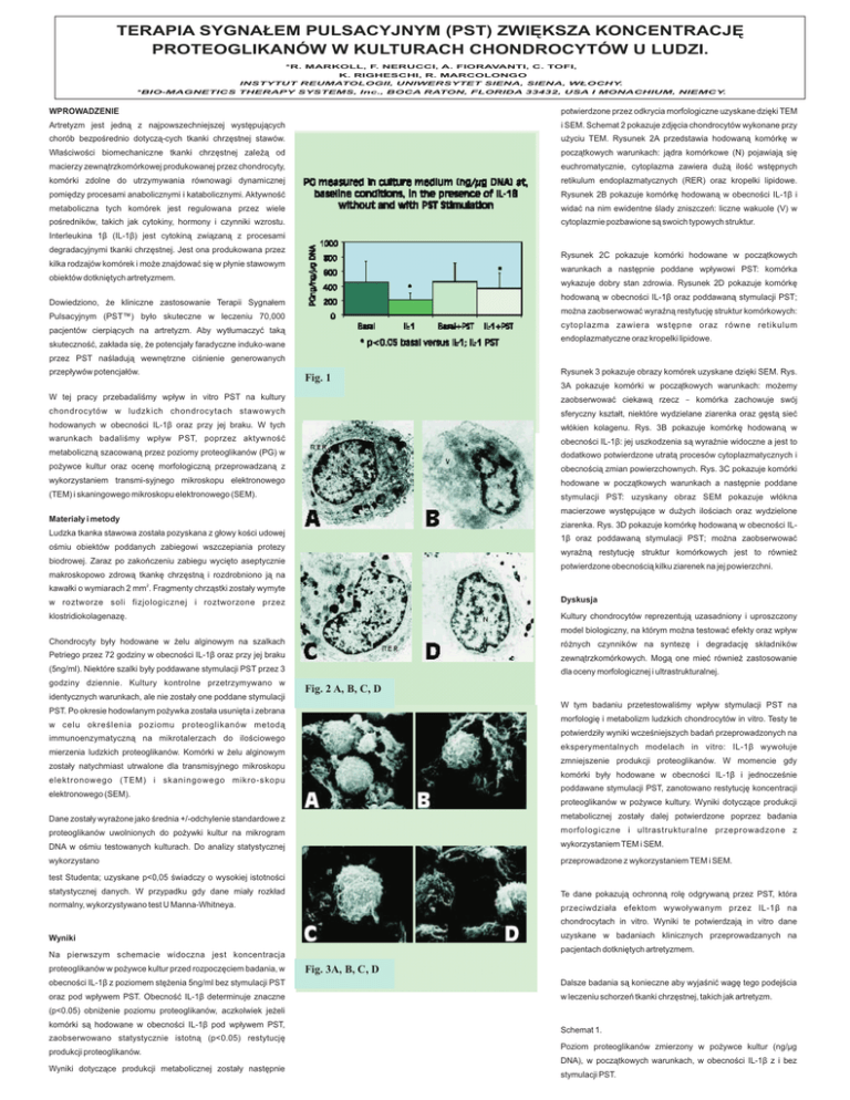 TERAPIA SYGNAÙEM PULSACYJNYM (PST) ZWIÆKSZA KONCENTRACJÆ PROTEOGLIKANÓW W KULTURACH CHONDROCYTÓW U LUDZI. *R. MARKOLL, F. NERUCCI, A. FIORAVANTI, C. TOFI, K. RIGHESCHI, R. MARCOLONGO INSTYTUT REUMATOLOGII, UNIWERSYTET SIENA, SIENA, WÙOCHY. *BIO-MAGNETICS THERAPY SYSTEMS, Inc., BOCA RATON, FLORIDA 33432, USA I MONACHIUM, NIEMCY. WPROWADZENIE potwierdzone przez odkrycia morfologiczne uzyskane dziæki TEM Artretyzm jest jednà z najpowszechniejszej wystæpujàcych i SEM. Schemat 2 pokazuje zdjæcia chondrocytów wykonane przy chorób bezpoúrednio dotyczà-cych tkanki chrzæstnej stawów. uýyciu TEM. Rysunek 2A przedstawia hodowanà komórkæ w Wùaúciwoúci biomechaniczne tkanki chrzæstnej zaleýà od poczàtkowych warunkach: jàdra komórkowe (N) pojawiajà siæ macierzy zewnàtrzkomórkowej produkowanej przez chondrocyty, euchromatycznie, cytoplazma zawiera duýà iloúã wstæpnych komórki zdolne do utrzymywania równowagi dynamicznej retikulum endoplazmatycznych (RER) oraz kropelki lipidowe. pomiædzy procesami anabolicznymi i katabolicznymi. Aktywnoúã Rysunek 2B pokazuje komórkæ hodowanà w obecnoúci IL-1â i metaboliczna tych komórek jest regulowana przez wiele widaã na nim ewidentne úlady zniszczeñ: liczne wakuole (V) w poúredników, takich jak cytokiny, hormony i czynniki wzrostu. cytoplazmie pozbawione sà swoich typowych struktur. Interleukina 1â (IL-1â) jest cytokinà zwiàzanà z procesami degradacyjnymi tkanki chrzæstnej. Jest ona produkowana przez Rysunek 2C pokazuje komórki hodowane w poczàtkowych kilka rodzajów komórek i moýe znajdowaã siæ w pùynie stawowym warunkach a nastæpnie poddane wpùywowi PST: komórka obiektów dotkniætych artretyzmem. wykazuje dobry stan zdrowia. Rysunek 2D pokazuje komórkæ hodowanà w obecnoúci IL-1â oraz poddawanà stymulacji PST; Dowiedziono, ýe kliniczne zastosowanie Terapii Sygnaùem moýna zaobserwowaã wyraênà restytucjæ struktur komórkowych: Pulsacyjnym (PST™) byùo skuteczne w leczeniu 70,000 cytoplazma zawiera wstæpne oraz równe retikulum pacjentów cierpiàcych na artretyzm. Aby wytùumaczyã takà endoplazmatyczne oraz kropelki lipidowe. skutecznoúã, zakùada siæ, ýe potencjaùy faradyczne induko-wane przez PST naúladujà wewnætrzne ciúnienie generowanych przepùywów potencjaùów. Fig. 1 Rysunek 3 pokazuje obrazy komórek uzyskane dziæki SEM. Rys. 3A pokazuje komórki w poczàtkowych warunkach: moýemy W tej pracy przebadaliúmy wpùyw in vitro PST na kultury zaobserwowaã ciekawà rzecz – komórka zachowuje swój chondrocytów w ludzkich chondrocytach stawowych sferyczny ksztaùt, niektóre wydzielane ziarenka oraz gæstà sieã hodowanych w obecnoúci IL-1â oraz przy jej braku. W tych wùókien kolagenu. Rys. 3B pokazuje komórkæ hodowanà w warunkach badaliúmy wpùyw PST, poprzez aktywnoúã obecnoúci IL-1â: jej uszkodzenia sà wyraênie widoczne a jest to metabolicznà szacowanà przez poziomy proteoglikanów (PG) w dodatkowo potwierdzone utratà procesów cytoplazmatycznych i poýywce kultur oraz ocenæ morfologicznà przeprowadzanà z obecnoúcià zmian powierzchownych. Rys. 3C pokazuje komórki wykorzystaniem transmi-syjnego mikroskopu elektronowego hodowane w poczàtkowych warunkach a nastæpnie poddane (TEM) i skaningowego mikroskopu elektronowego (SEM). stymulacji PST: uzyskany obraz SEM pokazuje wùókna macierzowe wystæpujàce w duýych iloúciach oraz wydzielone Materiaùy i metody ziarenka. Rys. 3D pokazuje komórkæ hodowanà w obecnoúci IL- Ludzka tkanka stawowa zostaùa pozyskana z gùowy koúci udowej 1â oraz poddawanà stymulacji PST; moýna zaobserwowaã oúmiu obiektów poddanych zabiegowi wszczepiania protezy wyraênà restytucjæ struktur komórkowych jest to równieý biodrowej. Zaraz po zakoñczeniu zabiegu wyciæto aseptycznie potwierdzone obecnoúcià kilku ziarenek na jej powierzchni. makroskopowo zdrowà tkankæ chrzæstnà i rozdrobniono jà na 2 kawaùki o wymiarach 2 mm . Fragmenty chrzàstki zostaùy wymyte w roztworze soli fizjologicznej i roztworzone przez Dyskusja klostridiokolagenazæ. Kultury chondrocytów reprezentujà uzasadniony i uproszczony Chondrocyty byùy hodowane w ýelu alginowym na szalkach róýnych czynników na syntezæ i degradacjæ skùadników model biologiczny, na którym moýna testowaã efekty oraz wpùyw Petriego przez 72 godziny w obecnoúci IL-1â oraz przy jej braku zewnàtrzkomórkowych. Mogà one mieã równieý zastosowanie (5ng/ml). Niektóre szalki byùy poddawane stymulacji PST przez 3 dla oceny morfologicznej i ultrastrukturalnej. godziny dziennie. Kultury kontrolne przetrzymywano w identycznych warunkach, ale nie zostaùy one poddane stymulacji Fig. 2 A, B, C, D W tym badaniu przetestowaliúmy wpùyw stymulacji PST na PST. Po okresie hodowlanym poýywka zostaùa usuniæta i zebrana morfologiæ i metabolizm ludzkich chondrocytów in vitro. Testy te w celu okreúlenia poziomu proteoglikanów metodà potwierdziùy wyniki wczeúniejszych badañ przeprowadzonych na immunoenzymatycznà na mikrotalerzach do iloúciowego eksperymentalnych modelach in vitro: IL-1â wywoùuje mierzenia ludzkich proteoglikanów. Komórki w ýelu alginowym zmniejszenie produkcji proteoglikanów. W momencie gdy zostaùy natychmiast utrwalone dla transmisyjnego mikroskopu komórki byùy hodowane w obecnoúci IL-1â i jednoczeúnie elektronowego (TEM) i skaningowego mikro-skopu poddawane stymulacji PST, zanotowano restytucjæ koncentracji elektronowego (SEM). proteoglikanów w poýywce kultury. Wyniki dotyczàce produkcji Dane zostaùy wyraýone jako úrednia +/-odchylenie standardowe z metabolicznej zostaùy dalej potwierdzone poprzez badania proteoglikanów uwolnionych do poýywki kultur na mikrogram morfologiczne i ultrastrukturalne przeprowadzone z DNA w oúmiu testowanych kulturach. Do analizy statystycznej wykorzystaniem TEM i SEM. wykorzystano przeprowadzone z wykorzystaniem TEM i SEM. test Studenta; uzyskane p<0,05 úwiadczy 
