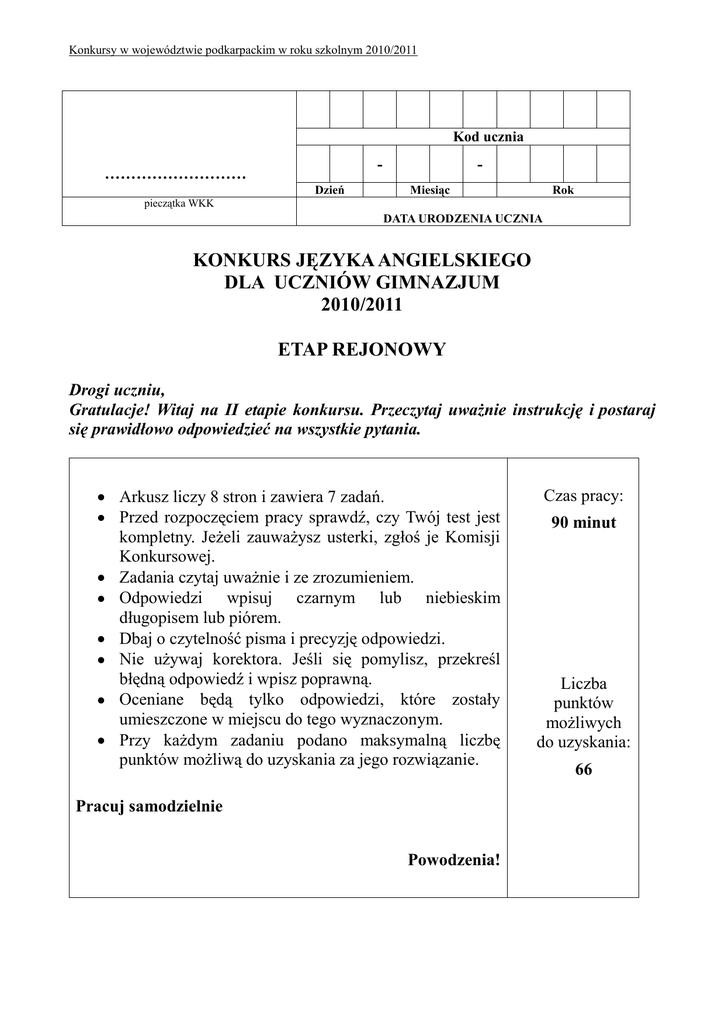 Konkursy w województwie podkarpackim w roku szkolnym 2010/2011 Kod ucznia - ……………………… Dzień Miesiąc Rok pieczątka WKK DATA URODZENIA UCZNIA KONKURS JĘZYKA ANGIELSKIEGO DLA UCZNIÓW GIMNAZJUM 2010/2011 ETAP REJONOWY Drogi uczniu, Gratulacje! Witaj na II etapie konkursu. Przeczytaj uważnie instrukcję i postaraj się prawidłowo odpowiedzieć na wszystkie pytania. Arkusz liczy 8 stron i zawiera 7 zadań. Przed rozpoczęciem pracy sprawdź, czy Twój test jest kompletny. Jeżeli zauważysz usterki, zgłoś je Komisji Konkursowej. Zadania czytaj uważnie i ze zrozumieniem. Odpowiedzi wpisuj czarnym lub niebieskim długopisem lub piórem. Dbaj o czytelność pisma i precyzję odpowiedzi. Nie używaj korektora. Jeśli się pomylisz, przekreśl błędną odpowiedź i wpisz poprawną. Oceniane będą tylko odpowiedzi, które zostały umieszczone w miejscu do tego wyznaczonym. Przy każdym zadaniu podano maksymalną liczbę punktów możliwą do uzyskania za jego rozwiązanie. Pracuj samodzielnie Powodzenia! Czas pracy: 90 minut Liczba punktów możliwych do uzyskania: 66 Konkursy w województwie podkarpackim w roku szkolnym 2010/2011 Zadanie 1 (0-8 punktów) Przeczytaj uważnie artykuł. Połącz nagłówki 1- 8 z odpowiednimi częściami artykułu A – G, wpisz odpowiedzi w puste miejsca. Jeden nagłówek nie pasuje do części artykułu. The Life and Work of J. Tolkein. Many authors become masters of a particular genre of fiction. But very few can claim to have had such an effect that they virtually have created the genre for themselves. One such author is J R R Tolkein. From his prolific imagination was created not only Middle Earth; the stage for his giant fantasy The Lord of the Rings, but also a whole genre of fantasy fiction which has since become known as "sword and sorcery". Before Tolkein's work was published, fantasy was set in what was very near to the present for the authors. Also, the genre was very close to horror, and authors such as Lovell and Bram Stoker moved easily between the two. The the great American writer Edgar Allen Poe had recently brought out a work of what we would today call horror stories, but he had entitled it Tales of Mystery and Imagination, suggesting that he thought of it as fantasy. Tolkein's distinctive contribution was to create a pseudo-medieval world and to populate it with wise wizards, bold knights, and a massive cast of other characters, including dwarfs, elves, and most of the other creatures of our folk memory. He also created his own contribution, the hobbit. Hobbits were small people, who had distinctive hairy feet. They were characterised by honest common sense and rather complex social lives. In all his works, it is evidently the hobbits with whom Tolkein sympathises the most. What madeTolkein's work so compelling was that it was a perfectly realised work of fantasy. Every detail in his stories rings true. This is because Tolkein spent so much time working and thinking about Middle Earth that the actual part which we have on paper is only a fraction of his research. His later books show clearly to what extent he had created this entire world, complete with detailed maps and even the languages of the major protagonists. Strona 2 z 8 Konkursy w województwie podkarpackim w roku szkolnym 2010/2011 However, although Middle Earth is a towering work of fantasy, it has roots in reality. The Middle Earth of Tolkein is close to his own native Oxfordshire, both in the landscapeof the Shire, and above all in the reactions and behaviour of its characters. The ethos is that of pre-war England, possibly because Tolkein could conceive of no other mode of behaviour, but more probably because his book can be read on many levels, and in only the most basic of the levels is the great struggle between light and darkness completely. It must be remembered that Tolkein was writing in a time when one Great War had just finished, and another was about to begin. In his book, he stresses the bravery, and endurance of the small people without whom victory is impossible. This was the lesson that Tolkein felt had to be learned from the horrors of the Great War - the desicions which shape the destiny of nations are taken by an elite group, but they are implemented by the common people of the country. Though his book brought him world-wide fame, Tolkein continued to live modestly at Oxford University, where he worked. He was a close friend of another great writer of his day, C.S. Lewis, who also taught there. However, while Lewis was more relaxed about his fame, Tolkein never really got used to it, and he was quite embarrassed by the admiration of the many tourists who came to see him. 1. How to make fantasy seem real. 2. A new best-seller. 3. Fantasy before Tolkein 4. The Master of Middle Earth. 5. A quiet man 6. The real Middle Earth 7. A new fantasy creature. 8. The experience of war Strona 3 z 8 Konkursy w województwie podkarpackim w roku szkolnym 2010/2011 Zadanie 2. (0-16 punktów) Wstaw podane wyrazy w odpowiednie luki w tekście, tak aby tekst stanowił logiczną całość. Nie zmieniaj formy podanych wyrazów. London may soon be changing the __________ (1)of shoppers in the city and helping the environment by banning the __________(2) of the ubiquitous plastic shopping bag. break society Estimates are that Londoners and tourists use 1.6 billion plastic bags each year, many of which are __________(3) away after just one use. Shoppers may soon have to buy __________(4) bags in an attempt to reduce the strain on landfill sites, where use issue reusable the bags take 400 years to __________(5) down. Local authorities have asked the British government to ban __________(6) from giving away free plastic bags. A spokesman said stores should sell reusable bags and pass the money raised on to environmental projects. “As habits retailers thrown a __________(7), we need to do far more to reduce the amount of waste we are sending to landfill and London