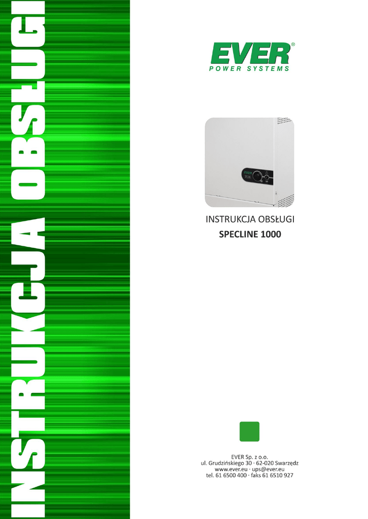 Instrukcja obsługi zasilaczy serii SPECLINE 1000 SPIS TREŚCI SPIS TREŚCI ........................................................................................................................... 2 WSTĘP...................................................................................................................................... 3 INFORMACJE OGÓLNE ...................................................................................................... 3 PRZEZNACZENIE ZASILACZA .........................................................................................3 OGÓLNA CHARAKTERYSTYKA ZASILACZY ...............................................................4 INSTRUKCJA BHP ................................................................................................................ 4 PRZENOSZENIE ...................................................................................................................4 BEZPIECZEŃSTWO ELEKTRYCZNE................................................................................5 INSTALACJA .......................................................................................................................... 6 ROZPAKOWANIE ................................................................................................................6 WYBÓR MIEJSCA INSTALACJI ........................................................................................6 BUDOWA ZASILACZA I MODUŁU BATERYJNEGO .....................................................7 PANEL CZOŁOWY ........................................................................................................... 7 PANEL PRZYŁĄCZENIOWY ZASILACZA (po demontażu osłony) .................................. 8 PANEL PRZYŁĄCZENIOWY MODUŁU BATERYJNEGO (po demontażu osłony) ......... 9 PODŁACZENIE MODUŁÓW BATERYJNYCH .................................................................9 UKŁAD POŁĄCZEŃ ZASILACZA SPECLINE 1000 Z MODUŁAMI BATERYJNYMI SPECLINE 700 ................................................................................................................ 10 UKŁAD POŁĄCZEŃ ZASILACZA SPECLINE 1000 Z MODUŁAMI BATERYJNYMI SPECLINE 1000 .............................................................................................................. 10 EPO .......................................................................................................................................11 PIERWSZE URUCHOMIENIE ...........................................................................................11 URUCHAMIANIE ZASILACZA BEZ PODŁĄCZONEJ SIECI – “ZIMNY START” .....12 CHARAKTERYSTYKA PRACY ZASILACZA ............................................................... 13 INFORMACJE OGÓLNE ....................................................................................................13 ZABEZPIECZENIA ZASILACZA ......................................................................................14 UWAGI EKSPLOATACYJNE ............................................................................................ 15 WYMIANA BEZPIECZNIKA SIECIOWEGO W ZASILACZU .......................................15 WSPÓŁPRACA Z AGREGATAMI PRĄDOTWÓRCZYMI .............................................16 PRZECHOWYWANIE, KONSERWACJA I TRANSPORT ..............................................16 UTYLIZACJA ......................................................................................................................16 PARAMETRY TECHNICZE............................................................................................... 17 INFORMACJE DOTYCZĄCE PRZEPISÓW I GWARANCJI ...................................... 18 DEKLARACJA ZGODNOŚCI ............................................................................................18 GWARANCJA .....................................................................................................................18 2012/07/25 Pomoc Techniczna, tel.: +48 61 6500 400 www.ever.eu 2 Instrukcja obsługi zasilaczy serii SPECLINE 1000 WSTĘP Dziękujemy Państwu za zakup zasilacza UPS EVER SPECLINE 1000. Jest to najnowsza seria zaawansowanych technologicznie zasilaczy przeznaczonych przede wszystkim do zabezpieczania pracy kotłów c.o., kominków z płaszczem wodnym, pomp oraz układów solarnych. Zainstalowanie urządzenia z tej serii gwarantuje poprawną pracę chronionych odbiorników przez wiele godzin mimo braku zasilania sieciowego, dzięki możliwości łączenia ze sobą równolegle modułów bateryjnych. Urządzenia w trybie pracy bateryjnej generują na wyjściu przebieg sinusoidalny dzięki systemowi Clear Digital Sinus (CDS). UPS-y serii SPECLINE zostały zaprojektowane w taki sposób, aby jak najlepiej spełnić wszelkie Państwa oczekiwania, dotyczące zabezpieczenia przed skutkami awarii zasilania sieciowego. Zasilacze skonstruowano w Polsce, a ich budowa jest zgodna z wymogami oznaczenia CE. INFORMACJE OGÓLNE PRZEZNACZENIE ZASILACZA Zasilacz EVER SPECLINE 1000 zabezpiecza urządzenia do niego podłączone przed zanikami napięcia w sieci, chroni przed spadkiem napięcia oraz eliminuje możliwość uszkodzeń w wyniku przepięć w sieci elektrycznej. Głównym jego przeznaczeniem jest zabezpieczenie pracy kotłów centralnego ogrzewania, kominków z płaszczem wodnym, układów solarnych, układów sterowania oraz automatyki, wymagających długich czasów podtrzymania. Można go wykorzystać również do zasilania sprzętu telekomunikacyjnego (centralki, faksy) oraz systemów alarmowych. W przypadku zabezpieczania innych, specyficznych odbiorników prosimy o kontakt z pomocą techniczną. 2012/07/25 Pomoc Techniczna, tel.: +48 61 6500 400 www.ever.eu 3 Instrukcja obsługi zasilaczy serii SPECLINE 1000 OGÓLNA CHARAKTERYSTYKA ZASILACZY system CLEAR DIGITAL SINUS – system generacji napięcia wyjściowego o kształcie sinusoidalnym. Takie rozwiązanie daje szersze możliwości podłączania urządzeń czułych na