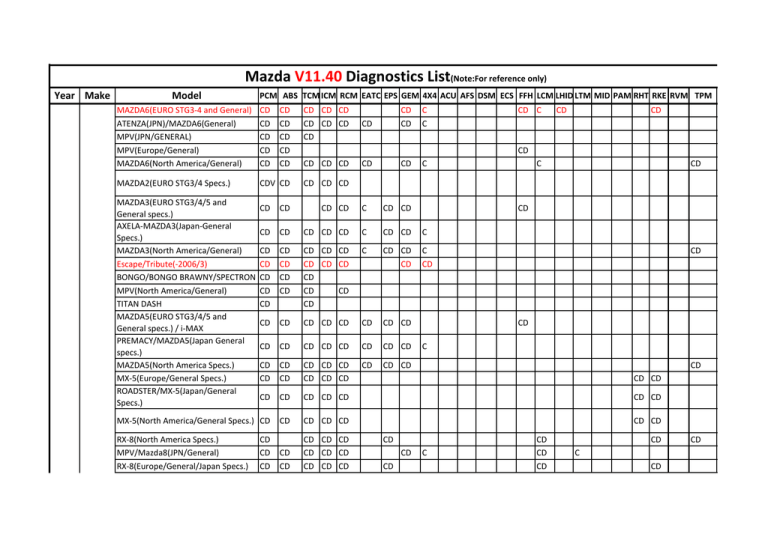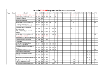 Mazda V11.40 Diagnostics List(Note:For reference only) Year Make Model PCM ABS TCM ICM RCM EATC EPS GEM 4X4 ACU AFS DSM ECS FFH LCM LHID LTM MID PAM RHT RKE RVM TPM MAZDA6(EURO STG3-4 and General) ATENZA(JPN)/MAZDA6(General) MPV(JPN/GENERAL) MPV(Europe/General) MAZDA6(North America/General) CD CD CD CD CD CD CD CD CD CD CD CD CD CD CD CD CD CD CD CD C C CD CD CD CD CD C MAZDA2(EURO STG3/4 Specs.) CDV CD CD CD CD MAZDA3(EURO STG3/4/5 and General specs.) AXELA-MAZDA3(Japan-General Specs.) MAZDA3(North America/General) Escape/Tribute(-2006/3) BONGO/BONGO BRAWNY/SPECTRON MPV(North America/General) TITAN DASH MAZDA5(EURO STG3/4/5 and General specs.) / i-MAX PREMACY/MAZDA5(Japan General specs.) MAZDA5(North America Specs.) MX-5(Europe/General Specs.) ROADSTER/MX-5(Japan/General Specs.) CD C CD CD CD C CD CD CD CD CD C CD CD CD CD CD CD CD C CD CD C CD CD CD CD CD CD CD CD CD CD CD CD CD CD CD CD CD CD CD C CD CD CD C CD CD CD CD CD CD CD CD CD CD CD CD CD CD CD CD CD CD CD CD CD CD CD CD CD CD CD CD CD CD CD CD CD CD CD CD CD MX-5(North America/General Specs.) CD CD CD CD CD CD CD CD CD CD CD CD CD CD CD CD CD CD RX-8(North America Specs.) MPV/Mazda8(JPN/General) RX-8(Europe/General/Japan Specs.) CD CD CD CD CD CD C CD CD CD CD CD CD C CD CD CD CD C CD CD Mazda V11.40 Diagnostics List(Note:For reference only) Year Make 2001MAZDA 2014 Model PCM ABS TCM ICM RCM EATC EPS GEM 4X4 ACU AFS DSM ECS FFH LCM LHID LTM MID PAM RHT RKE RVM TPM Escape/Tribute(2006/4-) CX-7(North America/General Specs.) CX-7(Japan/General Specs.) CX-9(North America/General Specs.) CX-7(Europe/General Specs.) DEMIO(JPN)–VERISA(JPN)MAZDA2(General) CD CD CD CD CD CD CD CD CD CD CD CD BT-50/Ranger CD CD CD PROTÉGÉ DEMIO(JPN)/MAZDA2(General) MAZDA2(Europe) MAZDA2(China) MAZDA6(GH,Before Facelift) CD CD CD CD CD CD CD CD CD CD CD CD CD CD CD CD CD CD CD CD CD CD CD MAZDA6(GH,After Facelift)/ATENZA CD CD CD CD CD CD CD CD C 626/626 WAGON/TELSTAR LASER/323/TIERRA PREMACY/IXION PREMACY Biante(Japan) MAZDA3(China/General) FAMILIA/LASER MX-5 AZ/WAGON(MJ) XEDOS9 CD CD CD CD CD CD CD CD CD CD CD CD CD CD CD CD CD CD CD CD CD CD CD CD CD CD CD CD CD CD C CD CD CD CD CD CD CD CD CD CD CD CD CD CD CD CD CD CD CD CD CD CD CD CD CD C C C C C C C C CD CD CD CD CD CD CD CD CD CD CD C C CD CD CD CD CD CD CD C CD CD C CD CD CD C CD CD CD Mazda V11.40 Diagnostics List(Note:For reference only) Year Make Model CAPELLA/CAPELLA W/TELSTAR /TELSTAR W DEMIO/121 DEMIO/121 DEMIO/FESTIVA MINI WAGON FRIENDEE/FREDA/BONGO FRIENDEE BONGO BRAWNY/ECONOVAN/ MAZDA E-SERIES Fiesta/Mazda 121/Bantam MX-5 MIATA ROADSTER/MX-5 Escape/Tribute/Maverick PCM ABS TCM ICM RCM EATC EPS GEM 4X4 ACU AFS DSM ECS FFH LCM LHID LTM MID PAM RHT RKE RVM TPM CD CD CD CD CD CD CD CD CD CD CD CD CD CD CD CD CD CD CD CD C CD (All MY05)Escape/Tribute/Maverick/ CD Mariner CD CD CD CD C CD CD CD C CD CD CD CD CD CD CD CD CD CD CD CD CD CD CD CD CD CD CD CD CD CD CD CD CD CD CD CD CD CD CD CD CD CD CD CD CD C C CD CD CD MAZDA6(China) Millenia AXELA/MAZDA3 B-Series/Bravo/Fighter/Courier/ Ranger/Everest/Endeavour MARVIE MAZDA 929 MILLENIA/EUNOS 800 Ranger/Mazda B-Series/Courier MAZDA6(Middle East/General) Ranger/Courier/Mazda BSeries/Bravo Escape/Tribute/Mariner PREMACY/MAZDA5 DEMIO(JAN)/MAZDA2(OTHER) CD CD CD CD CD CD CD CD CD CD CD CD CD CD CD CD CD CD C C CD CD C CD CD CD CD CD CD C C C CD CD CD Mazda V11.40 Diagnostics List(Note:For reference only) Year Make Model Econovan Note : PCM ABS TCM ICM RCM EATC EPS GEM 4X4 ACU AFS DSM ECS FFH LCM LHID LTM MID PAM RHT RKE RVM TPM CD DTC C Data Display D (*):Tested; (?):Manual on website Note:All description rights reserved by Icarsoft Technology Inc. C VSM VSM CD VSM CD VSM