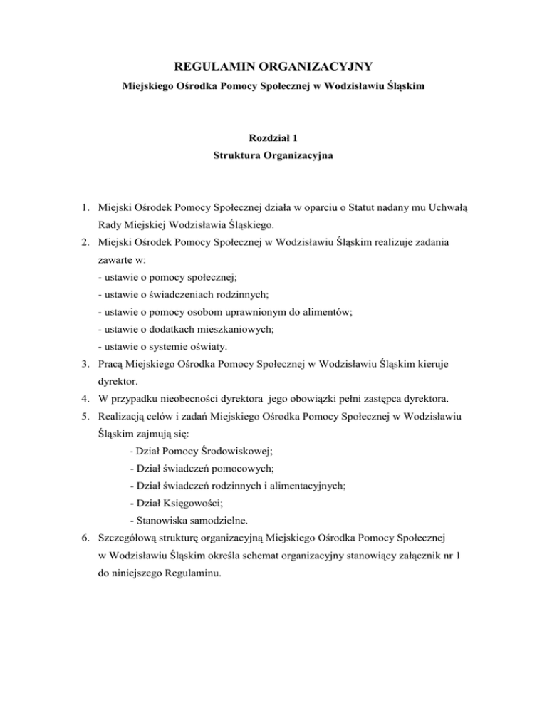 REGULAMIN ORGANIZACYJNY Miejskiego Ośrodka Pomocy Społecznej w Wodzisławiu Śląskim Rozdział 1 Struktura Organizacyjna 1. Miejski Ośrodek Pomocy Społecznej działa w oparciu o Statut nadany mu Uchwałą Rady Miejskiej Wodzisławia Śląskiego. 2. Miejski Ośrodek Pomocy Społecznej w Wodzisławiu Śląskim realizuje zadania zawarte w: - ustawie o pomocy społecznej; - ustawie o świadczeniach rodzinnych; - ustawie o pomocy osobom uprawnionym do alimentów; - ustawie o dodatkach mieszkaniowych; - ustawie o systemie oświaty. 3. Pracą Miejskiego Ośrodka Pomocy Społecznej w Wodzisławiu Śląskim kieruje dyrektor. 4. W przypadku nieobecności dyrektora jego obowiązki pełni zastępca dyrektora. 5. Realizacją celów i zadań Miejskiego Ośrodka Pomocy Społecznej w Wodzisławiu Śląskim zajmują się: - Dział Pomocy Środowiskowej; - Dział świadczeń pomocowych; - Dział świadczeń rodzinnych i alimentacyjnych; - Dział Księgowości; - Stanowiska samodzielne. 6. Szczegółową strukturę organizacyjną Miejskiego Ośrodka Pomocy Społecznej w Wodzisławiu Śląskim określa schemat organizacyjny stanowiący załącznik nr 1 do niniejszego Regulaminu. Rozdział II Wewnętrzny podział zadań i odpowiedzialności Dyrektor 1. Dyrektorowi Miejskiego Ośrodka Pomocy Społecznej podlega bezpośrednio jego zastępca, główny księgowy, konsultant, koordynator ds komputeryzacji, pracownik kancelarii, koordynatorzy projektów współfinansowanych ze środków zewnętrznych, sprzątaczka oraz pośrednio wszyscy pracownicy. 2. Do podstawowych zadań dyrektora Ośrodka należą w szczególności: - realizacja ustawowych i statutowych zadań Ośrodka; - zarządzanie Ośrodkiem na podstawie upoważnień i pełnomocnictw udzielonych przez Prezydenta Miasta Wodzisławia Śląskiego określających jego uprawnienia i kompetencje; - wydawanie decyzji administracyjnych w związku z realizacją ustawowych i statutowych zadań Ośrodka; - zatrudnianie, zaszeregowywanie, awansowanie oraz zwalnianie pracowników Ośrodka i realizowanie zadań pracodawcy w rozumieniu przepisów prawa pracy; - tworzenie i znoszenie stanowisk pracy w Ośrodku; - ustalanie zakresu zadań pracowników na poszczególnych stanowiskach pracy; - sprawowanie nadzoru nad prawidłowym funkcjonowaniem Ośrodka; - sprawowanie skutecznej i efektywnej kontroli zarządczej; - nadzorowanie realizacji procedury zarządzania ryzykiem; - zarządzanie mieniem Ośrodka - pełnienie obowiązków kierownika projektów współfinansowanych ze środków zewnętrznych. Zastępca dyrektora 1. Zastępca dyrektora sprawuje nadzór nad Działem świadczeń pomocowych, Działem świadczeń rodzinnych i alimentacyjnych i Działem Pomocy Środowiskowej oraz prowadzi sprawy kadrowe Ośrodka. Do podstawowych zadań zastępcy dyrektora Ośrodka należą w szczególności: - pełnienie zastępstwa podczas nieobecności dyrektora; - przygotowywanie dokumentacji związanej z naborem, zatrudnianiem i zwalnianiem pracowników Ośrodka; - prowadzenie akt osobowych i ewidencji pracowników zgodnie z obowiązującymi przepisami; - prowadzenie ewidencji urlopów pracowników oraz ewidencji czasu pracy; - nadzorowanie przestrzegania dyscypliny pracy i zasad BHP i P. Poż.; - organizacja szkoleń dla pracowników Ośrodka - prowadzenia pełnej dokumentacji zgodnie z obowiązującymi przepisami oraz z zaleceniem dyrektora Ośrodka; - uczestniczenia w naradach i szkoleniach; - podnoszenia swoich kwalifikacji zawodowych; - przestrzegania dyscypliny pracy i zasad BHP, P/Poż.; - ponoszenia osobistej odpowiedzialności służbowej za rezultaty pracy wobec bezpośredniego przełożonego, a następnie wobec kolejnych przełożonych wyższego stopnia; - przestrzegania tajemnicy państwowej i służbowej; - zachowania w tajemnicy informacji uzyskanych w toku czynności zawodowych także po ustaniu zatrudnienia; - przestrzegania przepisów dotyczących informacji niejawnych; - ochrony danych osobowych przed niepowołanym dostępem, nieuzasadnioną modyfikacją lub zniszczeniem, nielegalnym ujawnieniem lub pozyskaniem; - wykonywania innych zadań zleconych przez przełożonego, a nie mieszczących się w powyższym zakresie czynności uzasadnionych okolicznościami szczególnymi. 2. Szczegółowy zakres obowiązków, odpowiedzialności i uprawnień zastępcy dyrektora wynikający z obowiązujących pracownika ustaw i innych przepisów prawa znajduje się w jego aktach osobowych. Dział Pomocy Środowiskowej 1. Działem Pomocy Środowiskowej zarządza kierownik działu a w razie jego nieobecności osoba wyznaczona przez dyrektora Ośrodka. 2. Dział Pomocy Środowiskowej realizuje następujące zadania: - rozeznanie potrzeb w zakresie pomocy społecznej; - nadzorowanie pracy wykonywanej przez pracowników socjalnych; - prowadzenie korespondencji dotyczącej klientów; - przyjmowanie klientów (porady, informowanie, wspieranie); - wydawanie zaświadczeń; - praca z programem "POMOST"; - prowadzenie rejestru i korespondencji oświadczeń o stanie majątkowym; - wpisywanie decyzji w karty świadczeń; - organizacja i nadzór nad prowadzonymi przez Ośrodek akcjami; - prowadzenie i nadzorowanie realizacji programu PEAD oraz innych programów pomocowych; - prowadzenie sprawozdawczości, ankiet i rejestrów; - wystawianie skierowań do instytucji charytatywnych i pomocowych; - stała współpraca z Towarzystwem Charytatywnym "Rodzina" w zakresie pomocy osobom bezdomnym; - współdziałanie z wszystkimi działami Ośrodka w związku z płynną realizacją zadań; - zapewnienie przepływu informacji w zakresie zadań realizowanych przez dział; - współpraca z organami administracji rządowej, wojewódzkiej i powiatowej, Urzędem Miasta, Sądem Rejonowym, Zakładem Ubezpieczeń Społecznych, Policją, Strażą Miejską, Polskim Czerwonym Krzyżem, Domami Pomocy Społecznej, Ośrodkami Pomocy Społecznej, służbą zdrowia, zakładami karnymi oraz innymi instytucjami - wykonywani