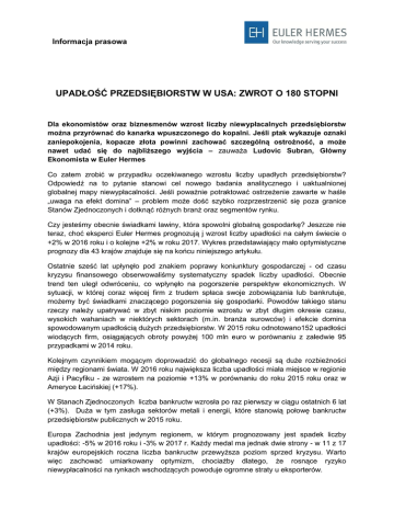 Informacja prasowa UPADŁOŚĆ PRZEDSIĘBIORSTW W USA: ZWROT O 180 STOPNI Dla ekonomistów oraz biznesmenów wzrost liczby niewypłacalnych przedsiębiorstw można przyrównać do kanarka wpuszczonego do kopalni. Jeśli ptak wykazuje oznaki zaniepokojenia, kopacze złota powinni zachować szczególną ostrożność, a może nawet udać się do najbliższego wyjścia – zauważa Ludovic Subran, Główny Ekonomista w Euler Hermes Co zatem zrobić w przypadku oczekiwanego wzrostu liczby upadłych przedsiębiorstw? Odpowiedź na to pytanie stanowi cel nowego badania analitycznego i uaktualnionej globalnej mapy niewypłacalności. Jeśli poważnie potraktować ostrzeżenie zawarte w haśle „uwaga na efekt domina” – problem może dość szybko rozprzestrzenić się poza granice Stanów Zjednoczonych i dotknąć różnych branż oraz segmentów rynku. Czy jesteśmy obecnie świadkami lawiny, która spowolni globalną gospodarkę? Jeszcze nie teraz, choć eksperci Euler Hermes prognozują j wzrost liczby upadłości na całym świecie o +2% w 2016 roku i o kolejne +2% w roku 2017. Wykres przedstawiający mało optymistyczne prognozy dla 43 krajów znajduje się na końcu niniejszego artykułu. Ostatnie sześć lat upłynęło pod znakiem poprawy koniunktury gospodarczej - od czasu kryzysu finansowego obserwowaliśmy systematyczny spadek liczby upadłości. Obecnie trend ten uległ odwróceniu, co wpłynęło na pogorszenie perspektyw ekonomicznych. W sytuacji, w której coraz więcej firm z trudem spłaca swoje zobowiązania lub bankrutuje, możemy być świadkami znaczącego pogorszenia się gospodarki. Powodów takiego stanu rzeczy należy upatrywać w zbyt niskim poziomie wzrostu w zbyt długim okresie czasu, wysokich wahaniach w niektórych sektorach (m.in. branża surowców) i efekcie domina spowodowanym upadłością dużych przedsiębiorstw. W 2015 roku odnotowano152 upadłości wiodących firm, osiągających obroty powyżej 100 mln euro w porównaniu z zaledwie 95 przypadkami w 2014 roku. Kolejnym czynnikiem mogącym doprowadzić do globalnego recesji są duże rozbieżności między regionami świata. W 2016 roku największa liczba upadłości miała miejsce w regionie Azji i Pacyfiku - ze wzrostem na poziomie +13% w porównaniu do roku 2015 roku oraz w Ameryce Łacińskiej (+17%). W Stanach Zjednoczonych liczba bankructw wzrosła po raz pierwszy w ciągu ostatnich 6 lat (+3%). Duża w tym zasługa sektorów metali i energii, które stanowią połowę bankructw przedsiębiorstw publicznych w 2015 roku. Europa Zachodnia jest jedynym regionem, w którym prognozowany jest spadek liczby upadłości: -5% w 2016 roku i -3% w 2017 r. Każdy medal ma jednak dwie strony - w 11 z 17 krajów europejskich roczna liczba bankructw przewyższa poziom sprzed kryzysu. Warto więc zachować umiarkowany optymizm, chociażby dlatego, że rosnące ryzyko niewypłacalności na rynkach wschodzących powoduje ogromne straty u eksporterów. Informacja prasowa W opinii Ludovica Subran, Głównego Ekonomisty w Euler Hermes, Europejczycy nie muszą rozważać ucieczki z obiecujących, aczkolwiek niestabilnych rynków. Pod warunkiem jednak, że mają wystarczająco dużo tlenu, żeby przetrwać chwilowy okres załamania na tych rynkach. Niewypłacalność państw w 2016 (prognozy, zmiana % w stosunku do roku 2015). ****** Kontakt dla mediów: Grzegorz Błachnio Euler Hermes tel. 601-056-830 e-mail: [email protected] Artur Niewrzędowski multiAN PR tel. 509-433-874 e-mail: [email protected] Informacja prasowa ****** Euler Hermes to światowy lider na rynku ubezpieczeń należności handlowych oraz jeden z liderów w zakresie gwarancji ubezpieczeniowych i windykacji należności. Posiadająca ponad 100 lat doświadczenia firma oferuje klientom z sektora business-to-business (B2B) usługi finansowe, wspierające zarządzanie środkami pieniężnymi i należnościami. Sieć wywiadowni gospodarczych śledzi i analizuje codzienne zmiany wypłacalności małych, średnich oraz międzynarodowych firm działających na rynkach odpowiadających za 92% światowego PKB. Firma posiada siedzibę główną w Paryżu i działa w ponad 50 krajach, gdzie zatrudnia ponad 6.000 pracowników. Euler Hermes jest spółką zależną Allianz, notowaną na giełdzie Euronext Paris (ELE.PA) oraz posiadającą rating AAprzyznany przez Standard & Poor’s oraz Dagong Europe. W 2015 roku skonsolidowane obroty firmy wyniosły 2,6 mld €, ubezpieczyła ona na całym świecie transakcje biznesowe o wartości wynoszącej na koniec 2015 roku 890 mld €. W celu uzyskania dalszych informacji zapraszamy do odwiedzenia strony internetowej: www.eulerhermes.com, LinkedIn lub Twitter @eulerhermes *** W Polsce grupa Euler Hermes jest obecna od 1998 roku. Towarzystwo Ubezpieczeń Euler Hermes SA oferuje ubezpieczenia należności handlowych oraz gwarancje ubezpieczeniowe. Jednocześnie druga spółka działająca na polskim rynku - Euler Hermes Collections Sp. z o.o. oferuje windykację należności, raporty handlowe, ocenę ryzyka oraz program analiz branżowych. Obsługę klientów zapewnia Euler Hermes Services Polska Sp. z o.o. Uwaga dotycząca stwierdzeń wybiegających w przyszłość: Stwierdzenia zawarte w niniejszym dokumencie mogą zawierać stwierdzenia dotyczące przyszłych oczekiwań oraz innego rodzaju stwierdzenia wybiegające w przyszłość, oparte na aktualnych opiniach i założeniach kierownictwa firmy, obejmujących znane i nieznane czynniki ryzyka oraz niepewności, które mogą powodować osiągnięcie rzeczywistych wyników, rezultatów lub zdarzeń mogących istotnie odbiegać od tych wyrażonych lub dorozumianych w takich stwierdzeniach. Obok stwierdzeń wybiegających w przyszłość, co wynika z ich kontekstu, wyrazy „może”, „będzie”, „powinno”, „oczekuje”, „planuje”, „zamierza”, „przewiduje”, „uważa”, „szacuje”, „prognozuje”, „potencjalny” lub „kontynuuje” oraz podobne