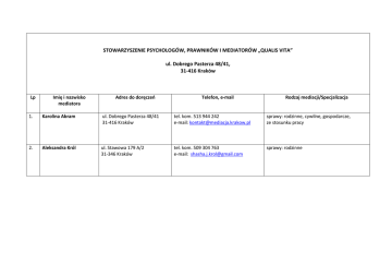 STOWARZYSZENIE PSYCHOLOGÓW, PRAWNIKÓW I MEDIATORÓW „QUALIS VITA” ul. Dobrego Pasterza 48/41, 31-416 Kraków Lp Imię i nazwisko mediatora Adres do doręczeń Telefon, e-mail Rodzaj mediacji/Specjalizacja 1. Karolina Abram ul. Dobrego Pasterza 48/41 31-416 Kraków tel. kom. 513 944 242 e-mail: [email protected] sprawy: rodzinne, cywilne, gospodarcze, ze stosunku pracy 2. Aleksandra Król ul. Stawowa 179 A/2 31-346 Kraków tel. kom. 509 304 763 e-mail: [email protected] sprawy: rodzinne