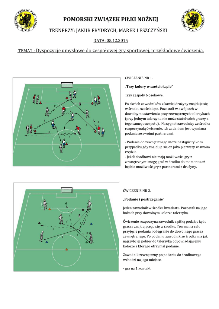 POMORSKI ZWIĄZEK PIŁKI NOŻNEJ TRENERZY: JAKUB FRYDRYCH, MAREK LESZCZYŃSKI DATA: 05.12.2015 TEMAT : Dyspozycje umysłowe do zespołowej gry sportowej, przykładowe ćwiczenia. ĆWICZENIE NR 1. „Trzy kolory w sześciokącie” Trzy zespoły 6 osobowe. Po dwóch zawodników z każdej drużyny znajduje się w środku sześciokąta. Pozostali w dwójkach w dowolnym ustawieniu przy zewnętrznych talerzykach (przy jednym talerzyku nie może stać dwóch graczy z tego samego zespołu). Na sygnał zawodnicy ze środka rozpoczynają ćwiczenie, ich zadaniem jest wymiana podania ze swoimi partnerami. - Podanie do zewnętrznego może nastąpić tylko w przypadku gdy znajduje się on jako pierwszy w swoim rzędzie. - Jeżeli środkowi nie mają możliwości gry z zewnętrznymi mogę grać w środku do momentu aż będzie możliwość gry z partnerami z drużyny. ĆWICZENIE NR 2. „Podanie i postrzeganie” Jeden zawodnik w środku kwadratu. Pozostali na jego bokach przy dowolnym kolorze talerzyka, Ćwiczenie rozpoczyna zawodnik z piłką podając ją do gracza znajdującego się w środku. Ten ma na celu przyjęcie podania i odegranie do dowolnego gracza zewnętrznego. Po podaniu zawodnik ze środka ma jak najszybciej pobiec do talerzyka odpowiadającemu kolorze z którego otrzymał podanie. Zawodnik zewnętrzny po podaniu do środkowego wchodzi na jego miejsce. - gra na 1 kontakt. ĆWICZENIE NR 3. „Pressing w rozgrzewce” Zawodnicy ustawieni w rombie. Trener rozpoczyna ćwiczenie podaniem do dowolnego gracza. Zasada ćwiczenia brzmi: - atakuj zawodnika na wprost, - graj w prawo, - idź w lewo. W dowolnym momencie zmiana kierunku podań piłki. Stopniowanie trudności : W zależności od ustawienia się obrońcy zawodnik podejmuje decyzję o kierunku podania, zmuszając pozostałych graczy do podjęcia odpowiedniego działania w celu odebrania piłki. ĆWICZENIE NR 4. „Gra na utrzymanie” Zawodnicy drużyny, która posiada piłkę muszą znajdować się w różnych kwadratach. Jeśli dwóch z nich znajdzie się w tym samym tracą piłkę. - Po podaniu zawodnik przebiega do innego kwadratu. - Gra z wykorzystaniem graczy neutralnych (2 kontakty z piłką). - Zwracamy uwagę na pozycję otwartą, aby zebrać jak najwięcej informacji: gdzie jest piłka, gdzie rywal, gdzie kolega z zespołu i gdzie jest wolna przestrzeń. ĆWICZENIE NR 5. „1x1 ze wsparciem 2x1” Dwóch graczy w środku (szary i czerwony) oraz po dwóch zawodników z przeciwnej drużyny przy zewnętrznych talerzykach. Ćwiczenie rozpoczyna zespół „szary”, zawodnik przy piłce ma za zadanie wygrać pojedynek 1x1 i podać piłkę do zewnętrznego. W tym momencie startuje dwóch skrzydłowych, którzy wchodzą do kwadratów w celu zrobienia przewagi w grze. Zawodnik, który otrzymał podanie decyduje czy rozegrać akcje 1x1czy wykorzystać sytuację 2x1i przeprowadzić piłkę na drugą stronę. ĆWICZENIE NR 6. „Skrzydłowi” Napastnik z piłką rozpoczyna grę 1x1 w określonej strefie. Obrońca ma za zadanie opóźniać grę. Trener uruchamia na sygnał dwóch skrzydłowych jeden w kolorze napastnika, drugi w kolorze obrońcy. Zadaniem atakującego jest zagranie piłki do właściwego zawodnika tak aby ten nie znalazł się na pozycji spalonej. - obrońca może odbierać piłkę w dowolnym momencie - trener może wysłać dwóch skrzydłowych w kolorze atakujących lub broniących. - jeżeli skrzydłowi są w kolorze broniących atakujący sam kończy akcję ofensywną. ĆWICZENIE NR 7. „Kółko i krzyżyk” Dwa zespoły, 4 zawodników posiada koszulki w wybranym kolorze. Na sygnał trenera ruszają kolejno aby utworzyć z nich linię odpowiednio przy wybranym talerzyku. Kolejny z drużyny może ruszyć dopiero kiedy pierwszy wróci do zespołu. Wygrywa drużyna, która jako pierwsza wykona zadanie. - drużyny mogą się blokować, - trener ustala do ilu punktów trwa zabawa, - zawodnicy mogą poruszać się z piłką lub bez.