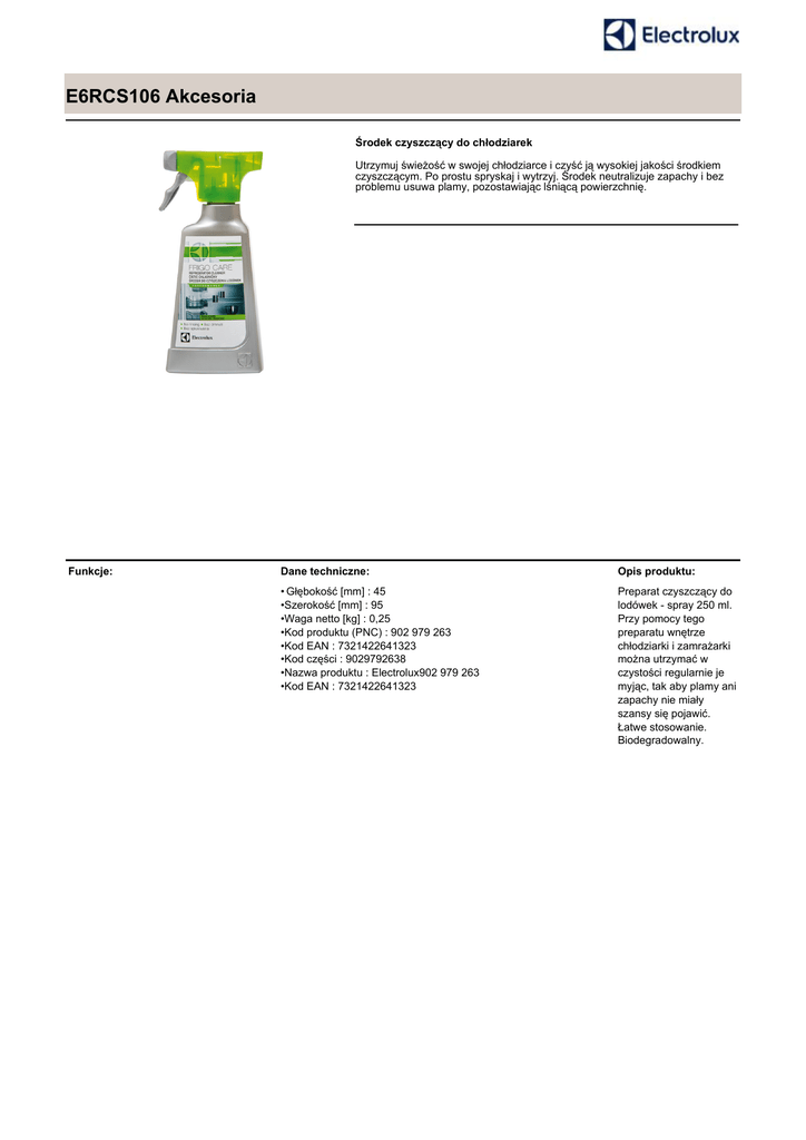 E6RCS106 Akcesoria Środek czyszczący do chłodziarek Utrzymuj świeżość w swojej chłodziarce i czyść ją wysokiej jakości środkiem czyszczącym. Po prostu spryskaj i wytrzyj. Środek neutralizuje zapachy i bez problemu usuwa plamy, pozostawiając lśniącą powierzchnię. Funkcje: Dane techniczne: Opis produktu: • Głębokość [mm] : 45 •Szerokość [mm] : 95 •Waga netto [kg] : 0,25 •Kod produktu (PNC) : 902 979 263 •Kod EAN : 7321422641323 •Kod części : 9029792638 •Nazwa produktu : Electrolux902 979 263 •Kod EAN : 7321422641323 Preparat czyszczący do lodówek - spray 250 ml. Przy pomocy tego preparatu wnętrze chłodziarki i zamrażarki można utrzymać w czystości regularnie je myjąc, tak aby plamy ani zapachy nie miały szansy się pojawić. Łatwe stosowanie. Biodegradowalny.