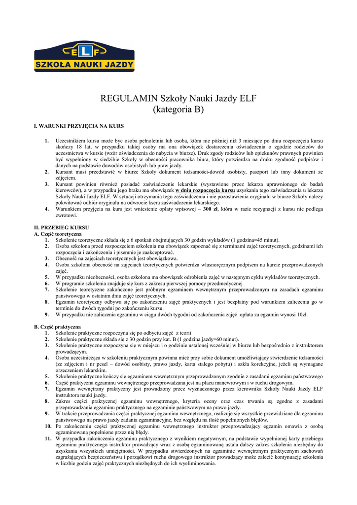 REGULAMIN Szkoły Nauki Jazdy ELF (kategoria B)