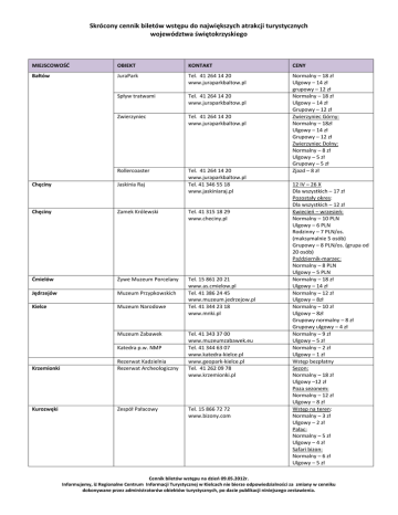 Skrócony cennik biletów wstępu do największych atrakcji turystycznych województwa świętokrzyskiego MIEJSCOWOŚĆ OBIEKT KONTAKT CENY Bałtów JuraPark Tel. 41 264 14 20 www.juraparkbaltow.pl Spływ tratwami Tel. 41 264 14 20 www.juraparkbaltow.pl Zwierzyniec Tel. 41 264 14 20 www.juraparkbaltow.pl Rollercoaster Tel. 41 264 14 20 www.juraparkbaltow.pl Tel. 41 346 55 18 www.jaskiniaraj.pl Normalny – 18 zł Ulgowy – 14 zł grupowy – 12 zł Normalny – 18 zł Ulgowy – 14 zł Grupowy – 12 zł Zwierzyniec Górny: Normalny – 18zł Ulgowy – 14 zł Grupowy – 12 zł Zwierzyniec Dolny: Normalny – 8 zł Ulgowy – 5 zł Grupowy – 5 zł Zjazd – 8 zł Chęciny Jaskinia Raj Chęciny Zamek Królewski Tel. 41 315 18 29 www.checiny.pl Ćmielów Żywe Muzeum Porcelany Jędrzejów Muzeum Przypkowskich Kielce Muzeum Narodowe Tel. 15 861 20 21 www.as.cmielow.pl Tel. 41 386 24 45 www.muzeum.jedrzejow.pl Tel. 41 344 23 18 www.mnki.pl Muzeum Zabawek Katedra p.w. NMP Krzemionki Rezerwat Kadzielnia Rezerwat Archeologiczny Kurozwęki Zespół Pałacowy Tel. 41 343 37 00 www.muzeumzabawek.eu Tel. 41 344 63 07 www.katedra-kielce.pl www.geopark-kielce.pl Tel. 41 262 09 78 www.krzemionki.pl Tel. 15 866 72 72 www.bizony.com 12 IV – 26 X Dla wszystkich – 17 zł Pozostały okres: Dla wszystkich – 12 zł Kwiecień – wrzesień: Normalny – 10 PLN Ulgowy – 6 PLN Rodzinny – 7 PLN/os. (maksymalnie 5 osób) Grupowy – 8 PLN/os. (grupa od 20 osób) Październik-marzec: Normalny – 8 PLN Ulgowy – 5 PLN Normalny – 18 zł Ulgowy – 14 zł Normalny – 12 zł Ulgowy – 8zł Normalny – 10 zł Ulgowy – 8zł Grupowy normalny – 8 zł Grupowy ulgowy – 4 zł Normalny – 9 zł Ulgowy – 5 zł Normalny – 2 zł Ulgowy – 1 zł Wstęp bezpłatny Sezon: Normalny – 18 zł Ulgowy –12 zł Poza sezonem: Normalny – 12 zł Ulgowy – 8 zł Wstęp na teren: Normalny – 3 zł Ulgowy – 2 zł Pałac: Normalny – 5 zł Ulgowy – 4 zł Safari bizon: Normalny – 6 zł Ulgowy – 5 zł Cennik biletów wstępu na dzień 09.05.2012r. Informujemy, iż Regionalne Centrum Informacji Turystycznej w Kielcach nie bierze odpowiedzialności za zmiany w cenniku dokonywane przez administratorów obiektów turystycznych, po dacie publikacji niniejszego zestawienia. Skrócony cennik biletów wstępu do największych atrakcji turystycznych województwa świętokrzyskiego Nagłowice Dworek Reja Nowa Słupia Muzeum Starożytnego Hutnictwa Muzeum H. Sienkiewicza Oblęgorek Opatów Podziemna Trasa Turystyczna Kolegiata św. Marcina Pacanów Europejskie Centrum Bajki Sielpia Wielka Muzeum Zagłębia Staropolskiego Podziemna Trasa Turystyczna Katedra p.w. NMP Sandomierz Zamek Królewski Tel. 41 381 45 70 www.naglowice.orangespace.pl Tel. 41 317 76 26 www.nowaslupia.pl Tel. 41 303 04 26 www.mnki.pl Tel. 15 868 27 78 www.opatow.travel Tel. 15 868 27 64 www.kolegiataopatow.sandomierz.opo ka.org.pl Tel. 41 376 50 79 www.stolica-bajek.pl Tel. 41 372 02 93 www.muzeum-techniki.waw.pl Te. 15 832 23 05 www.pttk-sandomierz.pl Tel. 15 832 73 43 www.katedra.sandomierz.opoka.org.pl Tel. 15 832 22 65 www.zamek-sandomierz.pl Tel. 41 311 21 16 Tel. kom. +48 501 282 697 www.swkatarzyna-muzeum.pl Święta Katarzyna Muzeum Minerałów i Skamieniałości Święty Krzyż Muzeum Misyjne Misjonarzy Oblatów Krypta Tel. 41 317 70 21 www.swietykrzyz.pl Tel. 41 317 70 21 Muzeum Przyrodnicze Tel. 41 317 70 87 Świętokrzyski Park Narodowy Wstęp na obszar ŚPN Szydłów Zamek, muzeum, synagoga Tel. 41 311 51 06 www.swietokrzyskipn.org.pl Tel. 41 354 51 46 www.szydlow.pl Tokarnia Muzeum Wsi Kieleckiej – Park Etnograficzny Tel. 41 315 41 71 www.mwk.com.pl Ujazd Zamek Krzyżtopór Tel. 15 860 11 33 www.krzyztopor.eu Wiślica Muzeum Regionalne Tel. 502 634 495 www.muzeum.wislica.pl Normalny – 5 zł Ulgowy – 3 zł Normalny – 6 zł Ulgowy – 3 zł Normalny – 8zł Ulgowy – 4 zł Normalny – 12 zł Ulgowy – 8 zł Opłata za przewodnika – 2 zł Normalny –22zł Ulgowy –17* zł Dzieci do lat 3 - wstęp gratis Ceny dla grup zorganizowanych: Normalny – 20 zł Ulgowy – 15 zł Normalny – 6 zł Ulgowy – 3 zł Normalny – 10 zł Ulgowy – 6 zł Wstęp bezpłatny Normalny – 8 zł Ulgowy – 6 zł Normalny – 6 zł Ulgowy – 5 zł Grupowe (od 15 os.) Normalny – 5 zł Ulgowy – 4 zł Dobrowolna opłata na misje Normalny – 2 zł Ulgowy – 1 zł Normalny – 8 zł Ulgowy – 4 zł Normalny – 6 zł Ulgowy – 3 zł Ogólny (zamek, muzeum, synagoga): Normalny – 5 zł Ulgowy – 4 zł Częściowy (zamek i muzeum): Normalny – 3 zł Ulgowy – 2 zł IV - X Normalny – 10 zł Ulgowy – 5zł XI – III Normalny – 6 zł Ulgowy – 3 zł Normalny – 8 zł Ulgowy – 6 zł Normalny dla grup – 7 zł Ulgowy dla grup – 5 zł Normalny – 8 zł Ulgowy – 5 zł Cennik biletów wstępu na dzień 09.05.2012r. Informujemy, iż Regionalne Centrum Informacji Turystycznej w Kielcach nie bierze odpowiedzialności za zmiany w cenniku dokonywane przez administratorów obiektów turystycznych, po dacie publikacji niniejszego zestawienia.