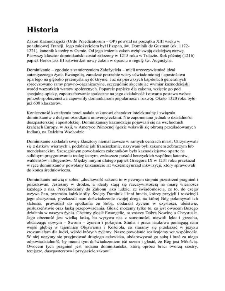 Historia Zakon Kaznodziejski (Ordo Praedicatorum – OP) powstał na początku XIII wieku w południowej Francji. Jego założycielem był Hiszpan, św. Dominik de Guzman (ok. 11721221), kanonik katedry w Osmie. Od jego imienia zakon wziął swoją dzisiejszą nazwę. Pierwszy klasztor dominikański został założony w 1215 roku w Tuluzie. Rok później (1216) papież Honoriusz III zatwierdził nowy zakon w oparciu o regułę św. Augustyna. Dominikanie – zgodnie z zamierzeniem Założyciela – mieli urzeczywistniać ideał autentycznego życia Ewangelią, zaradzać potrzebie wiary uświadomionej i apostolstwa opartego na głęboko przemyślanej doktrynie. Już na pierwszych kapitułach generalnych sprecyzowano ramy prawno-organizacyjne, szczególnie akcentując wymiar kaznodziejski wśród wszystkich warstw społecznych. Poparcie papieży dla zakonu, wzięcie go pod specjalną opiekę, zapotrzebowanie społeczne na jego działalność i otwarta postawa wobec potrzeb społeczeństwa zapewniły dominikanom popularność i rozwój. Około 1320 roku było już 600 klasztorów. Konieczność kształcenia braci nadała zakonowi charakter intelektualny i związała dominikanów z dużymi ośrodkami uniwersyteckimi. Nie zapomniano jednak o działalności duszpasterskiej i apostolskiej. Dominikańscy kaznodzieje pojawiali się na wschodnich krańcach Europy, w Azji, w Ameryce Północnej (gdzie wsławili się obroną prześladowanych Indian), na Dalekim Wschodzie. Dominikanie zakładali swoje klasztory niemal zawsze w samych centrach miast. Utrzymywali się z datków wiernych i, podobnie jak franciszkanie, nazywani byli zakonem żebraczym lub mendykanckim. Szczególnym powołaniem zakonników było kaznodziejstwo oparte na solidnym przygotowaniu teologicznym, zwłaszcza pośród heretyckich wspólnot katarów, waldensów i albigensów. Między innymi dlatego papież Grzegorz IX w 1231 roku przekazał w ręce dominikanów powołany kilkanaście lat wcześniej urząd inkwizycji, który sprawowali do końca średniowiecza. Dominikanie mówią o sobie: „duchowość zakonu to w pewnym stopniu przestrzeń pragnień i poszukiwań. Jesteśmy w drodze, a ideały stają się rzeczywistością na miarę wierności każdego z nas. Przychodzimy do Zakonu jako ludzie, ze świadomością, że to, do czego wzywa Pan, przerasta ludzkie siły. Święty Dominik i inni bracia, którzy przyjęli i rozwinęli jego charyzmat, przekazali nam doświadczenie swojej drogi, na której Bóg pokonywał ich słabości, prowadził do spotkania ze Sobą, obdarzał życiem w czystości, ubóstwie, posłuszeństwie oraz łaską przepowiadania. Głosić możemy tylko to, co jest owocem Bożego działania w naszym życiu. Chcemy głosić Ewangelię, to znaczy Dobrą Nowinę o Chrystusie. Jego obecność jest wielką łaską, bo wyrywa nas z samotności, niewoli lęku i grzechu, obdarzając nowym – Swoim – życiem i pokojem. Studia i praca naukowa pomagają nam wejść głębiej w tajemnicę Objawienia i Kościoła, co staramy się przekazać w języku zrozumiałym dla ludzi, wśród których żyjemy. Nasze powołanie realizujemy we wspólnocie. W niej uczymy się przyjmować drugiego człowieka, obdarowywać go sobą i brać za niego odpowiedzialność, by mocni tym doświadczeniem iść razem i głosić, że Bóg jest Miłością. Owocem tych pragnień jest rodzina dominikańska, którą oprócz braci tworzą siostry, tercjarze, duszpasterstwa i przyjaciele zakonu”.