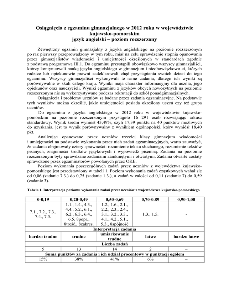 Osiągnięcia z egzaminu gimnazjalnego w 2012 roku w województwie kujawsko-pomorskim język angielski – poziom rozszerzony Zewnętrzny egzamin gimnazjalny z języka angielskiego na poziomie rozszerzonym po raz pierwszy przeprowadzony w tym roku, miał na celu sprawdzenie stopnia opanowania przez gimnazjalistów wiadomości i umiejętności określonych w standardach zgodnie z podstawą programową III.1. Do egzaminu przystąpili obowiązkowo wszyscy gimnazjaliści, którzy kontynuowali naukę języka angielskiego w gimnazjum i nieobowiązkowo ci, których rodzice lub opiekunowie prawni zadeklarowali chęć przystąpienia swoich dzieci do tego egzaminu. Wszyscy gimnazjaliści wykonywali te same zadania, dlatego ich wyniki są porównywalne w skali całego kraju. Wyniki maja charakter informacyjny dla ucznia, jego opiekunów oraz nauczycieli. Wyniki egzaminu z języków obcych nowożytnych na poziomie rozszerzonym nie są wykorzystywane podczas rekrutacji do szkół ponadgimnazjalnych. Osiągnięcia i problemy uczniów są badane przez zadania egzaminacyjne. Na podstawie tych wyników można określić, jakie umiejętności posiada określony uczeń czy też grupa uczniów. Do egzaminu z języka angielskiego w 2012 roku w województwie kujawskopomorskim na poziomie rozszerzonym przystąpiło 16 291 osób rozwiązując arkusz standardowy. Wynik średni wyniósł 43,49%, czyli 17,39 punktu na 40 punktów możliwych do uzyskania, jest to wynik porównywalny z wynikiem ogólnopolski, który wyniósł 18,40 pkt. Analizując opanowane przez uczniów trzeciej klasy gimnazjum wiadomości i umiejętności na podstawie wykonania przez nich zadań egzaminacyjnych, warto zauważyć, że zadania obejmowały cztery sprawności: rozumienie tekstu słuchanego, rozumienie tekstów pisanych, znajomości środków językowych i wypowiedź pisemną. Zadania na poziomie rozszerzonym były sprawdzane zadaniami zamkniętymi i otwartymi. Zadania otwarte zostały sprawdzone przez egzaminatorów powołanych przez OKE. Poziom wykonania poszczególnych zadań przez uczniów z województwa kujawskopomorskiego jest przedstawiony w tabeli 1. Poziom wykonania zadań cząstkowych wahał się od 0,06 (zadanie 7.3.) do 0,75 (zadanie 1.3.), a zadań w całości od 0,11 (zadanie 7) do 0,59 (zadanie 3). Tabela 1. Interpretacja poziomu wykonania zadań przez uczniów z województwa kujawsko-pomorskiego 0-0,19 0,20-0,49 0,50-0,69 0,70-0.89 0,90-1,00 1.1., 1.4., 4.3., 1.2., 1.6., 2.1., 4.4., 5.2., 6.1., 2.2., 2.3., 2.4., 7.1., 7.2., 7.3., 6.2., 6.3., 6.4., 3.1., 3.2., 3.3., 1.3., 1.5. 7.4., 7.5. 6.5. 8popr., 4.1., 4.2., 5.1., 8treść., 8zakres. 5.3., 8spójność Interpretacja zadania umiarkowanie bardzo trudne trudne łatwe bardzo łatwe trudne Liczba zadań 5 13 14 2 – Suma punktów za zadania i ich udział procentowy w punktacji ogółem 15% 38% 41% 6% – Na wykresie 1. przedstawiono rozkład wyników uzyskanych przez zdających za rozwiązanie zadań zamieszczonych w arkuszu standardowym. Wykres 1. Rozkład wyników uzyskanych przez zdających za zadania arkusza standardowego Wykres 1. przedstawia rozkład wyników uzyskanych przez zdających w arkuszu standardowym na poziomie rozszerzonym. Wykres wyraźnie wskazuje wypiętrzenie w niższych wartościach na poziomie 5 pkt. Dla większości zdających arkusz był trudny. Odbiór tekstu słuchanego Tę sprawność badano dwoma zadaniami, zgodnie ze standardami przedstawionymi w Informatorze gimnazjalnym. W zadaniu 1. uczeń miał wysłuchać dwóch tekstów dialogu i monologu na tematy życia codziennego, tekst 1- planów wakacyjnych i tekst 2. - nauki, a następnie znaleźć w tekście informacje przedstawione w nagraniu (standard 2.3), określić główną myśl tekstu (standard 2.2) i określić intencje nadawcy tekstu (standard 2.4). Zadanie 1. w tej części egzaminu było zadaniem umiarkowanie trudnym ze wskaźnikiem łatwości 0,56. Zadanie cząstkowe 1.1., w którym zdający miał znaleźć w tekście określone informacje, było zadaniem najtrudniejszym w tym zadaniu ze wskaźnikiem łatwości 0,41. W tym zadaniu zdający mieli stwierdzić w jakim miesiącu dziewczyna podejmie pracę. Nazwy wszystkich miesięcy podanych w zadaniu pojawiły się w nagraniu, ale lipiec i czerwiec pojawił się w kontekście letniej szkoły, a praca dotyczyła miesiąca sierpnia. Było to zadanie wielkokrotnego wyboru. Zadanie 2. było dla zdających w województwie kujawsko-pomorskim trudniejsze niż zadanie 1., ze wskaźnikiem łatwości 0,55. Uczeń miał wysłuchać czterech wypowiedzi na temat zakupów, a następnie na podstawie informacji zawartych w nagraniu, miał dopasować do każdej z nich odpowiadające jej zdanie. Rozumienie tekstu słuchanego było dla gimnazjalistów w województwie kujawskopomorskim piszących egzamin w 2012 roku na poziomie rozszerzonym umiejętnością umiarkowanie trudną. Łatwość obydwu zadań wyniosła 0,56. Wartość wskaźnika łatwości dla poszczególnych zadań jest przedstawiona na wykresie 2. Na wykresie 2. przedstawiono wartości wskaźnika łatwości poszczególnych zadań uzyskanych przez zdających w arkuszu standardowym z rozumienia tekstu słuchanego. Wykres 2. Wartości wskaźnika łatwości poszczególnych zadań badających umiejętność odbioru tekstu słuchanego Najłatwiejsze z danej umiejętności okazały się zadania 1.3. i 1.5., zaś najtrudniejsze zadania 1.1. i 1.4 Rozumienie tekstów pisanych Tę sprawność sprawdzano też trzema zadaniami. W zadaniu 3. zdający mieli dobrać odpowiedni nagłówek do każdego akapitu podanego tekstu.. Zadaniem tym sprawdzano, czy uczeń potrafi określić główna myśl poszczególnych części tekstu (standard 3.2). Wszystkie zadania cząstkowe były umiarkowanie trudne dla zdających ze wskaźnikiem łatwości: 3.1 – 0,65, 3.2. – 0,63 i 3.3. – 0,51. Zadanie 4. okazało się dla uczniów zadaniem zdecydowanie trudniejszym niż zadanie 3. i 5., ze wskaźnikiem łatwości 0,4