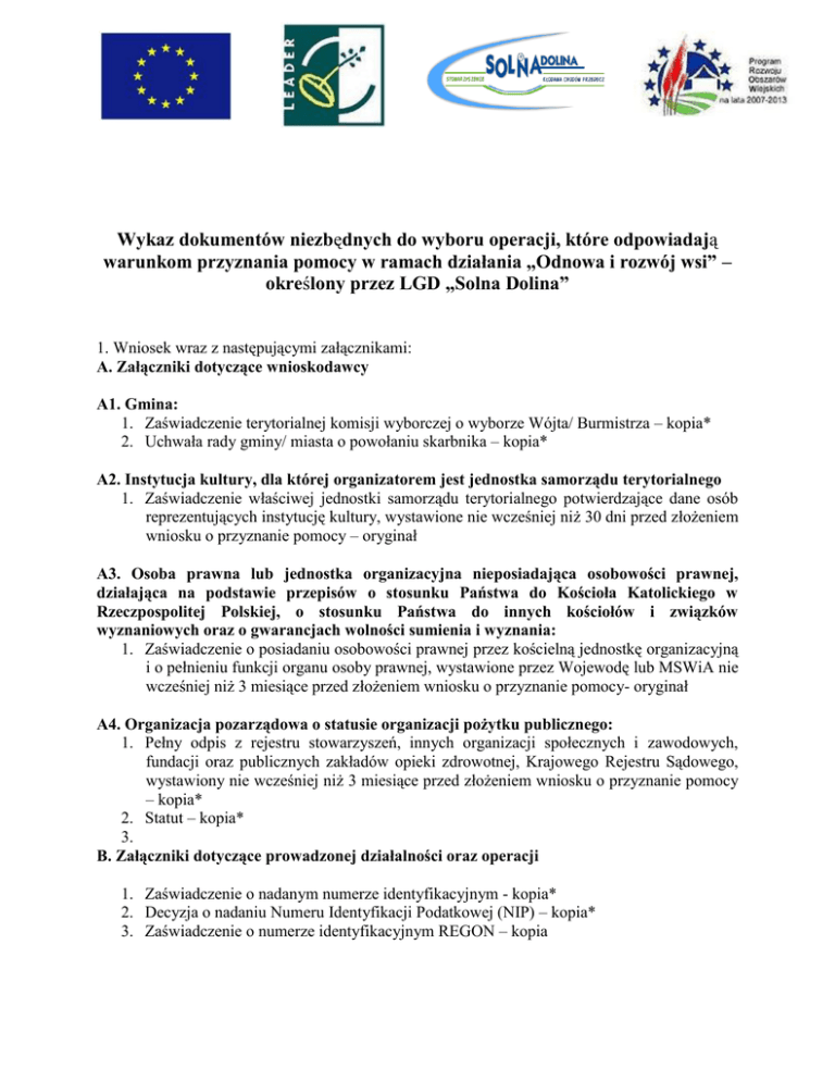 Wykaz dokumentów niezbędnych do wyboru operacji, które odpowiadają warunkom przyznania pomocy w ramach działania „Odnowa i rozwój wsi” – określony przez LGD „Solna Dolina” 1. Wniosek wraz z następującymi załącznikami: A. Załączniki dotyczące wnioskodawcy A1. Gmina: 1. Zaświadczenie terytorialnej komisji wyborczej o wyborze Wójta/ Burmistrza – kopia* 2. Uchwała rady gminy/ miasta o powołaniu skarbnika – kopia* A2. Instytucja kultury, dla której organizatorem jest jednostka samorządu terytorialnego 1. Zaświadczenie właściwej jednostki samorządu terytorialnego potwierdzające dane osób reprezentujących instytucję kultury, wystawione nie wcześniej niż 30 dni przed złożeniem wniosku o przyznanie pomocy – oryginał A3. Osoba prawna lub jednostka organizacyjna nieposiadająca osobowości prawnej, działająca na podstawie przepisów o stosunku Państwa do Kościoła Katolickiego w Rzeczpospolitej Polskiej, o stosunku Państwa do innych kościołów i związków wyznaniowych oraz o gwarancjach wolności sumienia i wyznania: 1. Zaświadczenie o posiadaniu osobowości prawnej przez kościelną jednostkę organizacyjną i o pełnieniu funkcji organu osoby prawnej, wystawione przez Wojewodę lub MSWiA nie wcześniej niż 3 miesiące przed złożeniem wniosku o przyznanie pomocy- oryginał A4. Organizacja pozarządowa o statusie organizacji pożytku publicznego: 1. Pełny odpis z rejestru stowarzyszeń, innych organizacji społecznych i zawodowych, fundacji oraz publicznych zakładów opieki zdrowotnej, Krajowego Rejestru Sądowego, wystawiony nie wcześniej niż 3 miesiące przed złożeniem wniosku o przyznanie pomocy – kopia* 2. Statut – kopia* 3. B. Załączniki dotyczące prowadzonej działalności oraz operacji 1. Zaświadczenie o nadanym numerze identyfikacyjnym - kopia* 2. Decyzja o nadaniu Numeru Identyfikacji Podatkowej (NIP) – kopia* 3. Zaświadczenie o numerze identyfikacyjnym REGON – kopia 4. Zaświadczenie wystawione przez Wójta/ Burmistrza określające liczbę mieszkańców miejscowości, w której będzie realizowana operacja, wg stanu na dzień 31 grudnia rok poprzedzającego rok złożenia wniosku – oryginał 5. Opis zadań wymienionych w zestawieniu rzeczowo – finansowym operacji – oryginał 6. C. Załączniki dotyczące robót budowlanych 1. Kosztorys inwestorski - oryginał lub kopia* 2. Szkice sytuacyjne oraz rysunki charakterystyczne - oryginał lub kopia* D. Inne załączniki 1. Oświadczenie Wnioskodawcy o spełnianiu warunków uzyskania pomocy ze środków na wdrażanie Lokalnej Strategii Rozwoju Stowarzyszenia „Solna Dolina” na operacje odpowiadające działaniu „Odnowa i rozwój wsi” – oryginał sporządzony na formularzu udostępnianym przez Stowarzyszenie „Solna Dolina”. 2. Opis operacji odpowiadających działaniu „Odnowa i rozwój wsi” pod kątem spełniania kryteriów wyboru określonych w Lokalnej Strategii Rozwoju Stowarzyszenia „Solna Dolina” – oryginał sporządzony na formularzu udostępnianym przez Stowarzyszenie „Solna Dolina”. 3. Oświadczenie o wpisaniu się operacji w realizację przedsięwzięcia – oryginał sporządzony na formularzu udostępnianym przez Stowarzyszenie „Solna Dolina” *kopie dokumentów składanych wraz z wnioskiem powinny być potwierdzone za zgodność z oryginałem zgodnie z informacją dotyczącą potwierdzania dokumentów zawartą w formularzu wniosku.