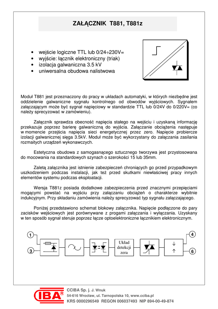 ZAŁĄCZNIK T881, T881z • • • • wejście logiczne TTL lub 0/24÷230V= wyjście: łącznik elektroniczny (triak) izolacja galwaniczna 3.5 kV uniwersalna obudowa nalistwowa Moduł T881 jest przeznaczony do pracy w układach automatyki, w których niezbędne jest oddzielenie galwaniczne sygnału kontrolnego od obwodów wyjściowych. Sygnałem załączającym może być sygnał napięciowy w standardzie TTL lub 0/24V do 0/220V= (co należy sprecyzować w zamówieniu). Załącznik sprawdza obecność napięcia stałego na wejściu i uzyskaną informację przekazuje poprzez barierę galwaniczną do wyjścia. Załączanie obciążenia następuje w momencie przejścia napięcia sieci energetycznej przez zero. Napięcie probiercze izolacji galwanicznej sięga 3.5kV. Moduł może być wykorzystany do załączania zasilania rozmaitych urządzeń wykonawczych. Estetyczna obudowa z samogasnącego sztucznego tworzywa jest przystosowana do mocowania na standardowych szynach o szerokości 15 lub 35mm. Zaletą załącznika jest istnienie zabezpieczeń chroniących go przed przypadkowym uszkodzeniem podczas instalacji, jak też przed skutkami niewłaściwej pracy innych elementów systemu podczas eksploatacji. Wersja T881z posiada dodatkowe zabezpieczenia przed znacznymi przepięciami mogącymi powstać na wyjściu przy załączaniu obciążeń o charakterze wybitnie indukcyjnym. Przy składaniu zamówienia należy sprecyzować typ sygnału załączającego. Poniżej przedstawiono schemat blokowy załącznika. Napięcie podłączone do pary zacisków wejściowych jest porównywane z progami załączania i wyłączania. Uzyskany w ten sposób sygnał steruje poprzez łącze optoelektroniczne łącznikiem elektronicznym. 4 1 Układ detekcji zera 3 CCIBA Sp. j. J. Wnuk 54-616 Wrocław, ul. Tarnopolska 10, www.cciba.pl KRS 0000296549 REGON 006037493 NIP 894-00-49-874 6 Przykład podłączenia załącznika : + 1 TTL, 0/24÷240V= T881 2 L1 4 5 Z - 3 N 6 Dane techniczne: Wejście: napięcie wejściowe (UZ) TTL, 0/24÷220 V Wyjście: prąd (maksymalny) napięcie 3A 240 V~ Napięcie probiercze izolacji (we/wy): 3.5 kV Ogólne parametry techniczne: zakres temperatur pracy zakres temperatur przechowywania wilgotność względna otoczenia ciśnienie atmosferyczne zewnętrzne pole magnetyczne pozycja pracy zapylenie wymiary obudowy stopień ochrony -20÷50 °C -40÷80 °C 30÷70 % 1000±200 hPa 0÷400 A/m dowolna nieznaczne 22.5×79×85.5mm IP 40 Maksymalne wartości parametrów: napięcie na zaciskach wejściowych napięcie na zaciskach wyjściowych 2×UZ 400 V~ CCIBA Sp. j. J. Wnuk 54-616 Wrocław, ul. Tarnopolska 10, www.cciba.pl KRS 0000296549 REGON 006037493 NIP 894-00-49-874