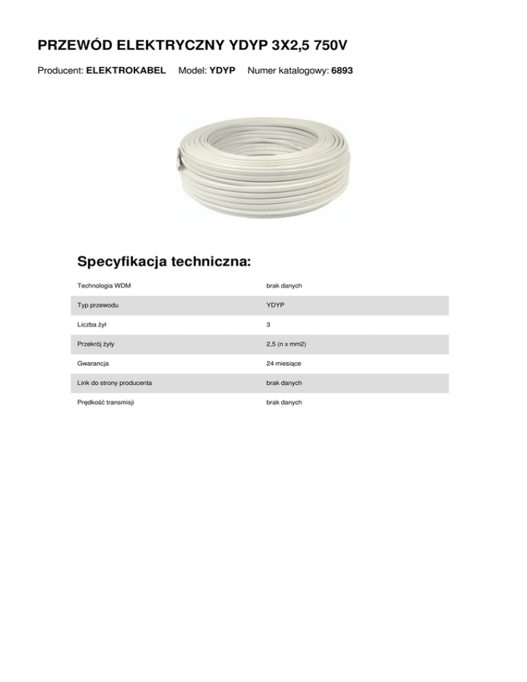 PRZEWÓD ELEKTRYCZNY YDYP 3X2,5 750V Specyfikacja