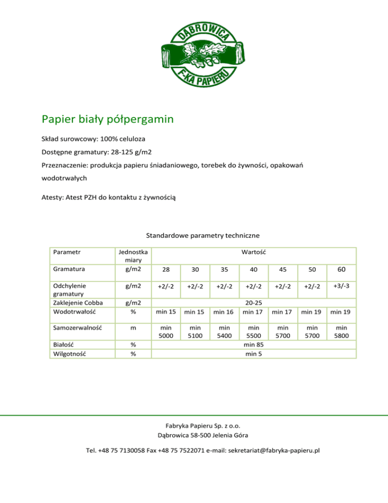 Papier biały półpergamin Skład surowcowy: 100% celuloza Dostępne gramatury: 28-125 g/m2 Przeznaczenie: produkcja papieru śniadaniowego, torebek do żywności, opakowań wodotrwałych Atesty: Atest PZH do kontaktu z żywnością Standardowe parametry techniczne Parametr Jednostka miary g/m2 28 30 35 40 45 50 60 Odchylenie gramatury Zaklejenie Cobba Wodotrwałość g/m2 +2/-2 +2/-2 +2/-2 +2/-2 +2/-2 +2/-2 +3/-3 20-25 min 17 min 17 min 19 min 19 Samozerwalność m min 5700 min 5700 min 5800 Białość Wilgotność % % Gramatura g/m2 % Wartość min 15 min 15 min 16 min 5000 min 5100 min 5400 min 5500 min 85 min 5 Fabryka Papieru Sp. z o.o. Dąbrowica 58-500 Jelenia Góra Tel. +48 75 7130058 Fax +48 75 7522071 e-mail: [email protected] Standardowe informacje techniczne Zwoje Szerokość min 13 max 200 cm (dla gramatury pow. 40 g/m2 max 207 cm) Standardowa średnica zewn 90-120 cm Odstopniowanie 5 mm Tolerancja cięcia +/-1 mm Tolerancja wagowa +/-2 % Bobiny Standardowa szerokość min 7 cm Standardowa średnica zewn. 90-120 cm Tolerancja cięcia +/-1 mm Tolerancja wagowa +/-2 % Arkusze Szerokość min 50 cm max 200 cm Długość min 60 cm max 160 cm Tolerancja cięcia szerokość +/-2 mm długość +/- 5 mm Tolerancja wagowa +/-2 % Dodatkowe operacje (wymagające osobnego uzgodnienia) – sortowanie papieru, cięcie na gilotynie (umożliwa uzyskanie arkuszy o mniejszym i bardziej dokładnym wymiarze), ważenie, ryzowanie. Standardowe opakowanie Papier ułożony na paletach jednorazowych (zwoje w pozycji pionowej), ofoliowany, etykieta producenta. Standardowa wysokość palety 160-180 cm (zwoje do 220 cm) Fabryka Papieru Sp. z o.o. Dąbrowica 58-500 Jelenia Góra Tel. +48 75 7130058 Fax +48 75 7522071 e-mail: [email protected]