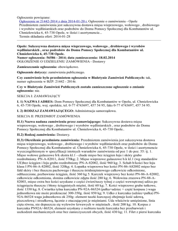 Ogłoszenie powiązane: Ogłoszenie nr 21442-2014 z dnia 2014-01-20 r. Ogłoszenie o zamówieniu - Opole Przedmiotem zamówienia jest sukcesywna dostawa mięsa wieprzowego, wołowego , drobiowego i wyrobów wędliniarskich oraz podrobów do Domu Pomocy Społecznej dla Kombatantów ul. Chmielowicka 6, 45-738 Opole, w ilości i asortymencie... Termin składania ofert: 2014-01-28 Opole: Sukcesywna dostawa mięsa wieprzowego, wołowego , drobiowego i wyrobów wędliniarskich , oraz podrobów do Domu Pomocy Społecznej dla Kombatantów ul. Chmielowicka 6, 45-738 Opole. Numer ogłoszenia: 56586 - 2014; data zamieszczenia: 18.02.2014 OGŁOSZENIE O UDZIELENIU ZAMÓWIENIA - Dostawy Zamieszczanie ogłoszenia: obowiązkowe. Ogłoszenie dotyczy: zamówienia publicznego. Czy zamówienie było przedmiotem ogłoszenia w Biuletynie Zamówień Publicznych: tak, numer ogłoszenia w BZP: 21442 - 2014r. Czy w Biuletynie Zamówień Publicznych zostało zamieszczone ogłoszenie o zmianie ogłoszenia: nie. SEKCJA I: ZAMAWIAJĄCY I. 1) NAZWA I ADRES: Dom Pomocy Społecznej dla Kombatantów w Opolu, ul. Chmielowicka 6, 45-738 Opole, woj. opolskie, tel. 0-77 4743697, 457 54 95, faks 0-77 4743697, 457 54 95. I. 2) RODZAJ ZAMAWIAJĄCEGO: Administracja samorządowa. SEKCJA II: PRZEDMIOT ZAMÓWIENIA II.1) Nazwa nadana zamówieniu przez zamawiającego: Sukcesywna dostawa mięsa wieprzowego, wołowego , drobiowego i wyrobów wędliniarskich , oraz podrobów do Domu Pomocy Społecznej dla Kombatantów ul. Chmielowicka 6, 45-738 Opole.. II.2) Rodzaj zamówienia: Dostawy. II.3) Określenie przedmiotu zamówienia: Przedmiotem zamówienia jest sukcesywna dostawa mięsa wieprzowego, wołowego , drobiowego i wyrobów wędliniarskich oraz podrobów do Domu Pomocy Społecznej dla Kombatantów ul. Chmielowicka 6, 45-738 Opole, w ilości i asortymencie wyszczególnionym w specyfikacji istotnych warunków zamówienia od poz 1 do poz. 55: tj. 1. Mięso wołowe gulaszowe b/k ekstra kl.1 - chude mięso bez ścięgien łoju i skóry grubo rozdrobniony. PN-A-82011, ilość 570kg; 2. Mięso wieprzowe gulaszowe b.k kl.1 (wg standardów UE)bez ścięgien i łoju grubo rozdrobniony PN-A-82002, ilość 960 kg; 3. Schab b/kości bez łoju klasa I PN-86-A-82002, ilość 320kg; 4. Łopatka wieprzowa bez kości PN-86-A82002 mięso bez fałd skóry i bez tłuszczu pachowego i tłuszczu śródmięśniowego całkowicie odkostnione, odtłuszczone, pozbawione ścięgien, ilość 360 kg 5. Karczek wieprzowy bez kości PN-86-A-82002, całkowicie odkostniona, słonina całkowicie zdjęta ilość 280 kg; 6. Wołowina zrazowa PN-88-A82003, mięso extra bez kości uzyskane z części ćwierćtuszy tylnej z części wewnętrznej udźca po ściągnięciu tłuszczu i błony ścięgnistych mięśni, ilość 60 kg; 7. Kości wieprzowe grube tutkowe, ilość 1350 kg; 8. Ćwiartka tylna kurczaka PN-92A-86524 (pałka+udziec + część korpusu ) waga jednostkowa nie może przekraczać 300-350g. ilość 850 kg; 9. Udko z kurczaka (udziec+pałka) PN92A-86524 waga jednostkowa ok 250g- element tuszki kurczęcej obejmuje kość udową, piszczelową i strzałkową, łącznie z otaczającymi je mięśniami. Uda właściwie umięśnione, linia cięta równa, nie dopuszcza się wylewów krwawych w mięśniach , ilość 200 kg; 10. Korpus z kurczaka PN92A/-86524, element uzyskany z rozbioru tuszki kurczaka bez przebarwień i uszkodzeń mechanicznych oraz bez zanieczyszczeń obcych, ilość 430 kg; 11. Filet z piersi kurczaka PN-92A-86524- element tuszki kurczęcej obejmującej mięsień piersiowo powierzchniowy bez przylegającej skóry i b. kości, ilość 420 kg; 12. Gulaszowe z indyka PN-92A-86522 mięśnie piersi pozbawione skóry, kości i ścięgien, prawidłowo wykrwawione bez przebarwień i uszkodzeń mechanicznych oraz bez zanieczyszczeń obcych. ilość 300 kg ; 13. Filet z indyka PN-92A86522 , mięśnie piersiowe pozbawione skóry, kości i ścięgien, prawidłowo wykrwawione, bez przebarwień i uszkodzeń mechanicznych oraz bez zanieczyszczeń obcych ilość 60 kg; 14. Boczek świeżysurowy łuskany b. skóry i b. kości PN-A-82007;1996 nie mrożony spełniający wymagania normy, ilość 28 kg 15. Słonina bez skóry świeża surowa PN-86 A-82002 nie mrożona, słonina podskórna tkanka tłuszczowa zdjęta z grzbietu tylnej części tułowia( w tym z szynki) i boków świni( w tym łopatki) bez skóry w formie płatów. Płat słoniny nie mniej niż 0,50kg. ilość 200 kg; 16. Wątróbka drobiowa PN-92A-86521-wątroba z kurczaka uzyskana z tuszki kurczęcej w postaci podwójnych lub pojedynczych płatów i pozbawiona części niejadalnych- bez woreczka żółciowego i zanieczyszczeń, dopuszcza się pojedyncze części płatów o wielkości mniejszej niż połowa płata, barwa beżowa do brunatno- wiśniowej charakterystyczna dla wątroby świeżej, ilość 165 kg; 17. Żołądki z kurcząt świeże PN-92A-86521 z usuniętą treścią, oraz warstwą zrogowaciałą z odciętym tuż przy mięśniu żołądkiem gruczołowym i dwunastnicą nadmiar tłuszczu usunięty, dopuszcza się niewielkie uszkodzenia mięśnia, oraz pozostałości tkanki łącznej, barwa jasnoczerwona do ciemnoczerwonej, niedopuszczalna zielonkawa barwa, ilość 30 kg; 18. Boczek wędzony wieprzowy bez kości PN-A82007;1996-łuskany parzony, bez widocznych złogów solanki skład: surowe mięso wędzone 80-92% parzone spełniające normę tłuszczu dla boczku bez żeberek. Boczek wędzony bez żeberek- wędzonka z boczku wieprzowego ze skórą. Wybór peklowany, wędzony, chłodzony powietrzem. Tłuszcz przerośnięty warstwami mięsa produkt dość soczysty. Niedopuszczalne szarozielone plamy świadczące o niedopeklowaniu i żółta barwa tłuszczu. Smak w miarę słony. Wędzenie wyczuwalne. ilość 260 kg; 19. Baleron gotowany- wieprzowy PN-A-82007:1996wędzonka parzona wysokowydajna. Skład: mięso wieprzowe70-75%- kształt nieforemnego walca uzależniony od mięśnia powierzchnia czysta, 