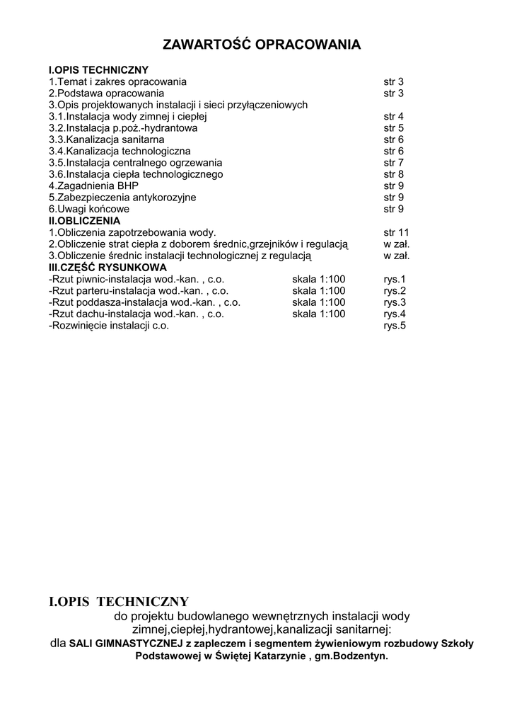 ZAWARTOŚĆ OPRACOWANIA I.OPIS TECHNICZNY 1.Temat i zakres opracowania 2.Podstawa opracowania 3.Opis projektowanych instalacji i sieci przyłączeniowych 3.1.Instalacja wody zimnej i ciepłej 3.2.Instalacja p.poŜ.-hydrantowa 3.3.Kanalizacja sanitarna 3.4.Kanalizacja technologiczna 3.5.Instalacja centralnego ogrzewania 3.6.Instalacja ciepła technologicznego 4.Zagadnienia BHP 5.Zabezpieczenia antykorozyjne 6.Uwagi końcowe II.OBLICZENIA 1.Obliczenia zapotrzebowania wody. 2.Obliczenie strat ciepła z doborem średnic,grzejników i regulacją 3.Obliczenie średnic instalacji technologicznej z regulacją III.CZĘŚĆ RYSUNKOWA -Rzut piwnic-instalacja wod.-kan. , c.o. skala 1:100 -Rzut parteru-instalacja wod.-kan. , c.o. skala 1:100 -Rzut poddasza-instalacja wod.-kan. , c.o. skala 1:100 -Rzut dachu-instalacja wod.-kan. , c.o. skala 1:100 -Rozwinięcie instalacji c.o. str 3 str 3 str 4 str 5 str 6 str 6 str 7 str 8 str 9 str 9 str 9 str 11 w zał. w zał. rys.1 rys.2 rys.3 rys.4 rys.5 I.OPIS TECHNICZNY do projektu budowlanego wewnętrznych instalacji wody zimnej,ciepłej,hydrantowej,kanalizacji sanitarnej: dla SALI GIMNASTYCZNEJ z zapleczem i segmentem Ŝywieniowym rozbudowy Szkoły Podstawowej w Świętej Katarzynie , gm.Bodzentyn. 1. Temat i zakres opracowania 1.1.Tematem niniejszego opracowania są wewnętrzne instalacje wodociągowokanalizacyjne , instalacje hydrantowe , instalacje wody ciepłej dla celów gospodarczobytowych i zespołu Ŝywieniowego w funkcji pomieszczeń projektowanego budynku w dowiązaniu do istniejącej i nowoprojektowanej infrastruktury technicznej. 1.2.Dla segmentu Ŝywieniowego przewidziano kanalizację technologiczną z podczyszczeniem ścieków w separatorze tłuszczów zintegrowanego z osadnikiem i lokalizacją na odrębnym przyłączu kanalizacyjnym. 1.3.Wentylacja mechaniczna i wspomagająca, która ma zapewnić odpowiednie warunki sanitarno-higieniczne i cieplne w budynku w.g.odrębnego opracowania. 1.4.Zapewnienie ciepła dla centralnego ogrzewania , przygotowanie ciepłej wody uŜytkowej dla segmentu Ŝywieniowego i ciepła technologicznego dla potrzeb wentylacji mechanicznej z własnej kotłowni olejowej-odrębne opracowanie. 1.5.Opomiarowanie zuŜycia wody zimnej z zabudową wodomierza i izolatora przepływów zwrotnych uwzględniające zapotrzebowanie wody dla potrzeb całego obiektu przeniesiono do klatki schodowej cz.piwnic projektowanego budynku. 2. Podstawa opracowania Podstawę niniejszego opracowania stanowią: • podkłady architektoniczno-budowlane; • zagospodarowanie terenu z uzbrojeniem zewnętrznym; • uzgodnienia międzybranŜowe; • obowiązujące normy i przepisy; 3. Opis projektowanych instalacji. 3.1 Instalacja wody zimnej i ciepłej. Dla potrzeb sanitarnych ogólno-bytowych zaplecza sali gimnastycznej i porządkowych projektuje się instalację wody zimnej zasilaną z wewnętrznej instalacji wodociągowej dn-50. Opomiarowanie poboru wody dla całego obiektu z montaŜem izolatora przepływów zwrotnych pod spocznikiem klatki schodowej piwnic projektowanego zaplecza i segmentu Ŝywieniowego. Z uwagi na rozbudowę przewidziano dobór i montaŜ nowego zestawu wodomierzowego typu WS-10-dn40 i izolatora przepływów zwrotnych klasy BA-295dn50 Zapotrzebowanie wody do celów gospodarczo-bytowych i poŜarowych podano w części obliczeniowej. W obiekcie nowoprojektowanym woda zimna doprowadzona będzie do: • przyborów i urządzeń węzłów sanitarnych oraz segmentu Ŝywieniowego; • podgrzewaczy pojemnościowych elektrycznych z przygotowaniem wody ciepłej dla węzłów sanitarnych; • kotłowni olejowej dla przygotowania c.c.w. zasilającego segment Ŝywieniowy; Instalację wody naleŜy wykonać z rur stalowych ocynkowanych wg PN-80/H-74200-S-tc-12bx połączonych na gwint z kształtkami staliwnymi ocynkowanymi uszczelnione sznurem konopnym bądź teflonem. Przewody montować na typowych podwieszeniach i podparciach zamocowanych do elementów konstrukcyjnych budynku. Przewody rozprowadzające – stalowe - wody zimnej po montaŜu i przeprowadzonych próbach na ciśnienie 0,9 MPa naleŜy zaizolować ciepłochronnie i przeciwroszeniowo otuliną z pianki polietylenowej gr.13 mm. Odcinki pionów sprowadzających z zaworem odcinającym kulowym na odejściu zaprojektowano z rur PP łączonych poprzez zgrzewanie moŜliwie kryte w przegrodach i elementach wykończeniowych. Przewody te dodatkowo izolować otuliną gr.6 lub 9mm i mocować w obejmach z umoŜliwieniem swobodnego przemieszczania się w bruzdach i przestrzeniach przegród. Połączenia z elementami o róŜnym materiale z pomocą specjalnych złączek przejściowych. Wszystkie przejścia przez przegrody oddzielające strefy poŜarowe w wykonaniu szczelnym w rurach osłonowych , a dodatkowo w miejscach przejść rur z tworzyw sztucznych w wykonaniu zabezpieczenia przeciwpoŜarowego. Instalację tę przed zakryciem i po montaŜu poddać próbie ciśnieniowej z przytrzymaniem wody na co najmniej 48h. Armatura odcinająca kulowa. Wszystkie przyłącza ze złączką do węŜa zabezpieczone izolatorami przepływów zwrotnych klasy HA. Przed oddaniem do eksploatacji instalację wody naleŜy zdezynfekować i dokładnie przepłukać. W węzłach sanitarnych pobór wody zimnej i ciepłej poprzez: - baterie stojące jednouchwytowe bądź ścienne z wylewką w przypadku kabin prysznicowych; - zawory pisuarowe ze spłukiwaniem „opóźnionym mechanicznie”; - dla potrzeb porządkowych zawory ze złączką do węŜa –chromowane z końcówką „antyrozbryzgową”.; - baterie ścienne dla korytek do mycia nóg z montaŜem na ca 50cm nad posadzką. W segmencie Ŝywieniowym podejścia wody zimnej i ciepłej zakończyć na poziomie ca30cm nad posadzką zaworkami kątowymi dla umoŜliwienia podłączenia urządzeń technologicznych kuchni i zaplecza. Źródłem ciepłej wody uŜytkowej będą podgrzewacze elektryczne jednofazowe podumywalkowe indywidualne o pojemności 10-15 litrów i podgrzewac