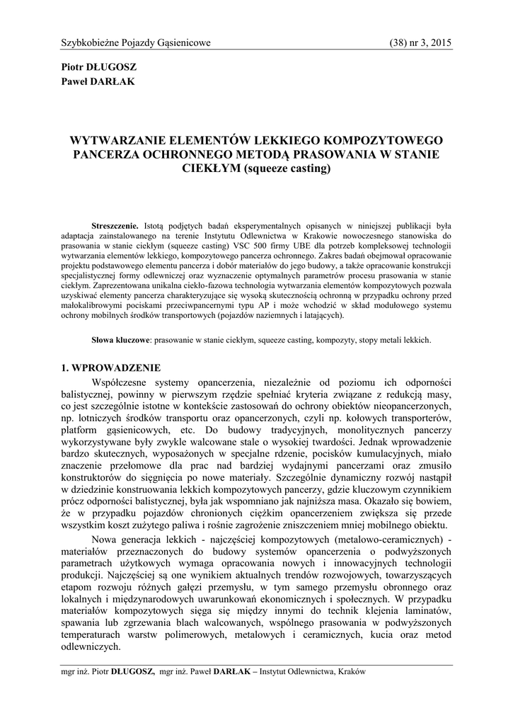 Szybkobieżne Pojazdy Gąsienicowe (38) nr 3, 2015 Piotr DŁUGOSZ Paweł DARŁAK WYTWARZANIE ELEMENTÓW LEKKIEGO KOMPOZYTOWEGO PANCERZA OCHRONNEGO METODĄ PRASOWANIA W STANIE CIEKŁYM (squeeze casting) Streszczenie. Istotą podjętych badań eksperymentalnych opisanych w niniejszej publikacji była adaptacja zainstalowanego na terenie Instytutu Odlewnictwa w Krakowie nowoczesnego stanowiska do prasowania w stanie ciekłym (squeeze casting) VSC 500 firmy UBE dla potrzeb kompleksowej technologii wytwarzania elementów lekkiego, kompozytowego pancerza ochronnego. Zakres badań obejmował opracowanie projektu podstawowego elementu pancerza i dobór materiałów do jego budowy, a także opracowanie konstrukcji specjalistycznej formy odlewniczej oraz wyznaczenie optymalnych parametrów procesu prasowania w stanie ciekłym. Zaprezentowana unikalna ciekło-fazowa technologia wytwarzania elementów kompozytowych pozwala uzyskiwać elementy pancerza charakteryzujące się wysoką skutecznością ochronną w przypadku ochrony przed małokalibrowymi pociskami przeciwpancernymi typu AP i może wchodzić w skład modułowego systemu ochrony mobilnych środków transportowych (pojazdów naziemnych i latających). Słowa kluczowe: prasowanie w stanie ciekłym, squeeze casting, kompozyty, stopy metali lekkich. 1. WPROWADZENIE Współczesne systemy opancerzenia, niezależnie od poziomu ich odporności balistycznej, powinny w pierwszym rzędzie spełniać kryteria związane z redukcją masy, co jest szczególnie istotne w kontekście zastosowań do ochrony obiektów nieopancerzonych, np. lotniczych środków transportu oraz opancerzonych, czyli np. kołowych transporterów, platform gąsienicowych, etc. Do budowy tradycyjnych, monolitycznych pancerzy wykorzystywane były zwykle walcowane stale o wysokiej twardości. Jednak wprowadzenie bardzo skutecznych, wyposażonych w specjalne rdzenie, pocisków kumulacyjnych, miało znaczenie przełomowe dla prac nad bardziej wydajnymi pancerzami oraz zmusiło konstruktorów do sięgnięcia po nowe materiały. Szczególnie dynamiczny rozwój nastąpił w dziedzinie konstruowania lekkich kompozytowych pancerzy, gdzie kluczowym czynnikiem prócz odporności balistycznej, była jak wspomniano jak najniższa masa. Okazało się bowiem, że w przypadku pojazdów chronionych ciężkim opancerzeniem zwiększa się przede wszystkim koszt zużytego paliwa i rośnie zagrożenie zniszczeniem mniej mobilnego obiektu. Nowa generacja lekkich - najczęściej kompozytowych (metalowo-ceramicznych) materiałów przeznaczonych do budowy systemów opancerzenia o podwyższonych parametrach użytkowych wymaga opracowania nowych i innowacyjnych technologii produkcji. Najczęściej są one wynikiem aktualnych trendów rozwojowych, towarzyszących etapom rozwoju różnych gałęzi przemysłu, w tym samego przemysłu obronnego oraz lokalnych i międzynarodowych uwarunkowań ekonomicznych i społecznych. W przypadku materiałów kompozytowych sięga się między innymi do technik klejenia laminatów, spawania lub zgrzewania blach walcowanych, wspólnego prasowania w podwyższonych temperaturach warstw polimerowych, metalowych i ceramicznych, kucia oraz metod odlewniczych. mgr inż. Piotr DŁUGOSZ, mgr inż. Paweł DARŁAK – Instytut Odlewnictwa, Kraków Piotr DŁUGOSZ, Paweł DARŁAK Metody odlewnicze są ekonomicznie najefektywniejszym ze sposobów nadawania końcowego kształtu wyrobom metalowym oraz metalowym materiałom kompozytowym. Dzięki nim można otrzymywać detale o skomplikowanych kształtach i rozwiniętej powierzchni. Podstawową wadą odlewów wytwarzanych tradycyjnymi technikami odlewniczymi w konfrontacji z elementami uzyskiwanymi w procesach przeróbki plastycznej, są ich niższe właściwości mechaniczne. Niedogodność ta jest spowodowana odlewniczą strukturą materiału (dużym rozmiarem ziaren, porowatością i innymi defektami). Ponadto, typowe wady powierzchniowe występujące w odlewach, takie jak naderwania i niespawy mogą przyczyniać się do powstawania pęknięć w strukturze odlewu podczas jego użytkowania, znacząco skracając jego żywotność. Odlewanie pod ciśnieniem, które cechuje się obecnością nadciśnienia służącego do szybkiego wypełnienia formy ciekłym metalem zyskuje obecnie duże znaczenie w ogólnej produkcji odlewów z metali lekkich. W technologii tej wykonuje się przede wszystkim odlewy w produkcji wieloseryjnej lub masowej, o skomplikowanych kształtach, cienkościennych ściankach, o masie nieprzekraczającej kilkanaście kilogramów [1]. Wykonuje się też coraz więcej precyzyjnych i odpowiedzialnych części maszyn, spełniających wyśrubowane kryteria wytrzymałościowe dyktowane między innymi przez przemysł lotniczy, motoryzacyjny oraz obronny. Odlewanie ciśnieniowe w porównaniu do grawitacyjnego jest procesem praktycznie bezodpadowym. Podstawową jednak wadą odlewnictwa ciśnieniowego jest jednostkowy koszt wykonania formy, zakładający opracowanie dokumentacji technicznej wraz z niezbędnymi rysunkami odwzorującymi kształt wyrobu i obliczeniami, konieczność stworzenia symulacji procesu wypełniania formy ciekłym metalem oraz skomplikowany proces budowy formy z pomocą zaawansowanych technik obróbki mechanicznej. Niekorzystną cechę odlewów ciśnieniowych stanowi brak ich odporności na podwyższoną temperaturę pracy z powodu tzw. porowatości gazowej, której pochodzenie związane jest z zamykaniem w objętości odlewu fazy gazowej (okluzji) na skutek najczęściej burzliwego, rzadziej warstwowego, przepływu stopu przez układ wlewowy i wnękę formy. Tak więc, parametrami decydującymi o poprawnej strukturze wewnętrznej odlewu są przede wszystkim: prędkość ewakuacji powietrza z wnęki formy, prędkość wypełnienia wnęki formy ciekłym metalem, czas narostu ciśnienia doprasowania oraz geometria komory wlewowej, układu wlewowego i odpowietrzającego [2]. Metodę prasowania w stanie ciekłym (ang