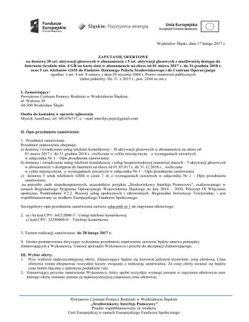 Wodzisław Śląski, dnia 17 lutego 2017 r. ZAPYTANIE OFERTOWE na dostawę 30 szt. aktywacji głosowych w abonamencie i 5 szt. aktywacji głosowych z możliwością dostępu do Internetu (średnio min. 4 GB na kartę sim) w abonamencie na okres od 01 marca 2017 r. do 31 grudnia 2018 r. oraz 5 szt. telefonów GSM do Punktów Dziennego Pobytu Środowiskowego i do Centrum Operacyjnego zgodnie z art. 4 ust. 8 ustawy z dnia 29 stycznia 2004 r. Prawo zamówień publicznych (tekst jednolity: Dz. U. z 2015 r., poz. 2164 ze zm.) I. Zamawiający: Powiatowe Centrum Pomocy Rodzinie w Wodzisławiu Śląskim, ul. Wałowa 30 44-300 Wodzisław Śląski Osoba do kontaktu w sprawie ogłoszenia Myrcik Aureliusz, tel. 601476737, e—mail [email protected] II. Opis przedmiotu zamówienia: 1. Przedmiot zamówienia Przedmiot zamówienia obejmuje: a) dostawę i świadczenie usług telefonii komórkowej - 30 aktywacji głosowych w abonamencie na okres od 01 marca 2017 r. do 31 grudnia 2018 r., rozliczane w cyklu miesięcznym, o wymaganiach zawartych w załączniku Nr 1 – Opis przedmiotu zamówienia. b) dostawę i świadczenie usług telefonii komórkowej i usług bezprzewodowej transmisji danych - 5 aktywacji głosowych w abonamencie z dostępem do Internetu na okres od 01.03.017 r. do 31.12.2018 r., rozliczane w cyklu miesięcznym, o wymaganiach zawartych w załączniku Nr 1 – Opis przedmiotu zamówienia c) dostawę 5 sztuk telefonów GSM w cenie 1 zł, o wymaganiach zawartych w załączniku Nr 1 – Opis przedmiotu zamówienia, na potrzeby osób niepełnosprawnych, uczestników projektu „Środowiskowy Interfejs Pomocowy”, realizowanego w ramach Regionalnego Programu Operacyjnego Województwa Śląskiego na lata 2014 – 2020, Priorytet IX Włączenie społeczne, Poddziałanie 9.2.2. Rozwój usług społecznych i zdrowotnych -Regionalne Inwestycje Terytorialne, i jest współfinansowany ze środków Europejskiego Funduszu Społecznego. Szczegółowy opis przedmiotu zamówienia zawiera załącznik nr 1 do zapytania ofertowego. 2. a) i b) kod CPV: 64212000-5 - Usługi telefonii komórkowej c) kod CPV: 32250000-0 – Telefony komórkowe 3. Termin realizacji zamówienia: do 28 lutego 2017 r. 4. Istotne postanowienia dotyczące wykonania przedmiotu zamówienia zawierać będzie umowa pomiędzy Zamawiającym a Wykonawcą. Umowę sporządzi Wykonawca i prześle do akceptacji Zamawiającego. III. Wybór oferty. 1. Przy wyborze najkorzystniejszej oferty, Zamawiający będzie się kierował jedynym kryterium: ceną ofertową. Cena ofertowa winna obejmować wszystkie koszty związane z realizacją zamówienia. Za cenę oferty uważać się będzie cenę brutto (łącznie z należnym podatkiem vat). 2. Zamawiający przyzna zamówienie Wykonawcy, który spełni wszystkie wymogi zawarte w zapytaniu ofertowym oraz którego oferta zostanie uznana za najkorzystniejszą (najniższa cena ofertowa). Powiatowe Centrum Pomocy Rodzinie w Wodzisławiu Śląskim „Środowiskowy Interfejs Pomocowy” Projekt współfinansowany ze środków Unii Europejskiej w ramach Europejskiego Funduszu Społecznego IV. Forma i termin płatności 1. Zapłata za usługi telekomunikacyjne będzie dokonana w cyklu miesięcznym, po przedstawieniu przez Wykonawcę faktury Vat za świadczone usługi. Zapłata za aparaty telefoniczne będzie dokonana na podstawie faktury Vat przedstawionej przez dostawcę sprzętu. 2. W związku z centralizacją rozliczania podatku vat faktury powinny być wystawiane w następujący sposób: Powiat Wodzisławski ul. Bogumińska 2 44-300 Wodzisław Śląski NIP: 647-21-75-218 Powiatowe Centrum Pomocy Rodzinie w Wodzisławiu Śląskim ul. Wałowa 30, 44-300 Wodzisław Śląski V. Dane dotyczące złożenia oferty 1. Ofertę należy sporządzić na formularzu oferty lub według takiego samego schematu, zgodnie z załącznikiem nr 2 do zapytania ofertowego. Do oferty należy dołączyć dokumentację techniczną oferowanego modelu telefonu, która potwierdzi, że oferowana dostawa odpowiada minimalnym wymaganiom Zamawiającego określonym w punkcie 2 załącznika nr 1 - Opis przedmiotu zamówienia, z podaniem nazwy producenta i modelu telefonu, pozwalającą zweryfikować jego parametry ze wszystkimi minimalnymi parametrami technicznymi wymaganymi przez Zamawiającego. Z dołączonej dokumentacji musi wynikać w sposób jednoznaczny, że oferowany telefon spełnia minimalne parametry techniczne wymagane przez Zamawiającego. Załączona dokumentacja techniczna oferowanego sprzętu może mieć formę folderów, opisów technicznych, kart sprzętu itp. 2. Oferta musi być podpisana przez osobę/y upoważnione do reprezentowania Wykonawcy. 3. Miejsce, sposób i termin składania ofert Ofertę należy złożyć w jeden z następujących sposobów: - osobiście w siedzibie Zamawiającego tj. Powiatowym Centrum Pomocy Rodzinie w Wodzisławiu Śląskim przy ul. Wałowej 30, 44-300 Wodzisław Śląski, w sekretariacie (pokój nr 11), - za pośrednictwem poczty na adres Zamawiającego: Powiatowe Centrum Pomocy Rodzinie w Wodzisławiu Śląskim, ul. Wałowa 30, 44-300 Wodzisław Śląski, - elektronicznie na adres mailowy [email protected] – skan podpisanej oferty zgodnie z wymogami zapytania ofertowego; zaleca się przesłać ofertę za pośrednictwem poczty na adres Zamawiającego, j.w. 4. Termin składania ofert upływa w dniu 23.02.2017 roku, o godzinie 10.00 …......................…………………………. (dyrektor PCPR w Wodzisławiu Śląskim) Załączniki: Załącznik 1 Załącznik 2 Opis przedmiotu zamówienia Formularz ofertowy Powiatowe Centrum Pomocy Rodzinie w Wodzisławiu Śląskim „Środowiskowy Interfejs Pomocowy” Projekt współfinansowany ze środków Unii Europejskiej w ramach Europejskiego Funduszu Społecznego