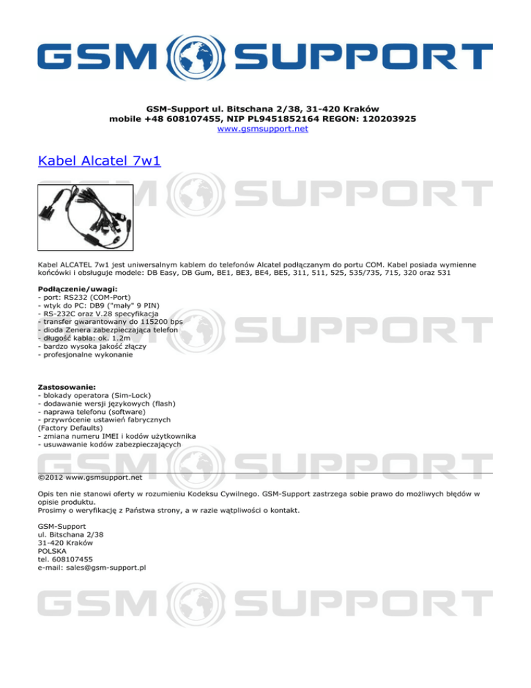 Kabel ALCATEL 7w1 jest uniwersalnym kablem do telefonów Alcatel podłączanym do portu COM. Kabel posiada wymienne