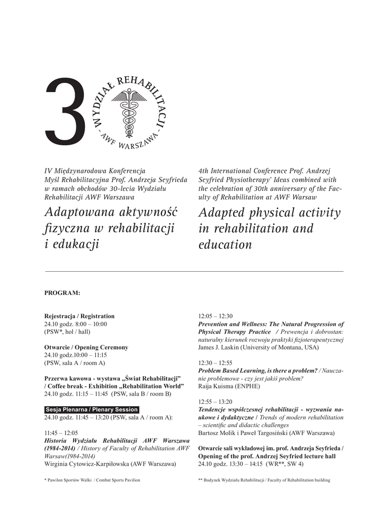 IV Międzynarodowa Konferencja Myśl Rehabilitacyjna Prof. Andrzeja Seyfrieda w ramach obchodów 30-lecia Wydziału Rehabilitacji AWF Warszawa 4th International Conference Prof. Andrzej Seyfried Physiotherapy’ Ideas combined with the celebration of 30th anniversary of the Faculty of Rehabilitation at AWF Warsaw Adaptowana aktywność fizyczna w rehabilitacji i edukacji Adapted physical activity in rehabilitation and education PROGRAM: Rejestracja / Registration 24.10 godz. 8:00 – 10:00 (PSW*, hol / hall) Otwarcie / Opening Ceremony 24.10 godz.10:00 – 11:15 (PSW, sala A / room A) Przerwa kawowa - wystawa „Świat Rehabilitacji” / Coffee break - Exhibition „Rehabilitation World” 24.10 godz. 11:15 – 11:45 (PSW, sala B / room B) Sesja Plenarna / Plenary Session 24.10 godz. 11:45 – 13:20 (PSW, sala A / room A): 11:45 – 12:05 Historia Wydziału Rehabilitacji AWF Warszawa (1984-2014) / History of Faculty of Rehabilitation AWF Warsaw(1984-2014) Wirginia Cytowicz-Karpiłowska (AWF Warszawa) * Pawilon Sportów Walki / Combat Sports Pavilion 12:05 – 12:30 Prevention and Wellness: The Natural Progression of Physical Therapy Practice / Prewencja i dobrostan: naturalny kierunek rozwoju praktyki fizjoterapeutycznej James J. Laskin (University of Montana, USA) 12:30 – 12:55 Problem Based Learning, is there a problem? / Nauczanie problemowe - czy jest jakiś problem? Raija Kuisma (ENPHE) 12:55 – 13:20 Tendencje współczesnej rehabilitacji - wyzwania naukowe i dydaktyczne / Trends of modern rehabilitation – scientific and didactic challenges Bartosz Molik i Paweł Targosiński (AWF Warszawa) Otwarcie sali wykładowej im. prof. Andrzeja Seyfrieda / Opening of the prof. Andrzej Seyfried lecture hall 24.10 godz. 13:30 – 14:15 (WR**, SW 4) ** Budynek Wydziału Rehabilitacji / Faculty of Rehabilitation building Obiad / Lunch 24.10 godz. 14:15 – 15:00 (PSW, sala B / room B) Warsztat I / Workshop I godz. 15:00 – 17:00 (PSW, sala A / room A) Problem Based Learning (PBL) Dr. Raija Kuisma Sesja 1 / Session 1 Fizjoterapia w traumatologii sportowej i ortopedii / Physiotherapy in sports traumatology and orthopedics 24.10 godz. 15:00 – 17:00 (WR, sala 60 / room 60) 15:00 – 15:10 Wpływ technik mobilizacyjnych wg terapii konceptu OMT Kaltenborn-Evjenth na zakres ruchomości oraz bolesność u pacjentów z koksartrozą / Effect of mobilization techniques by therapy OMT Kaltenborn-Evjenth Concept on range of motion and pain in patients with coxarthrosis Krzysztof Dudziński, Karolina Załoga (AWF Warszawa) 15:10 – 15:20 Mobilizacja stawu promieniowo-łokciowego bliższego i jej wpływ na funkcję ręki po złamaniu przedramienia / Mobilization of superior radioulnar joint and its influence on the function of the hand after fracture of the forearm Marek Woszczak (UJK Kielce), Katarzyna Syrewicz (Pabianickie Centrum Rehabilitacji), Marek Kiljański (WSIiU Łódź) 15:20 – 15:30 Skuteczność korekcji stóp płaskich za pomocą plastra Kinesio Taping na podstawie badania podoskopowego i analizy chodu / The effectiveness of flat foot correction by means of Kinesio Taping based on podoscopic examination and gait analysis Justyna Leszczewska (AWF Warszawa) 15:30 – 15:40 Zjawisko tenodezy w aspekcie funkcji poślizgowej ścięgna zginacza długiego kciuka / Tenodesis phenomenon in aspect of gliding function of FPL tendon Marek Pieniążek,, Piotr Krężołek, Jakub Szczechowicz, Tomasz Róg, Krzysztof Jamka, Andrzej Markowski (AWF Kraków) 15:40 – 15:50 Kończyna górna - co może fizjoterapeuta a co ortopeda? / Upper limb – what physiotherapist and orthopedist can? Leszek Romanowski, Ewa Bręborowicz, Maciej Bręborowicz (UM Poznań) 15:50 – 16:00 Autokorekcja krzywizn kręgosłupa w płaszczyźnie strzałkowej / Active self-correction of sagittal spinal curvatures Paulina Pawłowska (AWF Warszawa), Dariusz Czaprowski, Dominik Sitarski (OSW Olsztyn) 16:00 – 16:10 Efekty zastosowania gipsów hamujących u dzieci z idiopatycznym chodem na palcach / Inhibiting casts effect in children with idiopathic too walking Małgorzata Domagalska-Szopa, Andrzej Szopa, Krzysztof Bąk, Weronika Gallert-Kopyto, Ryszard Plinta (Śląski UM Katowice) 16:10 – 16:20 Rehabilitacja w dysfunkcjach narządu ruchu u pacjentów z chorobą nowotworową / Rehabilitation of dysfunctional muscle- skeletal systems in patients with malignant diseas Piotr Majcher (UM Lublin) 16:20 – 17:00 Dyskusja / Discussion Sesja 2 / Session 2 Diagnostyka funkcjonalna w fizjoterapii / Functional diagnostics in physiotherapy 24.10 godz. 15:00 – 17:00 (WR, sala 57 / room 57) 15:00 – 15:10 Ocena symetrii w chodzie swobodnym człowieka / Assessing the asymmetry of free gait in healthy subjects Katarzyna Kaczmarczyk, Ida Wiszomirska, Michał Wychowański, Michał Błażkiewicz, Lidia Ilnicka, Andrzej Wit (AWF Warszawa) 15:10 – 15:20 Odchylenia od prawidłowego wzorca chodu u dzieci z niskostopniowa skoliozą / Gait patterns disturbances in children with scoliosis Andrzej Szopa, Małgorzata Domagalska-Szopa, Weronika Gallert-Kopyto, Ryszard Plinta (Śląski UM Katowice) 15:20 – 15:30 Zasadność uwzględniania lordozy szyjnej w diagnostyce posturalnej, z naciskiem na jej relacje kątowe z pozostałymi krzywiznami kręgosłupa / The reasonableness of considering the cervical lordosis in the postural diagnosis, with emphasis on its relations with the remainder of the angular curvatures of the spine Ryszard Muskała (PHU Terapia Ruchowa) 15:30 – 15:40 Ocena termowizyjna zabiegów z wykorzystaniem metody dr Ackermanna, na wybranych przypadkach / Thermal Evaluation of treatments using the methods of Dr. Ackermann, in selected cases Bartosz Wysoczański (AWF Warszawa) 15:40 – 15:50 Ocena podstawowych i złożonych czynności życia codziennego pacjentów przed i po 80 r.ż. po endoprotezoplastyce stawu biodrowego / The assessment of the basic and complex activities of everyday life of patients before and after the age of