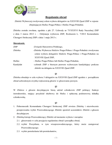 Regulamin obrad Zbiórki Wyborczej zwoływanej celem wyboru delegatów na XXXVIII Zjazd ZHP w rejonie obejmującym Hufiec Praga-Północ i Hufiec Praga-Południe. Zbiórka została zwołana, zgodnie z pkt 27. Uchwały nr 75/XXXVI Rady Naczelnej ZHP z dnia 3 marca 2013 r. – Ordynacja wyborcza ZHP, Rozkazem L. 7/2013 Komendanta Chorągwi Stołecznej ZHP z dnia 1 maja 2013 r. Słowniczek: ZHP -Związek Harcerstwa Polskiego, Zbiórka -Zbiórka Wyborcza Hufców Praga-Północ i Praga-Południe zwoływana celem wyboru delegatów Hufców Praga-Północ i Praga-Południe na XXXVIII Zjazd ZHP, Hufiec - Hufiec Praga-Północ lub Hufiec Praga-Południe, Kandydat -członek ZHP z biernym prawem wyborczym kandydujący podczas zbiórki na delegata na XXXVIII Zjazd ZHP. §1 Zbiórka obraduje w celu wyboru 3 delegatów na XXXVIII Zjazd ZHP zgodnie z porządkiem obrad uchwalonym zwykłą większością głosów w głosowaniu jawnym. §2 W Zbiórce z głosem decydującym biorą udział członkowie ZHP pełniący funkcje instruktorskie, mający przydział służbowy do Hufca i opłaconą podstawową składkę członkowską. §3 1. Pełnomocnik Komendanta Chorągwi Stołecznej ZHP otwiera Zbiórkę i niezwłocznie przeprowadza wybór Przewodniczącego Zbiórki spośród uczestników Zbiórki z głosem decydującym. 2. Zbiórką kieruje Przewodniczący Zbiórki od momentu wyboru i zarządza: 2.1. głosowanie w celu przyjęcia regulaminu obrad i porządku obrad, 2.2. wybór Prezydium, w tym wiceprzewodniczącego, który może zastępować Przewodniczącego. 2.3. wybór protokolanta lub protokolantów, -1- 2.4. wybór komisji wyborczej, 2.5. wybór komisji skrutacyjnej po zamknięciu listy kandydatów. 3. Do kompetencji Przewodniczącego Zbiórki należy: 3.1. prowadzenie obrad Zbiórki zgodnie z przyjętym porządkiem obrad, 3.2. udzielanie głosu uczestnikom Zbiórki z głosem decydującym i Kandydatom, 3.3. udzielanie głosu obserwatorom i zaproszonym gościom, 3.4. przestrzeganie rzeczowości i czasu trwania wypowiedzi, 3.5. zarządzanie głosowania, 3.6. ogłaszanie przerw w obradach, 3.7. przyjmowanie zgłoszeń do prezentacji i dyskusji oraz ustalanie kolejności mówców, 3.8. liczenie głosów podczas głosowań, z wyłączeniem głosowań dotyczących wyboru delegatów na Zjazd ZHP. 4. Do obowiązków Przewodniczącego należy niezwłoczne udzielenie głosu: 4.1. Pełnomocnikowi Komendanta Chorągwi Stołecznej na jego wniosek lub na wniosek uczestnika Zbiórki z głosem decydującym w celu przedstawienia interpretacji przepisów regulujących obrady Zbiórki lub zgłoszenia zastrzeżeń co do przebiegu obrad. 4.2. w sprawie zgłoszenia wniosku formalnego przez uczestnika Zbiórki z głosem decydującym. §4 1. Członkowie komisji wybierają ze swojego grona przewodniczących komisji, którzy kierują pracami komisji. 2. Do kompetencji komisji skrutacyjnej należy: 2.1. organizacja głosowania, w tym przygotowanie kart do głosowania zawierających w porządku alfabetycznym nazwisko, imię i stopień instruktorski Kandydatów, 2.2. przeprowadzenie głosowania, 2.3. obliczanie głosów, 2.4. sporządzenie protokołu z każdego głosowania, 2.5. ogłoszenie wyników głosowania. 3. Do kompetencji komisji wyborczej należy: 3.1. rejestracja Kandydatów, 3.2. ustalenie czy Kandydaci mają bierne prawo wyborcze, -2- 3.3. przygotowanie krótkich charakterystyk wszystkich Kandydatów, 3.4. sporządzenie listy kandydatów w porządku alfabetycznym, 3.5. przedstawienie uczestnikom Zbiórki listy Kandydatów 3.6. sporządzenie protokołu z prac komisji. §5 1. Kandydatów zgłaszają do Komisji wyborczej uczestnicy Zbiórki z głosem decydującym. 2. Zgłoszenie powinno zawierać: 2.1. imię, nazwisko i stopień instruktorski, przydział służbowy i pełnioną przez Kandydata funkcję, 2.2. krótką charakterystykę Kandydata, 2.3. pisemną zgodę Kandydata. 3. Czas prezentacji Kandydata nie powinien przekraczać 5 minut. 4. Decyzję w sprawie ewentualnego przedłużenia czasu wystąpienia podejmuje Przewodniczący Zbiórki. §6 1. Wniosek formalny może dotyczyć w szczególności: 1.1. zmiany porządku obrad, 1.2. zmiany regulaminu obrad, 1.3. zakończenia lub przerwania dyskusji, 1.4. zamknięcia listy Kandydatów, 1.5. zarządzenia przerwy w obradach, 1.6. udzielenia głosu Pełnomocnikowi Komendanta Chorągwi Stołecznej w celu przedstawienia interpretacji przepisów regulujących obrady Zbiórki lub zgłoszenia zastrzeżeń co do przebiegu obrad 2. Zgłaszający wniosek formalny ma prawo krótko uzasadnić ten wniosek. 3. Przewodniczący Zbiórki niezwłocznie zarządza głosowanie wniosku formalnego po wysłuchaniu jednego głosu zgłaszającego zdanie odrębne. §7 Wszelkich zmian w regulaminie i porządku obrad w czasie trwania zbiórki dokonuje się zwykłą większością głosów. -3- Porządek obrad 1. Otwarcie Zbiórki przez Pełnomocnika Komendanta Chorągwi Stołecznej ZHP 2. Wybór Przewodniczącego Zbiórki. 3. Wybór protokolantów. 4. Przyjęcie regulaminu obrad Zbiórki 5. Wybór prezydium Zbiórki 6. Przyjęcie porządku obrad Zbiórki 7. Wybór komisji wyborczej 8. Sprawy organizacyjne 9. Informacja komisji wyborczej o trybie i terminie zgłaszania kandydatów na delegatów (do końca przerwy) 15 minut przerwy 10. Powitanie gości i uczestników Zbiórki 11. Wprowadzenie sztandarów hufców i odśpiewanie hymnu ZHP 12. Informacja komisji wyborczej o zgłoszonych kandydatach 13. Wybór komisji skrutacyjnej 14. Prezentacja kandydatów 15. Informacja komisji skrutacyjnej o trybie sposobie wyboru delegatów. Informacja pełnomocnika Komendanta Chorągwi Stołecznej ZHP 16. Głosowanie w sprawie wyboru delegatów. przerwa 17. Sprawozdanie komisji skrutacyjnej o wyborze delegatów. 18. Dyskusja programowa 19. Wystąpienie komendantów hufców 20. Zakończenie obrad zbiórki 21. Odprowadzenie sztandarów, zakończenie zbiórki w kręgu. -4-
