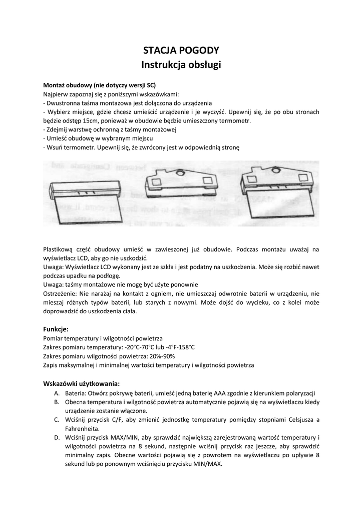 STACJA POGODY Instrukcja obsługi Montaż obudowy (nie dotyczy wersji SC) Najpierw zapoznaj się z poniższymi wskazówkami: - Dwustronna taśma montażowa jest dołączona do urządzenia - Wybierz miejsce, gdzie chcesz umieścić urządzenie i je wyczyść. Upewnij się, że po obu stronach będzie odstęp 15cm, ponieważ w obudowie będzie umieszczony termometr. - Zdejmij warstwę ochronną z taśmy montażowej - Umieść obudowę w wybranym miejscu - Wsuń termometr. Upewnij się, że zwrócony jest w odpowiednią stronę Plastikową część obudowy umieść w zawieszonej już obudowie. Podczas montażu uważaj na wyświetlacz LCD, aby go nie uszkodzić. Uwaga: Wyświetlacz LCD wykonany jest ze szkła i jest podatny na uszkodzenia. Może się rozbić nawet podczas upadku na podłogę. Uwaga: taśmy montażowe nie mogę być użyte ponownie Ostrzeżenie: Nie narażaj na kontakt z ogniem, nie umieszczaj odwrotnie baterii w urządzeniu, nie mieszaj różnych typów baterii, lub starych z nowymi. Może dojść do wycieku, co z kolei może doprowadzić do uszkodzenia ciała. Funkcje: Pomiar temperatury i wilgotności powietrza Zakres pomiaru temperatury: -20°C-70°C lub -4°F-158°C Zakres pomiaru wilgotności powietrza: 20%-90% Zapis maksymalnej i minimalnej wartości temperatury i wilgotności powietrza Wskazówki użytkowania: A. Bateria: Otwórz pokrywę baterii, umieść jedną baterię AAA zgodnie z kierunkiem polaryzacji B. Obecna temperatura i wilgotność powietrza automatycznie pojawią się na wyświetlaczu kiedy urządzenie zostanie włączone. C. Wciśnij przycisk C/F, aby zmienić jednostkę temperatury pomiędzy stopniami Celsjusza a Fahrenheita. D. Wciśnij przycisk MAX/MIN, aby sprawdzić największą zarejestrowaną wartość temperatury i wilgotności powietrza na 8 sekund, następnie wciśnij przycisk raz jeszcze, aby sprawdzić minimalny zapis. Obecne wartości pojawią się z powrotem na wyświetlaczu po upływie 8 sekund lub po ponownym wciśnięciu przycisku MIN/MAX. E. Wciśnij przycisk „RESET”, aby wyczyścić zapisane dane. Przycisk „C/F” służy do zmiany jednostki pomiaru (stopnie Celsjusza lub Fahrenheita) Wymiana baterii: Po wymianie baterii, zastosuj się do wskazówek z rysunku i odpowiedniej kolejności wykonania poszczególnych czynności. Pamiętaj o umieszczeniu uszczelki, tak aby urządzenie było wodoodporne.