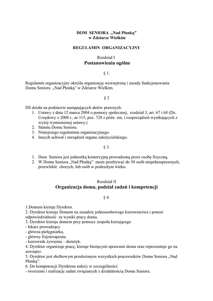 DOM SENIORA „Nad Płonką” w Zdziarze Wielkim REGULAMIN ORGANIZACYJNY Rozdział I Postanowienia ogólne § 1. Regulamin organizacyjny określa organizację wewnętrzną i zasady funkcjonowania Domu Seniora „Nad Płonką” w Zdziarze Wielkim. §2 DS działa na podstawie następujących aktów prawnych: 1. Ustawy z dnia 12 marca 2004 o pomocy społecznej, rozdział 3, art. 67 i 68 (Dz. Urzędowy z 2008 r., nr 115, poz. 728 z późn. zm. i rozporządzeń wynikających z wyżej wymienionej ustawy.) 2. Statutu Domu Seniora. 3. Niniejszego regulaminu organizacyjnego. 4. Innych uchwał i zarządzeń organu założycielskiego. § 3. 1. Dom Seniora jest jednostką komercyjną prowadzoną przez osobę fizyczną. 2. W Domu Seniora „Nad Płonką” może przebywać do 58 osób niepełnosprawnych, przewlekle chorych, lub osób w podeszłym wieku. Rozdział II Organizacja domu, podział zadań i kompetencji § 4. 1.Domem kieruje Dyrektor. 2. Dyrektor kieruje Domem na zasadzie jednoosobowego kierownictwa i ponosi odpowiedzialność za wyniki pracy domu. 3. Dyrektor kieruje domem przy pomocy zespołu kierującego - lekarz prowadzący - główna pielęgniarka, - główny fizjoterapeuta, - kierownik żywienia – dietetyk. 4. Dyrektor organizuje pracę, kieruje bieżącymi sprawami domu oraz reprezentuje go na zewnątrz. 5. Dyrektor jest służbowym przełożonym wszystkich pracowników Domu Seniora „Nad Płonką”. 6. Do kompetencji Dyrektora należy w szczególności: - tworzenie i realizacje zadań związanych z działalnością Domu Seniora. - realizację polityki kadrowej i dbałość o należyty dobór pracowników, - zapewnienie należytej kontroli i realizacji określonych zadań i przestrzegania przepisów prawa, - nawiązywanie i rozwiązywanie stosunków pracy z pracownikami Domu. 7. Do wyłącznej kompetencji Dyrektora Domu należy: - wydawanie zarządzeń wewnętrznych, instrukcji i regulaminów regulujących organizację pracy Domu, - reprezentowanie Domu na zewnątrz, w tym składanie oświadczeń woli w imieniu Domu, - załatwianie spraw zgłaszanych w trybie skarg i wniosków § 5. Zadania organizacyjne pracowników Domu Seniora „Nad Płonką” . Do podstawowych zadań poszczególnych pracowników należy: 1. Organizowanie i zapewnienie podstawowych usług na rzecz mieszkańców w zakresie opiekuńczo – terapeutycznym. 2. Zwracanie szczególnej uwagi na pracę pracowników pierwszego kontaktu. 3. Inicjowanie i prowadzenie zajęć terapeutycznych. 4. Inspirowanie i organizowanie imprez rozrywkowych i sportowych. 5. Aktywizacja mieszkańców w pracy indywidualnej i grupowej. 6. Mobilizowanie do samodzielnego wyboru. 7. Dbanie o wygląd mieszkańców i Ich pokoi. 8. Dbanie o estetyczny wystrój domu. 9. Pomoc w indywidualnych pracach mieszkańców. 10. Obsługa i pomoc przy posiłkach. 11. Współpraca z rodziną mieszkańca. 12. Współpraca ze środowiskiem lokalnym. 13. Prowadzenie dokumentacji indywidualnej mieszkańców oraz dokumentacji dotyczącej Domu ( regulaminów i kroniki Domu). 14. Współpraca w zakresie opieki zdrowotnej mieszkańców. 15. Odpowiedzialność za stan higieniczny domu. 16. Tworzenie i realizację indywidualnych planów opieki dla każdego mieszkańca. 17. Społeczność terapeutyczna Domu, w której w skład wchodzą mieszkańcy jak i pracownicy Domu na zasadach otwartej komunikacji, tworzą demokratyczne stosunki na wszystkich poziomach funkcjonowania i opiera się to na zasadach współpracy i współodpowiedzialności za realizowane cele.
