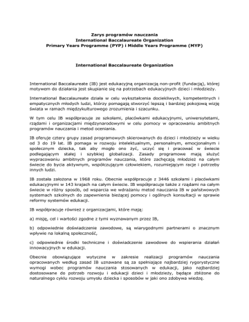 Zarys programów nauczania International Baccalaureate Organization Primary Years Programme (PYP) i Middle Years Programme (MYP) International Baccalaureate Organization International Baccalaureate (IB) jest edukacyjną organizacją non-profit (fundacją), której motywem do działania jest skupianie się na potrzebach edukacyjnych dzieci i młodzieży. International Baccalaureate działa w celu wykształcenia dociekliwych, kompetentnych i empatycznych młodych ludzi, którzy pomagają stworzyć lepszą i bardziej pokojową wizję świata w ramach międzykulturowego zrozumienia i szacunku. W tym celu IB współpracuje ze szkołami, placówkami edukacyjnymi, uniwersytetami, rządami i organizacjami międzynarodowymi w celu pomocy w opracowaniu ambitnych programów nauczania i metod oceniania. IB oferuje cztery grupy zasad programowych skierowanych do dzieci i młodzieży w wieku od 3 do 19 lat. IB pomaga w rozwoju intelektualnym, personalnym, emocjonalnym i społecznym dziecka, tak aby mogło ono żyć, uczyć się i pracować w świecie podlegającym stałej i szybkiej globalizacji. Zasady programowe mają służyć wypracowaniu ambitnych programów nauczania, które zachęcają młodzież na całym świecie do bycia aktywnym, współczującym człowiekiem, rozumiejącym racje i potrzeby innych ludzi. IB została założona w 1968 roku. Obecnie współpracuje z 3446 szkołami i placówkami edukacyjnymi w 143 krajach na całym świecie. IB współpracuje także z rządami na całym świecie w różny sposób, od wsparcia we wdrażaniu metod nauczania IB w państwowych systemach szkolnych do zapewnienia bieżącej pomocy i ogólnych konsultacji w sprawie reformy systemów edukacji. IB współpracuje również z organizacjami, które mają: a) misję, cel i wartości zgodne z tymi wyznawanym przez IB, b) odpowiednie doświadczenie zawodowe, są wiarygodnymi partnerami o znacznym wpływie na lokalną społeczność, c) odpowiednie środki techniczne i doświadczenie zawodowe do wspierania działań innowacyjnych w edukacji. Obecnie obowiązujące wytyczne w zakresie realizacji programów nauczania opracowanych według zasad IB uznawane są za spełniające najbardziej rygorystyczne wymogi wobec programów nauczania stosowanych w edukacji, jako najbardziej dostosowane do potrzeb rozwoju i edukacji dzieci i młodzieży, będące zbliżone do naturalnego cyklu rozwoju umysłu dziecka i sposobów w jaki ono zdobywa wiedzę. 1. Programy nauczania dla grup młodszych (PYP) – od 3 do 10 roku życia. Wszystkie zajęcia prowadzone w placówce muszą być realizowane zgodnie z obowiązującą filozofią International Baccalaureate Organization w odniesieniu do dzieci młodszych (PYP). PYP wspomaga społeczny, fizyczny, emocjonalny i intelektualny rozwój dziecka. Dzieci chłoną wiedzę jak gąbki wodę i są w stanie przyswoić wiedzę w bardzo szybkim tempie. Kształcenie podstawowych umiejętności w połączeniu z naciskiem na odkrywanie i rozumienie otaczającego świata jest warunkiem koniecznym dla uzyskania maksymalnego efektu w nauce. Wszystkie programy stworzone wg zasad PYP uwzględniają pięć podstawowych elementów: wiedza, pomysły, umiejętności, postawy i działania. Nauczanie prowadzone jest w oparciu o transdyscyplinarne zagadnienia, które przenikają się z kolejnymi tematami przechodząc przez kolejne obszary badawcze. Obszary badawcze PYP Zajęcia według metody PYP realizowane są w następujących obszarach badawczych: 1. Kim jesteśmy? 2. Nasze miejsce w czasie i przestrzeni. 3. Jak wyrażamy siebie? 4. Jak jest zorganizowany świat? 5. Jak my jesteśmy zorganizowani? 6. Nasza planeta. W ciągu roku dzieci trzy- i czteroletnie zapoznają się z czterema obszarami badawczymi, natomiast dzieci starsze realizują po jednym projekcie w każdym obszarze. Czas trwania jednego projektu to 4-6 tygodni. Podczas realizacji każdego projektu nauczyciele szczególną uwagę przywiązują do tego, aby nowe ćwiczenia i zadania bazowały na wiadomościach i umiejętnościach posiadanych już przez dzieci. Na podstawie tzw. zadania wstępnego przeprowadzanego na początku projektu badawczego nauczyciel orientuje się, jaki jest aktualny poziom wiedzy i umiejętności dzieci i na tej podstawie może modyfikować swe zamierzenia edukacyjne. Działania w ramach danego projektu kończą się zawsze wykonaniem przez dziecko zadania podsumowującego, pozwalającego uczniom, nauczycielom i rodzicom ocenić postępy dziecka. Bardzo ważny jest udział rodziców w procesie edukacyjnym, są oni zachęcani do przygotowania zadań wstępnych i sumujących, do wspomagania nauczycieli w realizacji projektu i do udziału w spotkaniach dziecko-rodzice-nauczyciel. Projekty badawcze są przygotowywane wspólnie przez cały zespół nauczycieli. Ustalana jest główna idea projektu, ścieżki badawcze, zadania do ocen: wstępnych, formujących i sumujących. Wszystkie obszary badawcze odpowiadają na podstawowy zestaw pojęć pogrupowany w następujące działy: - Forma: Jakie to jest? - Funkcja: Jak to działa? - Przyczynowość: Dlaczego tak jest? - Zmiana: Jak to się zmienia? - Połączenie: Jak to jest połączone z innymi? - Podejście: Jakie są inne punkty widzenia? - Odpowiedzialność: Co jest naszym obowiązkiem? - Refleksja: Skąd wiemy, że rozumiemy? Pojęcia są prezentowane w postaci kluczowych kwestii. Pytania, stosowane elastycznie przez nauczycieli i uczestników zajęć przy planowaniu projektu badawczego, pozwalają nadać kształt danego projektu badawczego, wraz z ostatecznym ustaleniem jego celu. W trakcie procesu realizacji projektów badawczych z uwagi na transdyscyplinarność i holistyczność procesu uczenia według zasad PYP uczestnicy zajęć kształcą szereg umiejętności. Umiejętności te obejmują: - umiejętności komunikacyjne: Słuchanie, mówienie, czytanie, pisanie, prezentacje, komunikacja niewerbalna; - umiejętności badawcze: Formułowanie pytań, czynienie ob