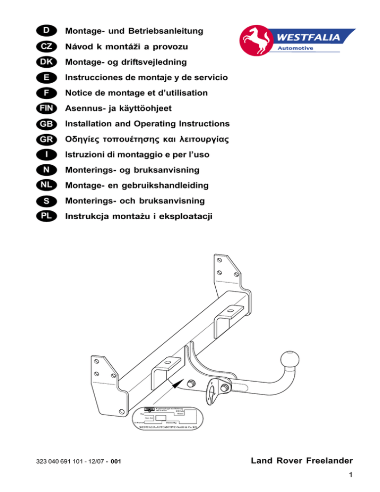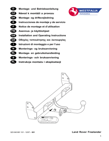 D Montage- und Betriebsanleitung CZ Návod&k&montáži&a&provozu DK Montage- og driftsvejledning E Instrucciones de montaje y de servicio F Notice de montage et d’utilisation FIN Asennus- ja käyttöohjeet GB Installation and Operating Instructions GR Οδηγ%ε' τοπου-τηση' και λειτουργ%α' I Istruzioni di montaggio e per l’uso N Monterings- og bruksanvisning NL Montage- en gebruikshandleiding S Monterings- och bruksanvisning PL Instrukcja&montażu&i&eksploatacji 323 040 691 101 - 12/07 - 001 Land Rover Freelander 1 D Lieferumfang der Anhängevorrichtung CZ Objem&dodání&tažného&zařízení DK Anhængertrækkets leveringsomfang 1 1x 2 1x 3 1x GR Περιεχ6µενο του πακ-του τη' σφαιρικ:' κεφαλ:' ζε<ξη' µε στ:ριγµα I Dotazione del gancio di traino 4 2x M12x75 (10.9) N Leveringsomfang for tilhengerfestet 5 2x M12x1,25x80 (10.9) 6 6x M10x25 (10.9) 7 6x 13x24x2,5 8 6x 10,5x21x2 9 2x M12 (10) 10 1x E Volumen de suministro del enganche F Pièces comprises dans la fourniture de l’attelage FIN Vetokoukun toimituksen sisältö GB Scope of delivery of towing hitch NL S PL 2 Leveringsomvang trekhaak Dragkrokens leveransspecifikation Zakres&dostawy&haka holowniczego D Lieferbare Ersatzteilumfänge Anhängevorrichtung CZ Dodatelné&náhradní&díly&tažného&zařízení DK Reservedele, der kan leveres til anhængertrækket E Volumen de piezas de repuesto suministrables del enganche F Pièces de rechange disponibles pour l’attelage FIN Vetokoukun toimitettavissa olevat varaosat GB Available spare parts for towing hitch GR Κατ?λογο' τ@ν διαυ-σιµ@ν ανταλλακτικµν τη' σφαιρικ:' κεφαλ:' ζε<ξη' µε στ:ριγµα I Pezzi di ricambio disponibili per il gancio di traino N Reservedeler for tilhengerfestet som kan leveres NL S PL Leverbare reserve-onderdelen t.b.v. trekhaak Dragkrokens reservdelsspecifikationer Zakres&dostarczanych&części&zamiennych&haka&holowniczego 3 4 Der Freiraum nach Anhang VII, Abbildung 30 der Richtlinie 94/20/EG ist zu gewährleisten. Frirummet skal overholdes iht. bilag VII, fig. 30 i direktiv 94/20/EF. Volný&prostor&ve&smyslu&Přílohy&VII,&obr.&30&Směrnice&č.&94/20/EG&musí&být&zaručen. Debe garantizarse el espacio libre, conforme al anexo VII, figura 30 de la directiva comunitaria CE/94/20. La zone de dégagement doit être garantie conformément à l'annexe VII, illustration 30 de la directive 94/ 20/CE. FIN Vapaa tila on taattava direktiivin 94/20/EY liitteen VII, kuvan 30 mukaisesti. GB The clearance specified in appendix VII, diagram 30 of guideline 94/20/EG must be guaranteed. GR Πρ#πει να εξασφαλ.ζεται ο ελε2θερο4 χ6ρο4 σ27φωνα 7ε το παρ9ρτη7α VII, εικ?να 30 τη4 Οδηγ.α4 94/ 20/EΟΚ. H Biztosítani&kell&a&94/20/EK&irányelv&szerinti,&VII.&számú&függelék&30.&ábrában&jelölt&szabad&teret. IDeve essere garantito lo spazio libero secondo l'allegato VII, figura 30 della direttiva 94/20/CE. NFrirommet etter tillegg VII, avbilding 30 i direktiv 94/20/EEC skal overholdes. NL De tussenruimte conform supplement VII, afbeelding 30 van de richtlijn 94/20/EG moet in acht worden genomen. PGarantir a zona livre, conforme Anexo VII, gráfico 30 da Norma 94/20/CE. PL Należy&zagwarantować&przestrzeń&swobodną&według&załącznika&VII,&ilustracja&30&wytycznej&94/20/EG&. SSpelrummet enligt bilaga VII, figur 30 i riktlinje 94/20/EG skall garanteras. SLO - Zagotoviti&zračnost&po&priklopu&VII,&slika&30,&smernice&94/20/EG&. SK Volný&priestor&v&zmysle&Prílohy&VII,&obr.&30&Smernice&č.&94/20/EG&musí&byť&zaručený. TR 94/20/EG Yönetmeliði, Ek VII, Resim 30'da belirtilen serbest alan býrakýlmalýdýr. Dbei zulässigem Gesamtgewicht des Fahrzeuges DK ved tilladt samlet vægt for køretøjet CZ při&celkové&přípustné&hmotnosti&vozidla Econ peso total autorizado del vehículo Fpour poids total en charge autorisé du véhicule FIN ajoneuvon suurimmalla sallitulla kokonaispainolla GB at laden weight of the vehicle GR για το επιτρεπτ? 7ικτ? β9ρο4 του οχN7ατο4 H a&jármű&megengedett&össztömege&esetén Iper un peso complessivo ammesso del veicolo Nved kjøretøyets tillatte totalvekt NL bij toelaatbaar totaal gewicht van het voertuig Pcom o peso total permitido do veículo PL przy&dopuszczalnym&ciężarze&całkowitym&pojazdu Svid fordonets tillåtna totalvikt SLO - pri&dovoljeni&skupni&teži&vozila SK pri&celkovej&prípustnej&hmotnosti&vozidla TR Taþýtýn azami toplam aðýrlýðýnda DDK CZ EF- 5 D Anhängevorrichtung (Kupplungskugel mit Halterung) ohne Elektrosatz Hersteller: WESTFALIA-AUTOMOTIVE GmbH Westfalia-Bestell - Nr.: 323 040 Genehmigungsnummer nach Richtlinie 94/20/EG: e13 00-0553 Klasse: A50-X Technische Daten : Typ: 323 040 maximaler D-Wert: 11,75 kN maximale Stützlast:140 kg Verwendungsbereich: Fahrzeughersteller: Rover Modell: Land Rover Freelander Allgemeine Hinweise: Für den Fahrbetrieb sind die Angaben des Fahrzeugherstellers bzgl. Anhängelast und Stützlast maßgebend, wobei die Werte der Anhängevorrichtung nicht überschritten werden dürfen. Die Anhängevorrichtung dient zum Ziehen von Anhängern, welche mit Zugkugelkupplungen ausgerüstet sind und zum Betrieb von Lastenträgern, welche für die Montage auf der Kupplungs-kugel zugelassen sind. Artfremde Benutzung ist verboten. Der Betrieb muß den Straßen-verhältnissen angepaßt erfolgen. Beim Betrieb verändern sich die Fahreigenschaften des Fahrzeuges. Die Betriebsanleitung des Fahrzeugherstellers ist zu beachten. Bei Fahrzeugen mit Einparkhilfe können nach Montage der Anhängevorrichtung Fehlfunktionen auftreten, da Teile (Kugelstange, Kupplungskugel) im Erfassungsbereich der Sensoren liegen könnten. In diesem Fall sollte der Erfassungsbereich angepasst oder die Einparkhilfe deaktiviert werden. Bei Verwendung von Anhängevorrichtungen mit abnehmbaren bzw. schwenkbaren Kugelstangen ist eine Fe
